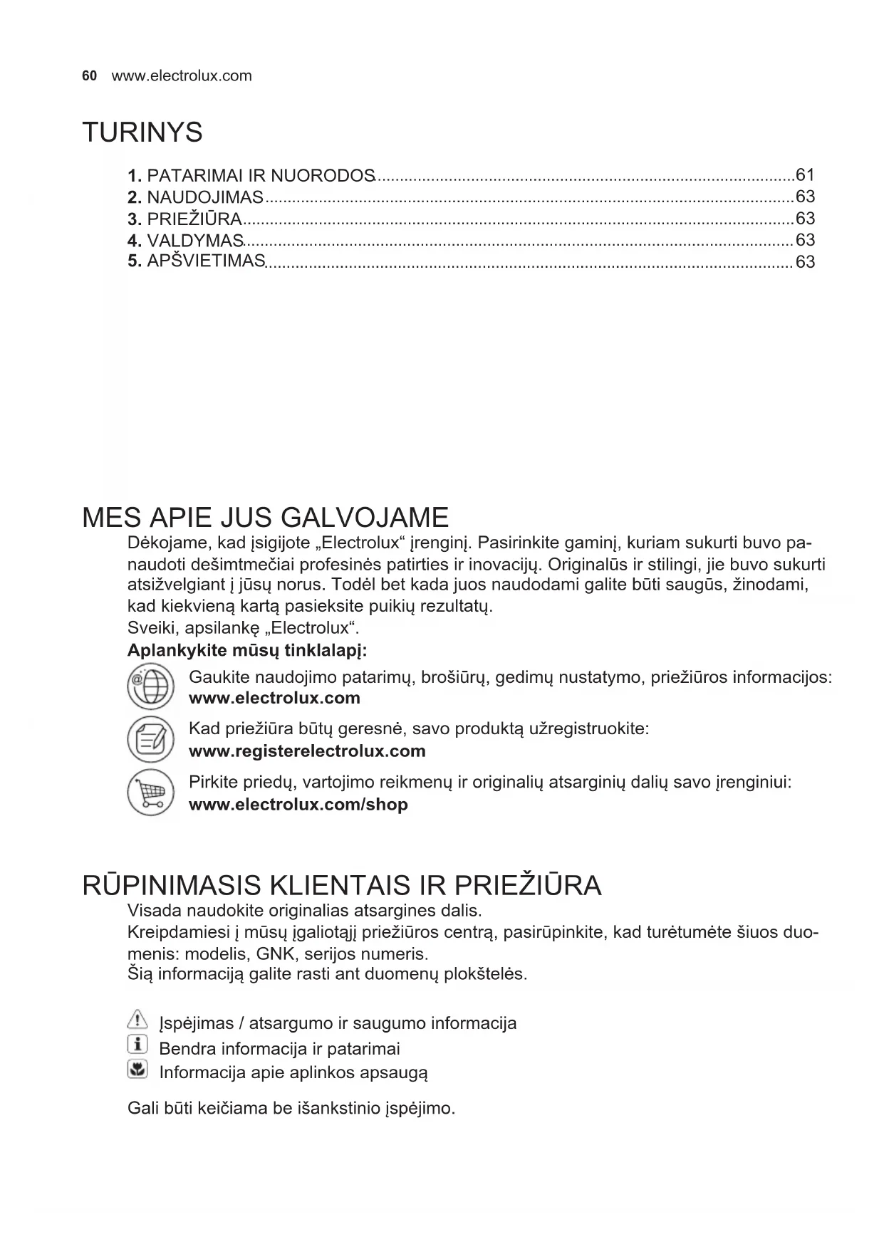 Dėkojame, kad įsigijote „Electrolux“ įrenginį. Pasirinkite gaminį, kuriam sukurti buvo pa- naudoti dešimtmečiai profesinės patirties ir inovacijų. Originalūs ir stilingi, jie buvo sukurti atsižvelgiant į jūsų norus. Todėl bet kada juos naudodami galite būti saugūs, žinodami, kad kiekvieną kartą pasieksite puikių rezultatų. Sveiki, apsilankę „Electrolux“. Aplankykite mūsų tinklalapį: Gaukite naudojimo patarimų, brošiūrų, gedimų nustatymo, priežiūros informacijos: www.electrolux.com Kad priežiūra būtų geresnė, savo produktą užregistruokite: www.registerelectrolux.com Pirkite priedų, vartojimo reikmenų ir originalių atsarginių dalių savo įrenginiui: www.electrolux.com/shop RŪPINIMASIS KLIENTAIS IR PRIEŽIŪRA Visada naudokite originalias atsargines dalis. Kreipdamiesi į mūsų įgaliotąjį priežiūros centrą, pasirūpinkite, kad turėtumėte šiuos duo- menis: modelis, GNK, serijos numeris. Šią informaciją galite rasti ant duomenų plokštelės. Įspėjimas / atsargumo ir saugumo informacija Bendra informacija ir patarimai Informacija apie aplinkos apsaugą Gali būti keičiama be išankstinio įspėjimo.61 LITHUANIAN