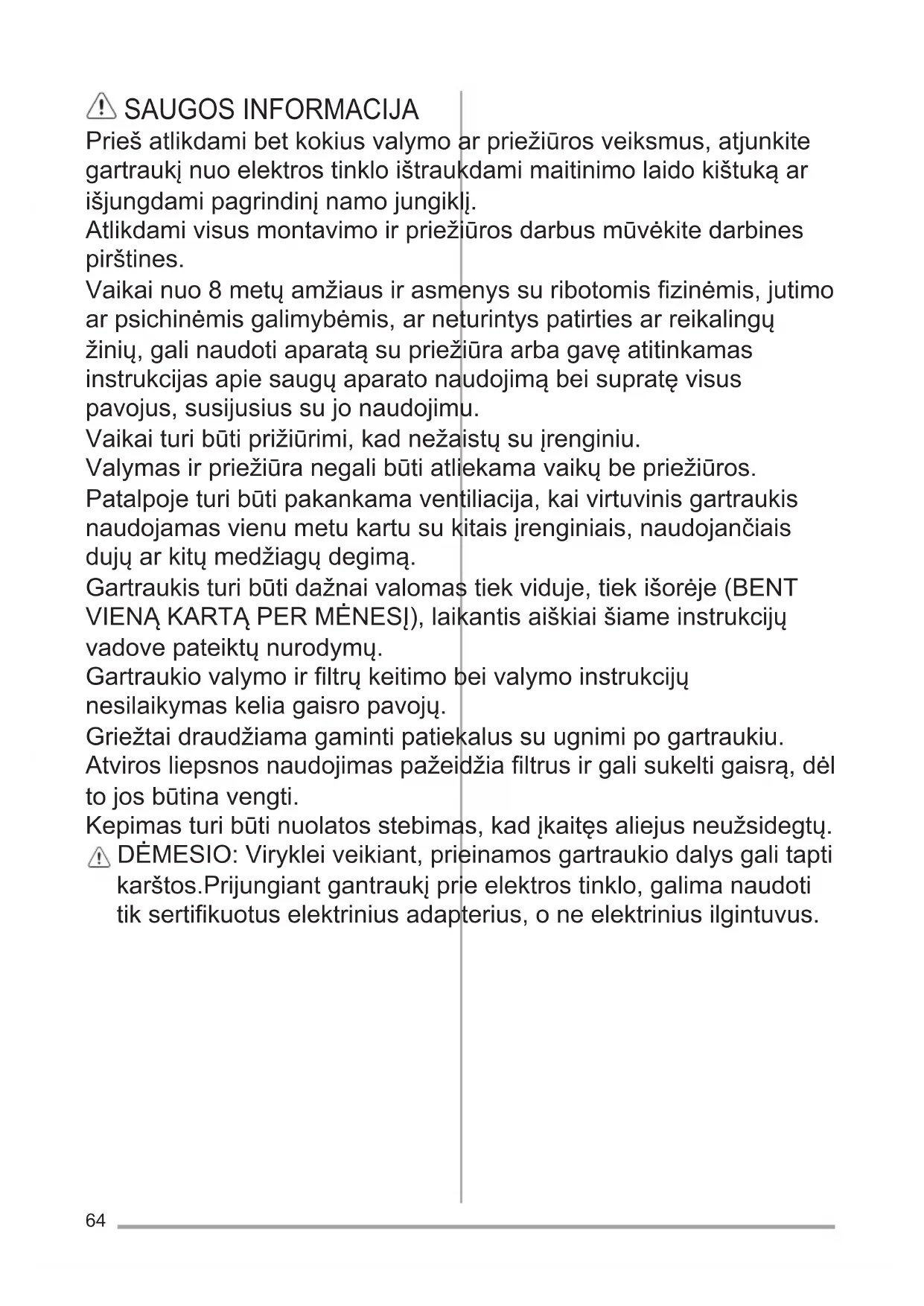 iesūkšanasjauda. APGAISMOJUMS Gaisanosūcējsiraprīkotsarapgaismošanas sistēmu,kaspamatojasuzLEDtehnoloģiju. LEDnodrošinaoptimāluapgaismošanu,kasilgst 10reizesvairākpartradicionālajāmspuldzītēm unļaujietaupīt90%elektriskāsenerģijas. Uzmanību!NeskatītiespatiešouzLED gaismām. Nomainīšanaigrieztiesuztehniskās apkalpošanasservisu.64 SAUGOSINFORMACIJA Priešatlikdamibetkokiusvalymoarpriežiūrosveiksmus,atjunkite gartraukįnuoelektrostinkloištraukdamimaitinimolaidokištukąar išjungdamipagrindinįnamojungiklį. Atlikdamivisusmontavimoirpriežiūrosdarbusmūvėkitedarbines pirštines. Vaikainuo8metųamžiausirasmenyssuribotomiszinėmis,jutimo arpsichinėmisgalimybėmis,arneturintyspatirtiesarreikalingų žinių,galinaudotiaparatąsupriežiūraarbagavęatitinkamas instrukcijasapiesaugųaparatonaudojimąbeisupratęvisus pavojus,susijusiussujonaudojimu. Vaikaituribūtiprižiūrimi,kadnežaistųsuįrenginiu. Valymasirpriežiūranegalibūtiatliekamavaikųbepriežiūros. Patalpojeturibūtipakankamaventiliacija,kaivirtuvinisgartraukis naudojamasvienumetukartusukitaisįrenginiais,naudojančiais dujųarkitųmedžiagųdegimą. Gartraukisturibūtidažnaivalomastiekviduje,tiekišorėje(BENT VIENĄKARTĄPERMĖNESĮ),laikantisaiškiaišiameinstrukcijų vadovepateiktųnurodymų. Gartraukiovalymoirltrųkeitimobeivalymoinstrukcijų nesilaikymaskeliagaisropavojų. Griežtaidraudžiamagamintipatiekalussuugnimipogartraukiu. Atvirosliepsnosnaudojimaspažeidžialtrusirgalisukeltigaisrą,dėl tojosbūtinavengti. Kepimasturibūtinuolatosstebimas,kadįkaitęsaliejusneužsidegtų. DĖMESIO:Virykleiveikiant,prieinamosgartraukiodalysgalitapti karštos.Prijungiantgantraukįprieelektrostinklo,galimanaudoti tiksertifikuotuselektriniusadapterius,oneelektriniusilgintuvus.65 SAUGOSINSTRUKCIJOS Lemposkeitimuinaudokitetikšiųinstrukcijų vadoveesančiamepriežiūrosskyriujenurodytus lempųtipus. Dėmesio!Nejunkiteįrenginioprieelektros tinklo,koljisnėravisiškaisumontuotas. Griežtailaikykitėsvietinėsvaldžiospateiktų taisykliųdėlišmetamųdūmųtechniniųmatmenų irsaugumo. Įsiurbiamasorasnegalibūtiišleidžiamasį vamzdynąnaudojamądūmų,susidariusiųdėl dujųarkitųmedžiagųdegimo,išmetimui. Nenaudokite ir nepalikite gartraukio tinkamai nesumontavęlempų,nesrizikuojateelektros nutrenkimu. Niekuomet nenaudokite gartraukio tinkamai nesumontavęgrotelių! GartraukisJOKIAISBŪDAISnegalibūti naudojamas,kaipatrama,nebentaiškiai nurodytakitaip. Montavimui naudokite tik kartu su gaminiu gautustvirtinimovaržtus,ojeigujųnegavote, naudokitetinkamotipovaržtus.Naudokite tinkamoilgiovaržtus,kurisnurodytasMontavimo vadove.Iškilusdvejonėms,kreipkitėsįįgaliotą aptarnavimocentrąarpanašųkvalikuotą personalą. DĖMESIO!Netinkamaisumontavusvaržtus irkitastvirtinimodetalesnurodytasšiose instrukcijose,galikiltipavojųsuelektra. APLINKOS APSAUGA Atiduokiteperdirbtimedžiagas,pažymėtasšiuo ženklu .Išmeskitepakuotęįatitinkamąatliekų surinkimokonteinerį,kadjibūtųperdirbta. Padėkitesaugotiaplinkąbeižmoniųsveikatą ir surinkti bei perdirbti elektros ir elektronikos prietaisųatliekas.Neišmeskitešiuoženklu pažymėtųprietaisųkartusukitomisbuitinėmis atliekomis.Atiduokitešįgaminįįvietosatliekų surinkimopunktąarbasusisiekitesuvietnos savivaldybedėlpapildomosinformacijos. NAUDOJIMAS Sukurtos dvi gaubto naudojimo versijos: įtraukiamoji,kaioraspašalinamasįišorę ,ir ltruojamoji,kaivykdomavidinėororecirkuliacija