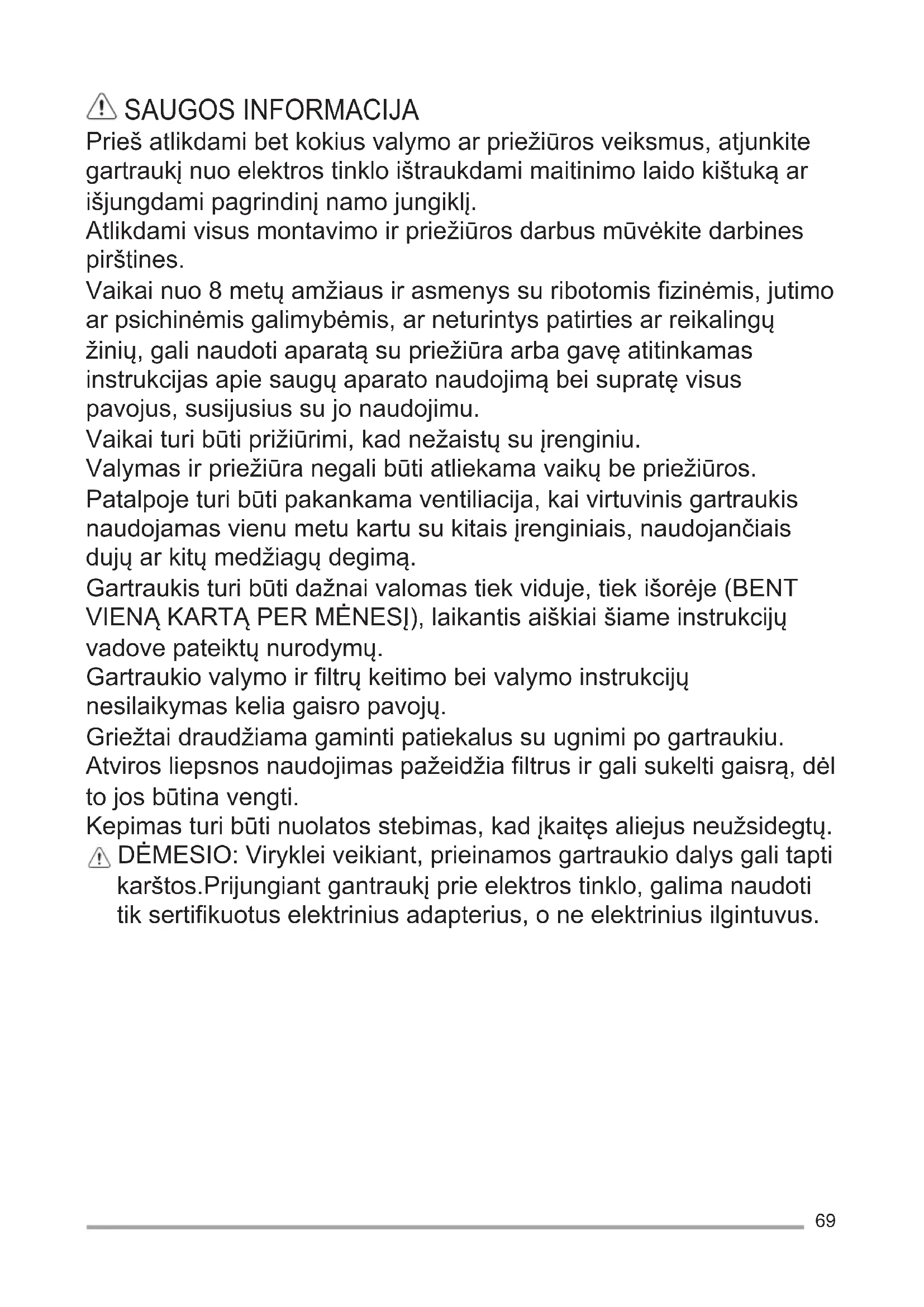 iesūkšanasjauda. APGAISMOJUMS Gaisanosūcējsiraprīkotsarapgaismošanas sistēmu,kaspamatojasuzLEDtehnoloģiju. LEDnodrošinaoptimāluapgaismošanu,kasilgst 10reizesvairākpartradicionālajāmspuldzītēm unļaujietaupīt90%elektriskāsenerģijas. Uzmanību!NeskatītiespatiešouzLED gaismām. Nomainīšanaigrieztiesuztehniskās apkalpošanasservisu.69 SAUGOSINFORMACIJA Priešatlikdamibetkokiusvalymoarpriežiūrosveiksmus,atjunkite gartraukįnuoelektrostinkloištraukdamimaitinimolaidokištukąar išjungdamipagrindinįnamojungiklį. Atlikdamivisusmontavimoirpriežiūrosdarbusmūvėkitedarbines pirštines. Vaikainuo8metųamžiausirasmenyssuribotomiszinėmis,jutimo arpsichinėmisgalimybėmis,arneturintyspatirtiesarreikalingų žinių,galinaudotiaparatąsupriežiūraarbagavęatitinkamas instrukcijasapiesaugųaparatonaudojimąbeisupratęvisus pavojus,susijusiussujonaudojimu. Vaikaituribūtiprižiūrimi,kadnežaistųsuįrenginiu. Valymasirpriežiūranegalibūtiatliekamavaikųbepriežiūros. Patalpojeturibūtipakankamaventiliacija,kaivirtuvinisgartraukis naudojamasvienumetukartusukitaisįrenginiais,naudojančiais dujųarkitųmedžiagųdegimą. Gartraukisturibūtidažnaivalomastiekviduje,tiekišorėje(BENT VIENĄKARTĄPERMĖNESĮ),laikantisaiškiaišiameinstrukcijų vadovepateiktųnurodymų. Gartraukiovalymoirltrųkeitimobeivalymoinstrukcijų nesilaikymaskeliagaisropavojų. Griežtaidraudžiamagamintipatiekalussuugnimipogartraukiu. Atvirosliepsnosnaudojimaspažeidžialtrusirgalisukeltigaisrą,dėl tojosbūtinavengti. Kepimasturibūtinuolatosstebimas,kadįkaitęsaliejusneužsidegtų. DĖMESIO:Virykleiveikiant,prieinamosgartraukiodalysgalitapti karštos.Prijungiantgantraukįprieelektrostinklo,galimanaudoti tiksertifikuotuselektriniusadapterius,oneelektriniusilgintuvus.70 SAUGOSINSTRUKCIJOS Lemposkeitimuinaudokitetikšiųinstrukcijų vadoveesančiamepriežiūrosskyriujenurodytus lempųtipus. Dėmesio!Nejunkiteįrenginioprieelektros tinklo,koljisnėravisiškaisumontuotas. Griežtailaikykitėsvietinėsvaldžiospateiktų taisykliųdėlišmetamųdūmųtechniniųmatmenų irsaugumo. Įsiurbiamasorasnegalibūtiišleidžiamasį vamzdynąnaudojamądūmų,susidariusiųdėl dujųarkitųmedžiagųdegimo,išmetimui. Nenaudokite ir nepalikite gartraukio tinkamai nesumontavęlempų,nesrizikuojateelektros nutrenkimu. Niekuomet nenaudokite gartraukio tinkamai nesumontavęgrotelių! GartraukisJOKIAISBŪDAISnegalibūti naudojamas,kaipatrama,nebentaiškiai nurodytakitaip. Montavimui naudokite tik kartu su gaminiu gautustvirtinimovaržtus,ojeigujųnegavote, naudokitetinkamotipovaržtus.Naudokite tinkamoilgiovaržtus,kurisnurodytasMontavimo vadove.Iškilusdvejonėms,kreipkitėsįįgaliotą aptarnavimocentrąarpanašųkvalikuotą personalą. DĖMESIO!Netinkamaisumontavusvaržtus irkitastvirtinimodetalesnurodytasšiose instrukcijose,galikiltipavojųsuelektra. APLINKOS APSAUGA Atiduokiteperdirbtimedžiagas,pažymėtasšiuo ženklu .Išmeskitepakuotęįatitinkamąatliekų surinkimokonteinerį,kadjibūtųperdirbta. Padėkitesaugotiaplinkąbeižmoniųsveikatą ir surinkti bei perdirbti elektros ir elektronikos prietaisųatliekas.Neišmeskitešiuoženklu pažymėtųprietaisųkartusukitomisbuitinėmis atliekomis.Atiduokitešįgaminįįvietosatliekų surinkimopunktąarbasusisiekitesuvietnos savivaldybedėlpapildomosinformacijos. NAUDOJIMAS Sukurtos dvi gaubto naudojimo versijos: įtraukiamoji,kaioraspašalinamasįišorę ,ir ltruojamoji,kaivykdomavidinėororecirkuliacija