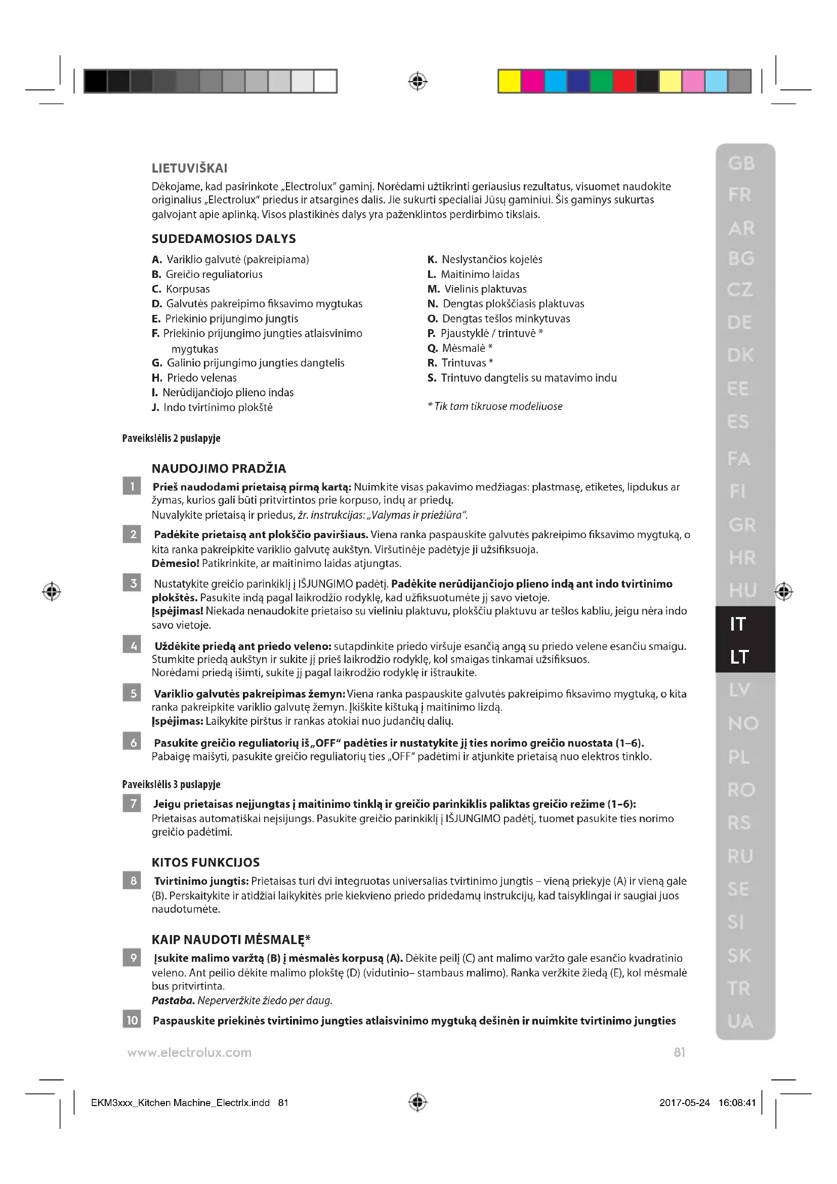 - Šis prietaisas skirtas naudoti tik buityje. Gamintojas neprisiima jokios atsakomybės už galimą žalą, padarytą netinkamai naudojant prietaisą arba naudojant jį ne pagal EKM3xxx_Kitchen Machine_Electrlx.indd 83 2017-05-24 16:08:4284 www.electrolux.com paskirtį.