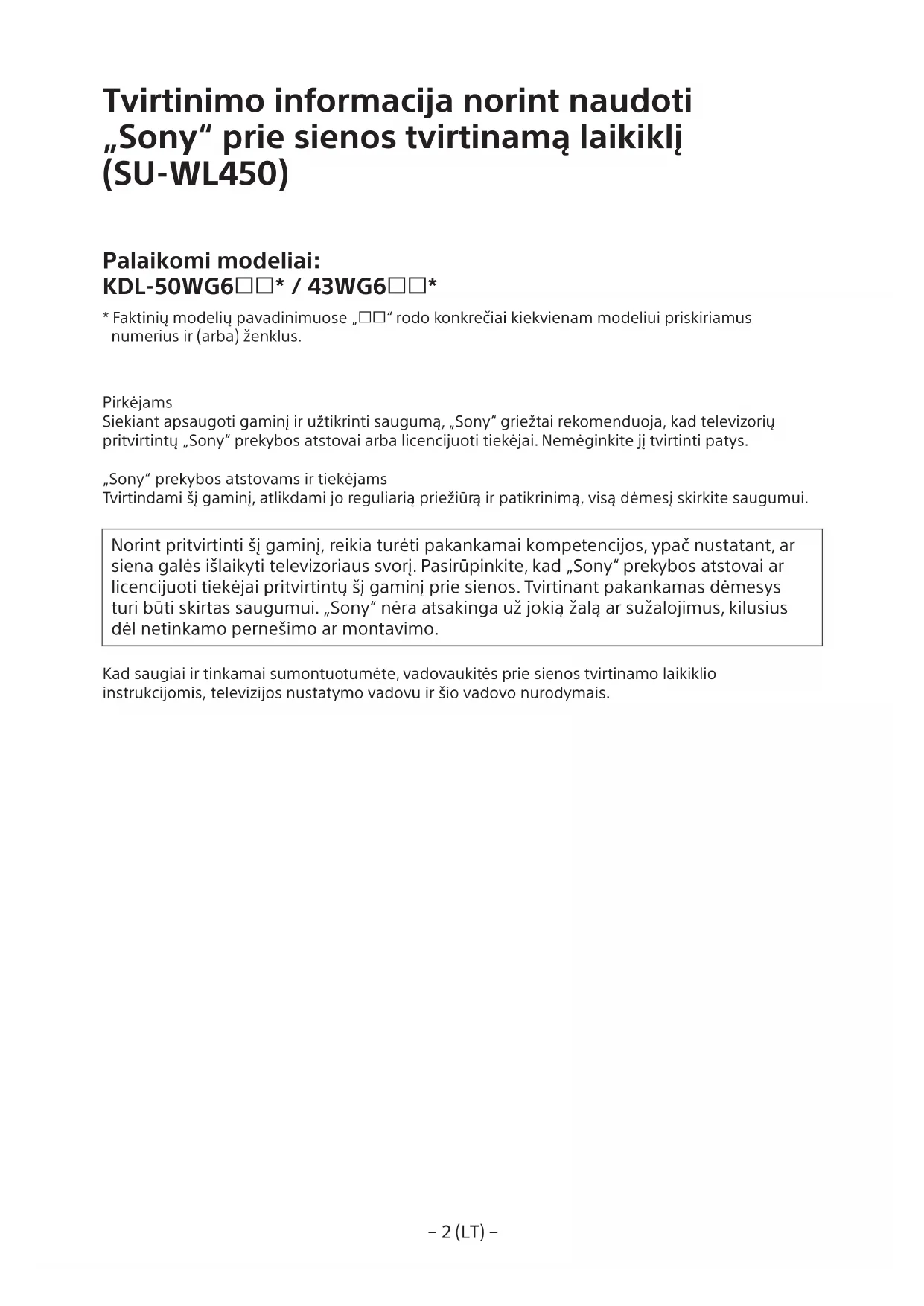 Norint pritvirtinti šj gaminji, reikia tureti pakankamai kompetencijos, ypač nustatant, ar siena gales išlaikyti televizoriaus svorj. Pasirupinkite, kad „Sony" prekybos atstovai ar licencijuoti tiekëjai pritvirtintu šj gaminj prie sienos. Tvirtinant pakankamas demesys turi buti skirtas saugumui. „Sony" néra atsakinga už jokižalā ar sužalojimus, kilusius del netinkamo pernesimo ar montavimo.
