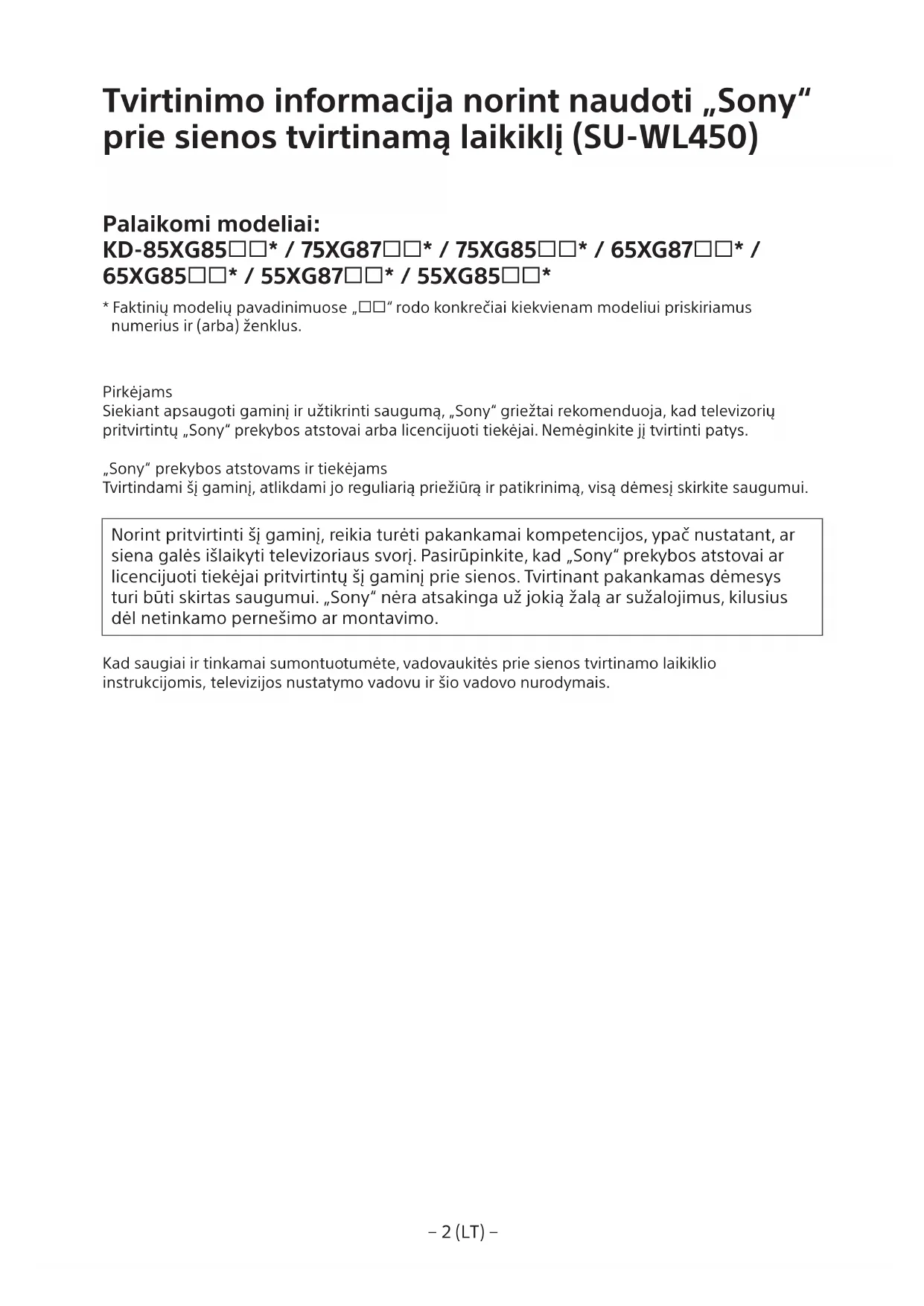 - Faktinių modelių pavadinimuose „“ rodo konkrečiai kiekvienam modeliui priskiriamus numerius ir (arba) ženklus. Pirkėjams Siekiant apsaugoti gaminį ir užtikrinti saugumą, „Sony“ griežtai rekomenduoja, kad televizorių pritvirtintų „Sony“ prekybos atstovai arba licencijuoti tiekėjai. Nemėginkite jį tvirtinti patys. „Sony“ prekybos atstovams ir tiekėjams Tvirtindami šį gaminį, atlikdami jo reguliarią priežiūrą ir patikrinimą, visą dėmesį skirkite saugumui. Norint pritvirtinti šį gaminį, reikia turėti pakankamai kompetencijos, ypač nustatant, ar siena galės išlaikyti televizoriaus svorį. Pasirūpinkite, kad „Sony“ prekybos atstovai ar licencijuoti tiekėjai pritvirtintų šį gaminį prie sienos. Tvirtinant pakankamas dėmesys turi būti skirtas saugumui. „Sony“ nėra atsakinga už jokią žalą ar sužalojimus, kilusius dėl netinkamo pernešimo ar montavimo. Kad saugiai ir tinkamai sumontuotumėte, vadovaukitės prie sienos tvirtinamo laikiklio instrukcijomis, televizijos nustatymo vadovu ir šio vadovo nurodymais.− 3 (LT) −
