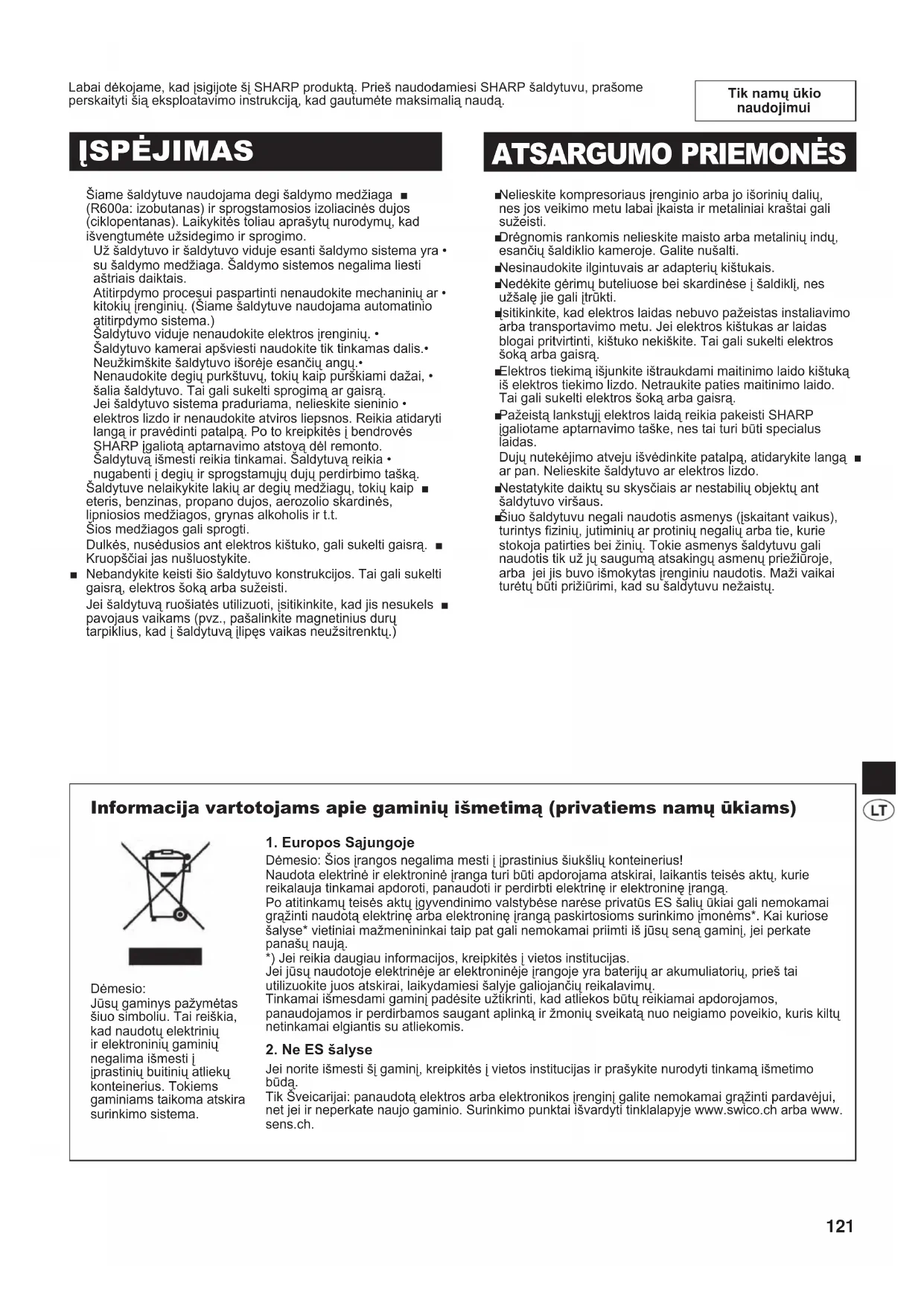 Nelieskite kompresoriaus įrenginio arba jo išorinių dalių, ■nes jos veikimo metu labai įkaista ir metaliniai kraštai gali sužeisti.Drėgnomis rankomis nelieskite maisto arba metalinių indų, ■esančių šaldiklio kameroje. Galite nušalti.Nesinaudokite ilgintuvais ar adapterių kištukais. ■Nedėkite gėrimų buteliuose bei skardinėse į šaldiklį, nes ■užšalę jie gali įtrūkti.Įsitikinkite, kad elektros laidas nebuvo pažeistas instaliavimo ■arba transportavimo metu. Jei elektros kištukas ar laidas blogai pritvirtinti, kištuko nekiškite. Tai gali sukelti elektros šoką arba gaisrą.Elektros tiekimą išjunkite ištraukdami maitinimo laido kištuką ■iš elektros tiekimo lizdo. Netraukite paties maitinimo laido. Tai gali sukelti elektros šoką arba gaisrą. Pažeistą lankstųjį elektros laidą reikia pakeisti SHARP ■įgaliotame aptarnavimo taške, nes tai turi būti specialus laidas.Dujų nutekėjimo atveju išvėdinkite patalpą, atidarykite langą ■ar pan. Nelieskite šaldytuvo ar elektros lizdo.Nestatykite daiktų su skysčiais ar nestabilių objektų ant ■šaldytuvo viršaus.Šiuo šaldytuvu negali naudotis asmenys (įskaitant vaikus), ■turintys zinių, jutiminių ar protinių negalių arba tie, kurie stokoja patirties bei žinių. Tokie asmenys šaldytuvu gali naudotis tik už jų saugumą atsakingų asmenų priežiūroje, arba jei jis buvo išmokytas įrenginiu naudotis. Maži vaikai turėtų būti prižiūrimi, kad su šaldytuvu nežaistų. Informacija vartotojams apie gaminių išmetimą (privatiems namų ūkiams)