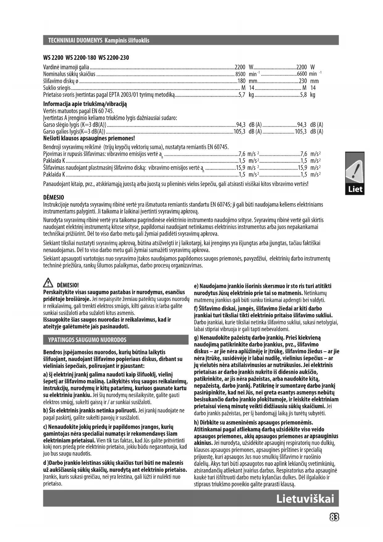 Bendros įspėjamosios nuorodos, kurių būtina laikytis šlifuojant, naudojant šlifavimo popieriaus diskus, dirbant su vieliniais šepečiais, poliruojant ir pjaustant: a) šį elektrinį įrankį galima naudoti kaip šlifuoklį, vielinį šepetį ar šlifavimo mašiną. Laikykitės visų saugos reikalavimų, instrukcijų, nurodymų ir kitų patarimų, kuriuos gaunate kartu su elektriniu įrankiu. Jei šių nurodymų nesilaikysite, galite gauti elektros smūgį, sukelti gaisrą ir / ar sunkiai susižaloti. b) Šis elektrinis įrankis netinka poliruoti. Jei įrankį naudojate ne pagal paskirtį, galite sukelti pavojų ir susižaloti. c) Nenaudokite jokių priedų ir papildomos įrangos, kurių gamintojas nėra specialiai numatęs ir rekomendavęs šiam elektriniam prietaisui. Vien tik tas faktas, kad Jūs galite pritvirtinti kokį nors priedą prie elektrinio prietaiso, jokiu būdu negarantuoja, kad juo bus saugu naudotis. d )Darbo įrankio leistinas sūkių skaičius turi būti ne mažesnis už aukščiausią sūkių skaičių, nurodytą ant elektrinio prietaiso. Įrankis, kuris sukasi greičiau, nei yra leistina, gali lūžti ir nulėkti nuo prietaiso. e) Naudojamo įrankio išorinis skersmuo ir sto ris turi atitikti nurodytus Jūsų elektrinio prie tai so matmenis. Netinkamų matmenų įrankius gali būti sunku tinkamai apdengti bei valdyti. f) Šlifavimo diskai, jungės, šlifavimo žiedai ar kiti darbo įrankiai turi tiksliai tikti elektrinio pritaiso šlifavimo sukliui. Darbo įrankiai, kurie tiksliai netinka šlifavimo sukliui, sukasi netolygiai, labai stipriai vibruoja ir gali tapti nebevaldomi. g) Nenaudokite pažeistų darbo įrankių. Prieš kiekvieną naudojimą patikrinkite darbo įrankius, pvz., šlifavimo diskus – ar jie nėra aplūžinėję ir įtrūkę, šlifavimo žiedus – ar jie nėra įtrūkę, susidėvėję ir labai nudilę, vielinius šepečius – ar jų vielutės nėra atsilaisvinusios ar nutrūkusios. Jei elektrinis prietaisas ar darbo įrankis nukrito iš didesnio aukščio, patikrinkite, ar jis nėra pažeistas, arba naudokite kitą, nepažeistą, darbo įrankį. Patikrinę ir sumontavę darbo įrankį pasirūpinkite, kad nei Jūs, nei greta esantys asmenys nebūtų besisukančio darbo įrankio plokštumoje, ir leiskite elektriniam prietaisui vieną minutę veikti didžiausiu sūkių skaičiumi. Jei darbo įrankis pažeistas, per šį bandomąjį laiką jis turėtų subyrėti. h) Dirbkite su asmeninėmis apsaugos priemonėmis. Atitinkamai pagal atliekamą darbą užsidėkite viso veido apsaugos priemones, akių apsaugos priemones ar apsauginius akinius. Jei nurodyta, užsidėkite apsauginį respiratorių nuo dulkių, klausos apsaugos priemones, apsaugines pirštines ir specialią prijuostę, kuri apsaugos Jus nuo smulkių šlifavimo ir ruošinio dalelių. Akys turi būti apsaugotos nuo aplink lekiančių svetimkūnių, atsirandančių atliekant įvairius darbus. Respiratorius arba apsauginė kaukė turi išltruoti darbo metu kylančias dulkes. Dėl ilgalaikio ir stipraus triukšmo poveikio galite prarasti klausą.84 Liet Lietuviškai