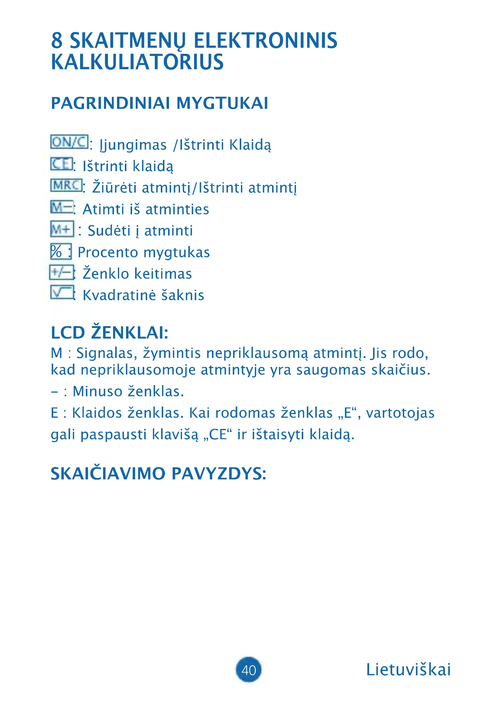 - Darbojieties rūpīgi, lai nesabojātu shēmu. IZEJA (3) Ievietojiet jauno bateriju pretējā virzienā (lai + polaritāte ir ar skatu uz augšu). (4) Uzlieciet atpakaļ vāciņu un pieskrūvējiet to (pārāk daudz nespiežot) (5) Automātiskā izslēgšanās: aptuveni pēc 8 minūtēm.40 8 SKAITMENŲ ELEKTRONINIS KALKULIATORIUS PAGRINDINIAI MYGTUKAI : Įjungimas /Ištrinti Klaidą : Ištrinti klaidą : Žiūrėti atmintį/Ištrinti atmintį : Atimti iš atminties : Sudėti į atminti % : Procento mygtukas : Ženklo keitimas : Kvadratinė šaknis LCD ŽENKLAI: M : Signalas, žymintis nepriklausomą atmintį. Jis rodo, kad nepriklausomoje atmintyje yra saugomas skaičius. - : Minuso ženklas. E : Klaidos ženklas. Kai rodomas ženklas „E“, vartotojas gali paspausti klavišą „CE“ ir ištaisyti klaidą. SKAIČIAVIMO PAVYZDYS: Lietuviškai41 ON/C 5+6M 32-6M+ 36+17M- MRC