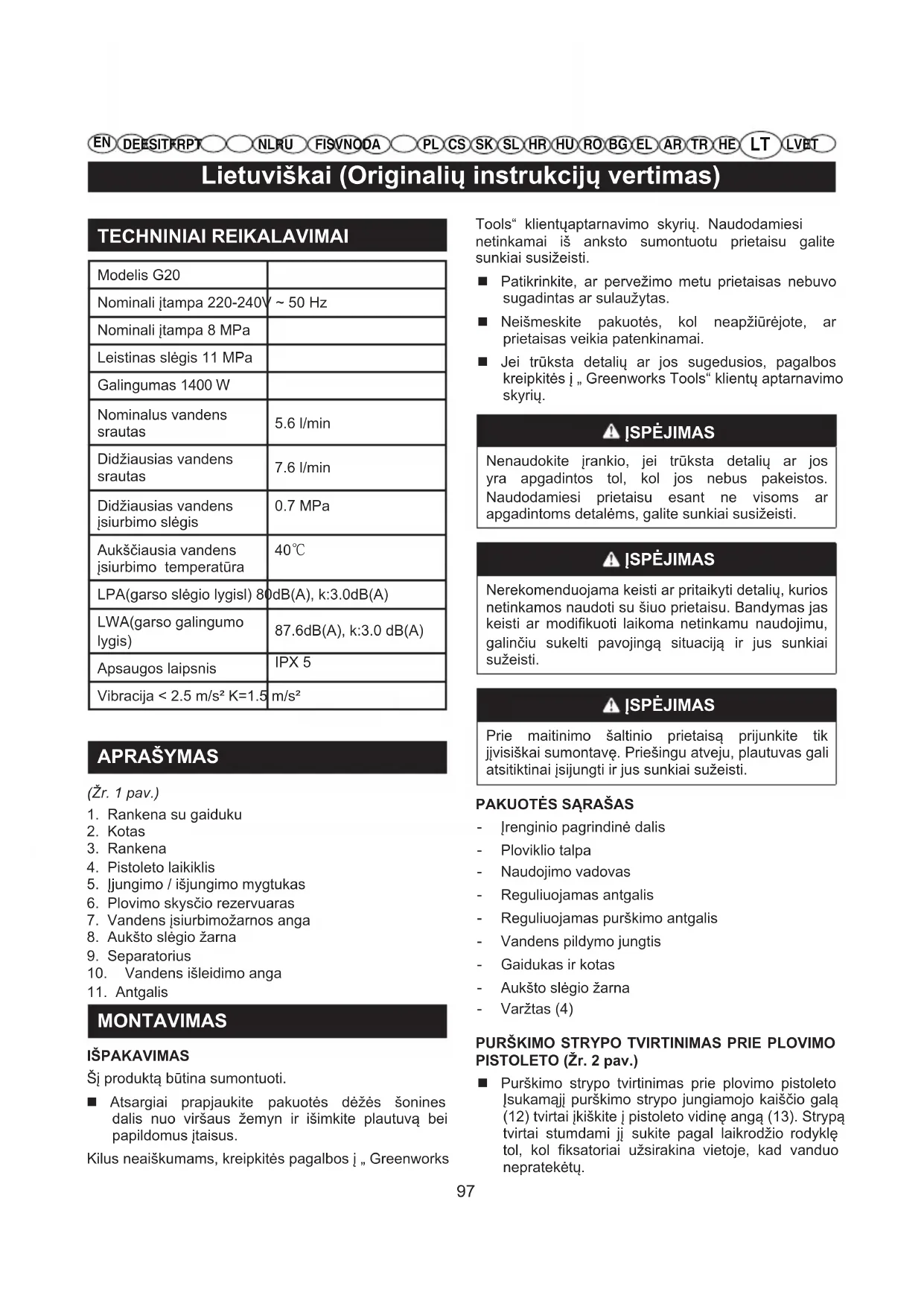G20 - Aukšto slėgio plovykla GREENWORKS - Nemokama naudojimo instrukcija