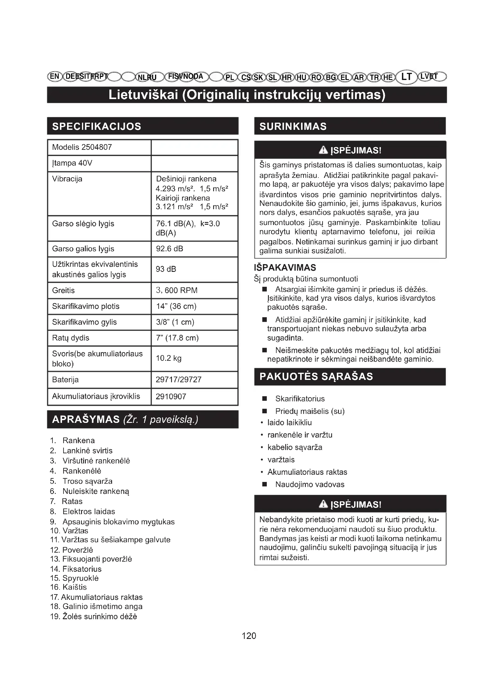 - Akumuliatoriaus raktas Naudojimo vadovas ĮSPĖJIMAS! Nebandykite prietaiso modi kuoti ar kurti priedų, ku- rie nėra rekomenduojami naudoti su šiuo produktu. Bandymas jas keisti ar modi kuoti laikoma netinkamu naudojimu, galinčiu sukelti pavojingą situaciją ir jus rimtai sužeisti. SPECIFIKACIJOS Modelis 2504807 Įtampa 40V Vibracija Dešinioji rankena