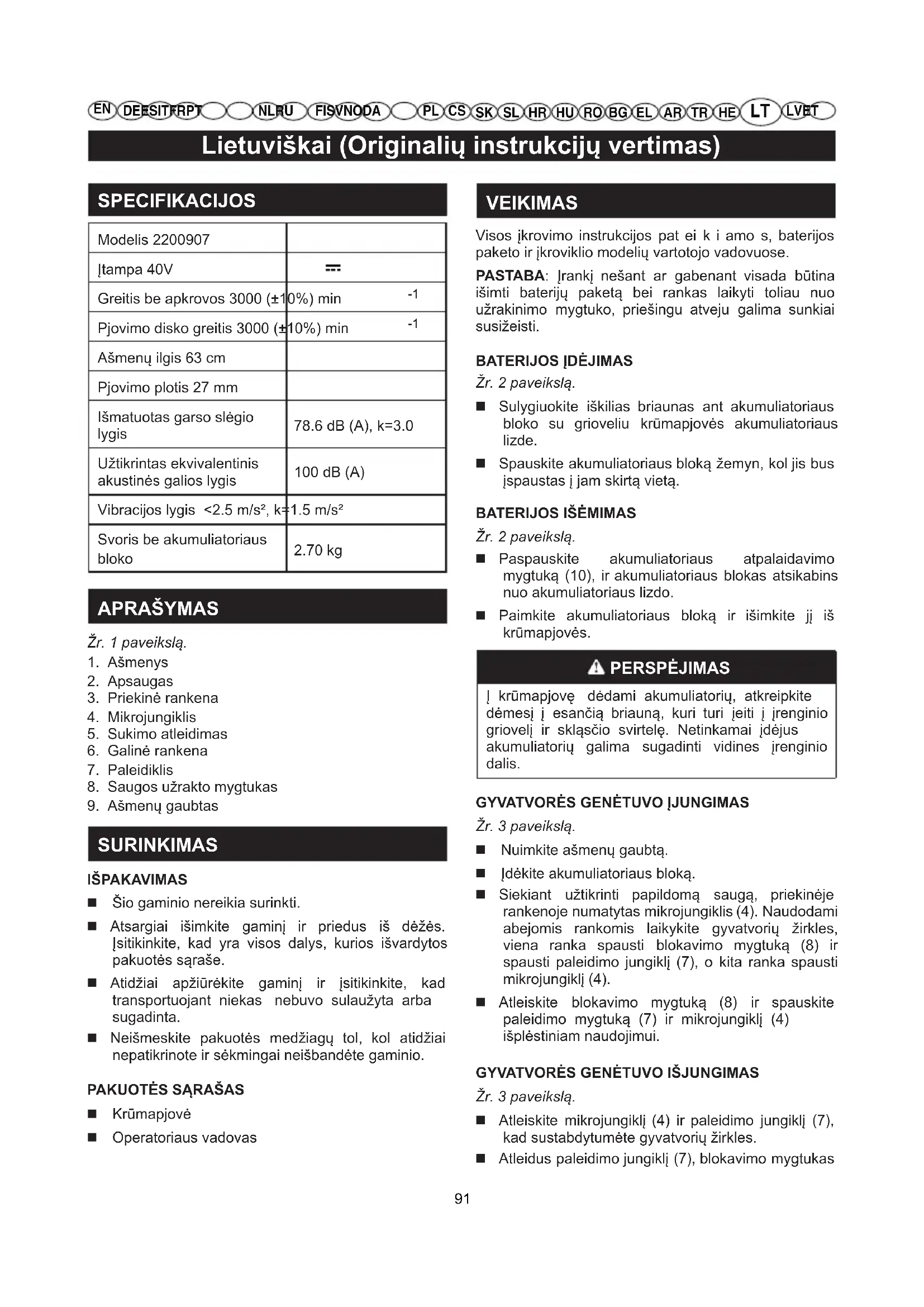 TAISYMAS GYVATVORĖS GENĖTUVO AŠMENŲ TECHNINIS APTARNAVIMAS ĮSPĖJIMAS Nepamirškite, kad akumuliatoriniai įrankiai yra visuomet pasiruošę veikti, kadangi nereikia, kad jie būtų įjungti į elektros lizdą. Kad išvengtumėte sunkių kūno sužalojimų, visada išimkite bateriją ir būkite labai budrūs techninio aptarnavimo ar ašmenų pakeitimo metu. 92Lietuviškai (Originalių instrukcijų vertimas)
