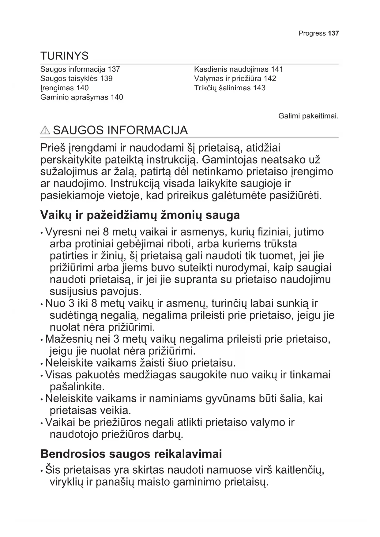 - Šis prietaisas yra skirtas tik maistui gaminti. Nenaudokite šio prietaiso kitais tikslais. Progress 139• Nekeiskite šio prietaiso techninių savybių.