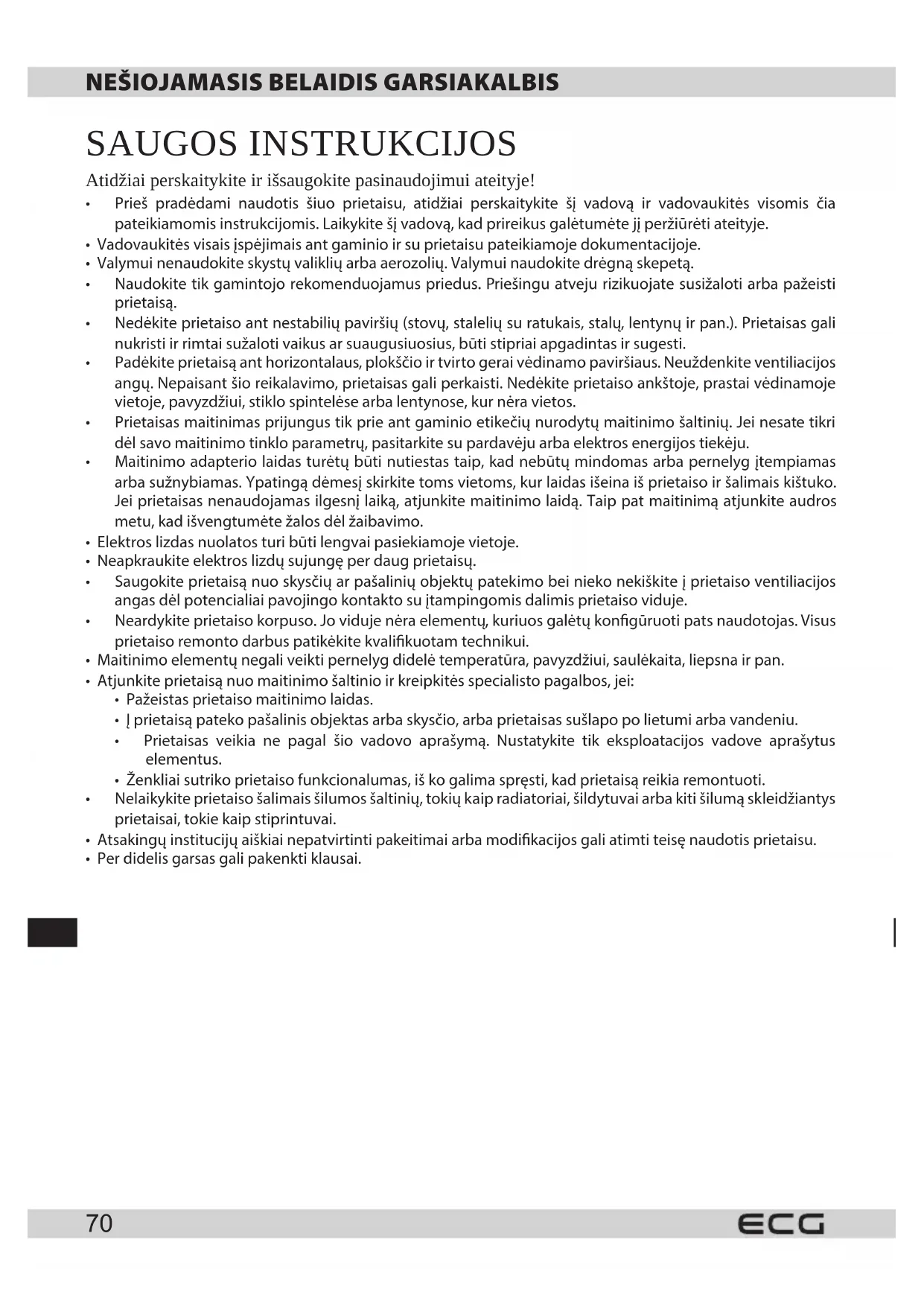 - Saugokite prietaisą nuo skysčių ar pašalinių objektų patekimo bei nieko nekiškite į prietaiso ventiliacijos angas dėl potencialiai pavojingo kontakto su įtampingomis dalimis prietaiso viduje.