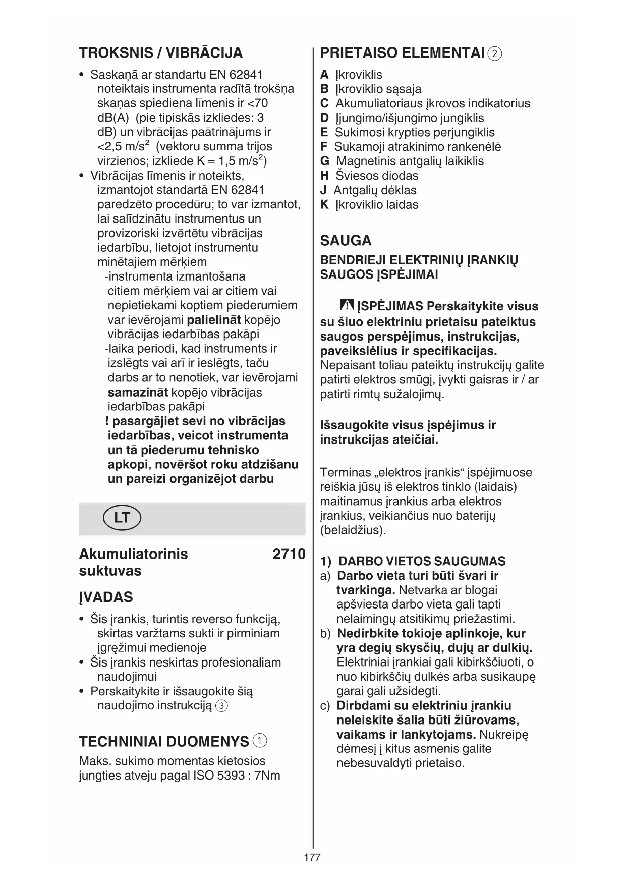 Maks. sukimo momentas kietosios jungties atveju pagal ISO 5393 : 7Nm178 b) Naudokite asmenines apsaugos priemones ir visuomet užsidėkite apsauginius akinius. Naudojant asmenines apsaugos priemones, pvz., respiratorių ar apsauginę kaukę, neslystančius batus, apsauginį šalmą, klausos apsaugos priemones ir kt., rekomenduojamas dirbant su tam tikros rūšies įrankiais, sumažėja rizika susižeisti. c) Saugokitės, kad neįjungtumėte prietaiso atsitiktinai. Prieš prijungdami elektrinį įrankį prie elektros tinklo ir/arba akumuliatoriaus, prieš pakeldami ar nešdami įsitikinkite, kad jis yra išjungtas. Jeigu nešdami elektrinį įrankį pirštą laikysite ant jungiklio arba prietaisą įjungsite į elektros tinklą, kai jungiklis yra įjungtas, gali įvykti nelaimingas atsitikimas. d) Prieš įjungdami prietaisą pašalinkite reguliavimo įrankius arba veržlių raktus. Prietaiso besisukančioje dalyje esantis įrankis ar raktas gali tapti sužalojimų priežastimi. e) Nepervertinkite savo galimybių. Dirbdami atsistokite patikimai ir visada išlaikykite pusiausvyrą. Patikima stovėsena ir tinkama kūno laikysena leis geriau kontroliuoti prietaisą netikėtose situacijose. f) Dėvėkite tinkamą aprangą. Nedėvėkite plačių drabužių ir papuošalų. Saugokite plaukus ir drabužius nuo besisukančių elektrinio įrankio dalių. Laisvus drabužius, papuošalus bei ilgus plaukus gali įtraukti besisukančios dalys. g) Jei yra numatyta galimybė prijungti dulkių nusiurbimo ar surinkimo įrenginius, visada įsitikinkite, ar jie yra prijungti ir ar teisingai naudojami. Naudojant dulkių nusiurbimo įrenginius sumažėja kenksmingas dulkių poveikis. h) Dažnai naudodami įrankį ir gerai su juo susipažinę pernelyg neatsipalaiduokite ir nepradėkite nepaisyti įrankio saugos principų. Neatidus veiksmas gali sukelti sunkią traumą per sekundės dalį.