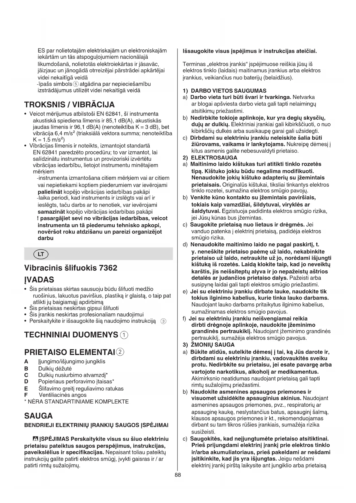 a) Būkite atidūs, sutelkite dėmesį į tai, ką Jūs darote ir, dirbdami su elektriniu įrankiu, vadovaukitės sveiku protu. Nedirbkite su prietaisu, jei esate pavargę arba vartojote narkotikus, alkoholį ar medikamentus. Akimirksnio neatidumas naudojant prietaisą gali tapti rimtų sužalojimų priežastimi. b) Naudokite asmenines apsaugos priemones ir visuomet užsidėkite apsauginius akinius. Naudojant asmenines apsaugos priemones, pvz., respiratorių ar apsauginę kaukę, neslystančius batus, apsauginį šalmą, klausos apsaugos priemones ir kt., rekomenduojamas dirbant su tam tikros rūšies įrankiais, sumažėja rizika susižeisti. c) Saugokitės, kad neįjungtumėte prietaiso atsitiktinai. Prieš prijungdami elektrinį įrankį prie elektros tinklo ir/arba akumuliatoriaus, prieš pakeldami ar nešdami įsitikinkite, kad jis yra išjungtas. Jeigu nešdami elektrinį įrankį pirštą laikysite ant jungiklio arba prietaisą ES par nolietotajām elektriskajām un elektroniskajām iekārtām un tās atspoguļojumiem nacionālajā likumdošanā, nolietotās elektroiekārtas ir jāsavāc, jāizjauc un jānogādā otrreizējai pārstrādei apkārtējai videi nekaitīgā veidā - īpašs simbols