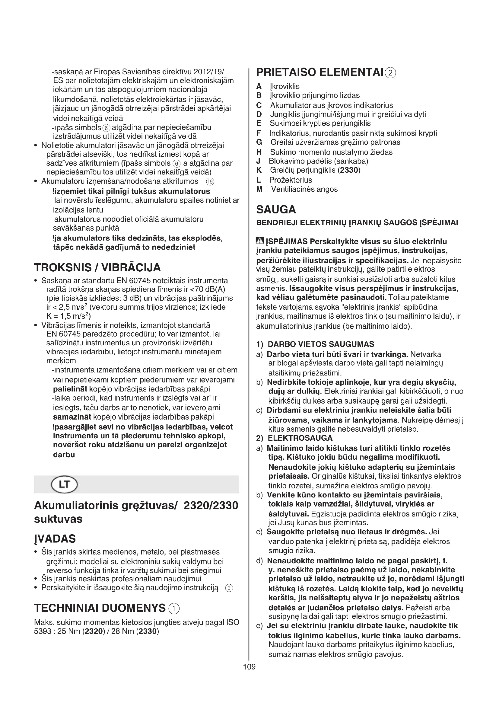 Maks. sukimo momentas kietosios jungties atveju pagal ISO 5393 : 25 Nm (2320) / 28 Nm (2330)110 neprieinamoje vietoje. Elektriniai įrankiai yra pavojingi, kai juos naudoja nepatyrę asmenys. e) Prižiūrėkite elektrinį įrankį ir priedus. Tikrinkite, ar besisukančios prietaiso dalys tinkamai veikia ir niekur nekliūva, ar nėra sulūžusių ar šiaip pažeistų dalių, kurios įtakotų prietaiso veikimą. Prieš vėl naudojant prietaisą pažeistos prietaiso dalys turi būti suremontuotos. Daugelio nelaimingų atsitikimų priežastis yra blogai prižiūrimi elektriniai įrankiai. f) Pjovimo įrankiai turi būti aštrūs ir švarūs. Rūpestingai prižiūrėti pjovimo įrankiai su aštriomis pjaunamosiomis briaunomis mažiau stringa ir juos yra lengviau valdyti. g) Elektrinį įrankį, papildomą įrangą, darbo įrankius ir t. t. naudokite taip, kaip nurodyta šioje instrukcijoje. Taip pat atsižvelkite į darbo sąlygas bei atliekamo darbo pobūdį. Naudojant elektrinius įrankius ne pagal jų paskirtį galima sukelti pavojingas situacijas. h) Rankenos ir suėmimo paviršiai turi būti sausi, švarūs, ant jų neturi būti alyvos ir tepalų. Dėl slidžių rankenų ir suėmimo paviršių negalėsite saugiai išlaikyti ir suvaldyti įrankio netikėtose situacijose.