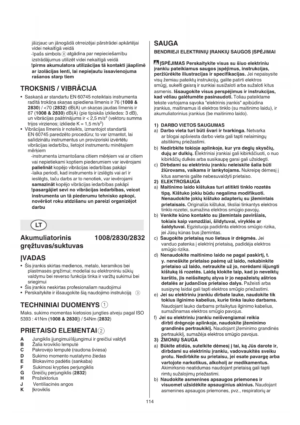 A Jungiklis įjungimui/išjungimui ir greičiui valdyti B Žalia kroviklio lemputė C Pakrovėjo lemputė (raudona šviesa) D Sukimo momento nustatymo žiedas E Blokavimo padėtis (sankaba) F Sukimosi krypties perjungiklis G Greičių perjungiklis (2832) H Prožektorius J Ventiliacinės angos K Įkroviklis115 g) Elektrinį įrankį, papildomą įrangą, darbo įrankius ir t. t. naudokite taip, kaip nurodyta šioje instrukcijoje. Taip pat atsižvelkite į darbo sąlygas bei atliekamo darbo pobūdį. Naudojant elektrinius įrankius ne pagal jų paskirtį galima sukelti pavojingas situacijas. h) Rankenos ir suėmimo paviršiai turi būti sausi, švarūs, ant jų neturi būti alyvos ir tepalų. Dėl slidžių rankenų ir suėmimo paviršių negalėsite saugiai išlaikyti ir suvaldyti įrankio netikėtose situacijose.