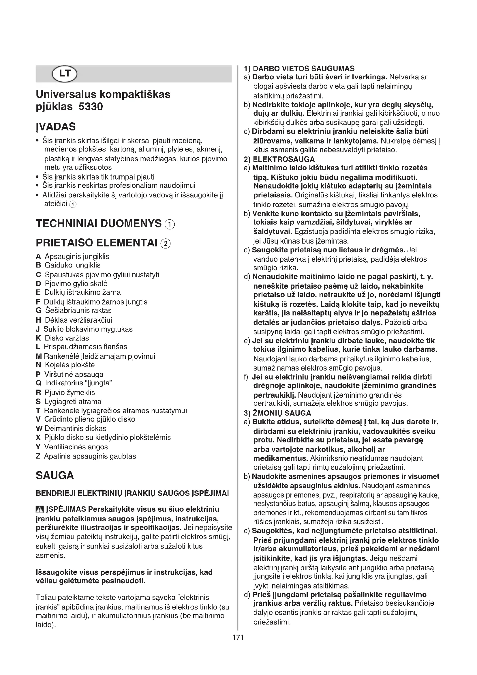 - Atidžiai perskaitykite šį vartotojo vadovą ir išsaugokite jį ateičiai 4 TECHNINIAI DUOMENYS 1 PRIETAISO ELEMENTAI 2 A Apsauginis jungiklis B Gaiduko jungiklis C Spaustukas pjovimo gyliui nustatyti D Pjovimo gylio skalė E Dulkių ištraukimo žarna F Dulkių ištraukimo žarnos jungtis G Šešiabriaunis raktas H Dėklas veržliarakčiui J Suklio blokavimo mygtukas K Disko varžtas L Prispaudžiamasis flanšas M Rankenėlė įleidžiamajam pjovimui N Kojelės plokštė P Viršutinė apsauga Q Indikatorius “Įjungta” R Pjūvio žymeklis S Lygiagreti atrama T Rankenėlė lygiagrečios atramos nustatymui V Grūdinto plieno pjūklo disko W Deimantinis diskas X Pjūklo disko su kietlydinio plokštelėmis Y Ventiliacinės angos Z Apatinis apsauginis gaubtas SAUGA
