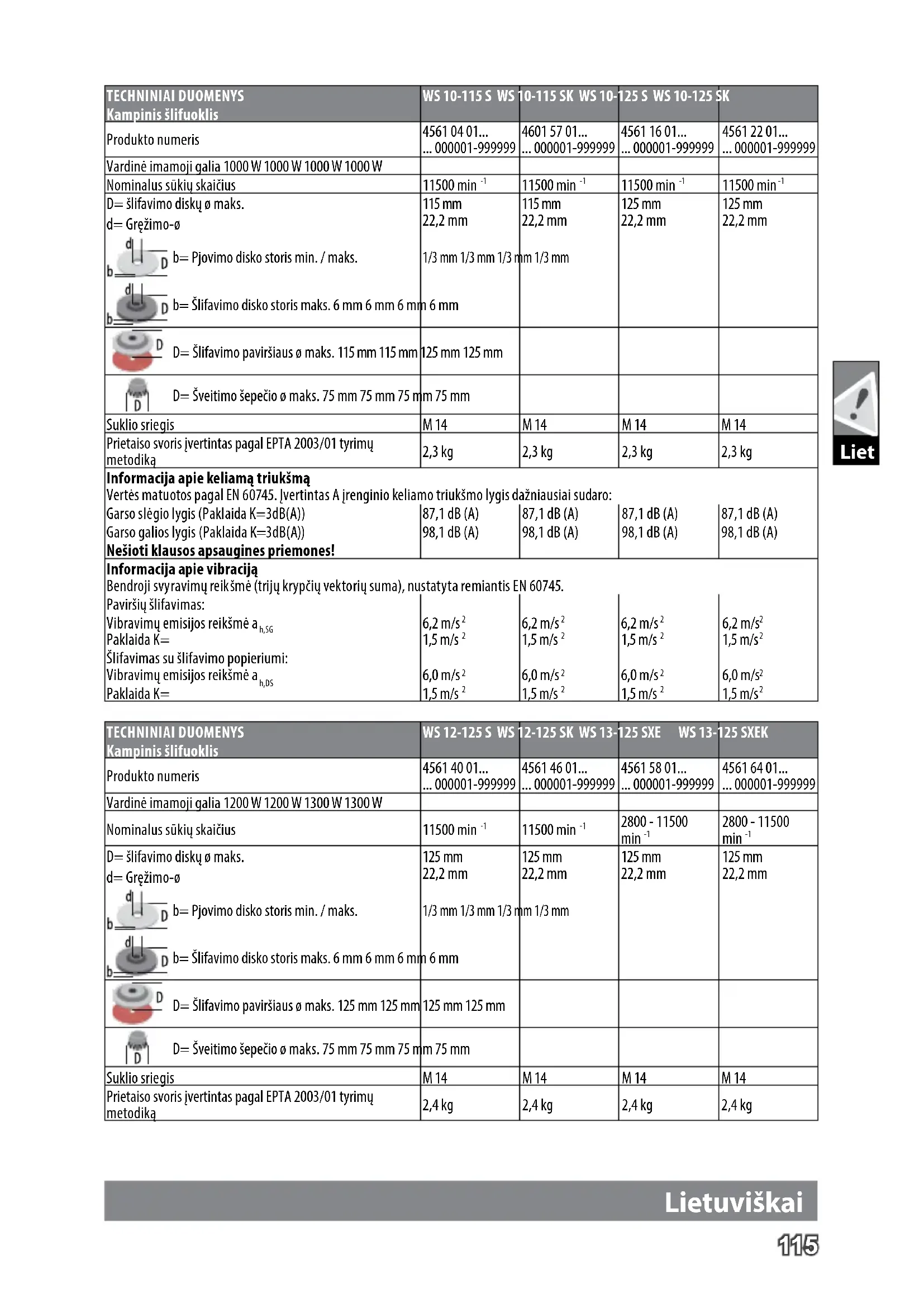 D= šlifavimo diskų ø maks. d= Gręžimo-ø 125 mm 22,2 mm 125 mm 22,2 mm 125 mm 22,2 mm 125 mm 22,2 mm b= Pjovimo disko storis min. / maks. 1/3 mm 1/3 mm 1/3 mm 1/3 mm b= Šlifavimo disko storis maks. 6 mm 6 mm 6 mm 6 mm D= Šlifavimo paviršiaus ø maks. 125 mm 125 mm 125 mm 125 mm D= Šveitimo šepečio ø maks. 75 mm 75 mm 75 mm 75 mm Suklio sriegis M 14 M 14 M 14 M 14 Prietaiso svoris įvertintas pagal EPTA 2003/01 tyrimų metodiką 2,4 kg 2,4 kg 2,4 kg 2,4 kg116 Liet Lietuviškai TECHNINIAI DUOMENYS Kampinis šlifuoklis WS 12-125 S WS 12-125 SK WS 13-125 SXE WS 13-125 SXEK Informacija apie keliamą triukšmą Vertės matuotos pagal EN 60745. Įvertintas A įrenginio keliamo triukšmo lygis dažniausiai sudaro: Garso slėgio lygis (Paklaida K=3dB(A)) 89,3 dB (A) 89,3 dB (A) 90,1 dB (A) 90,1 dB (A) Garso galios lygis (Paklaida K=3dB(A)) 100,3 dB (A) 100,3 dB (A) 101,1 dB (A) 101,1 dB (A) Nešioti klausos apsaugines priemones! Informacija apie vibraciją Bendroji svyravimų reikšmė (trijų krypčių vektorių suma), nustatyta remiantis EN 60745. Paviršių šlifavimas: Vibravimų emisijos reikšmė a h,SG Paklaida K= 5,8 m/s