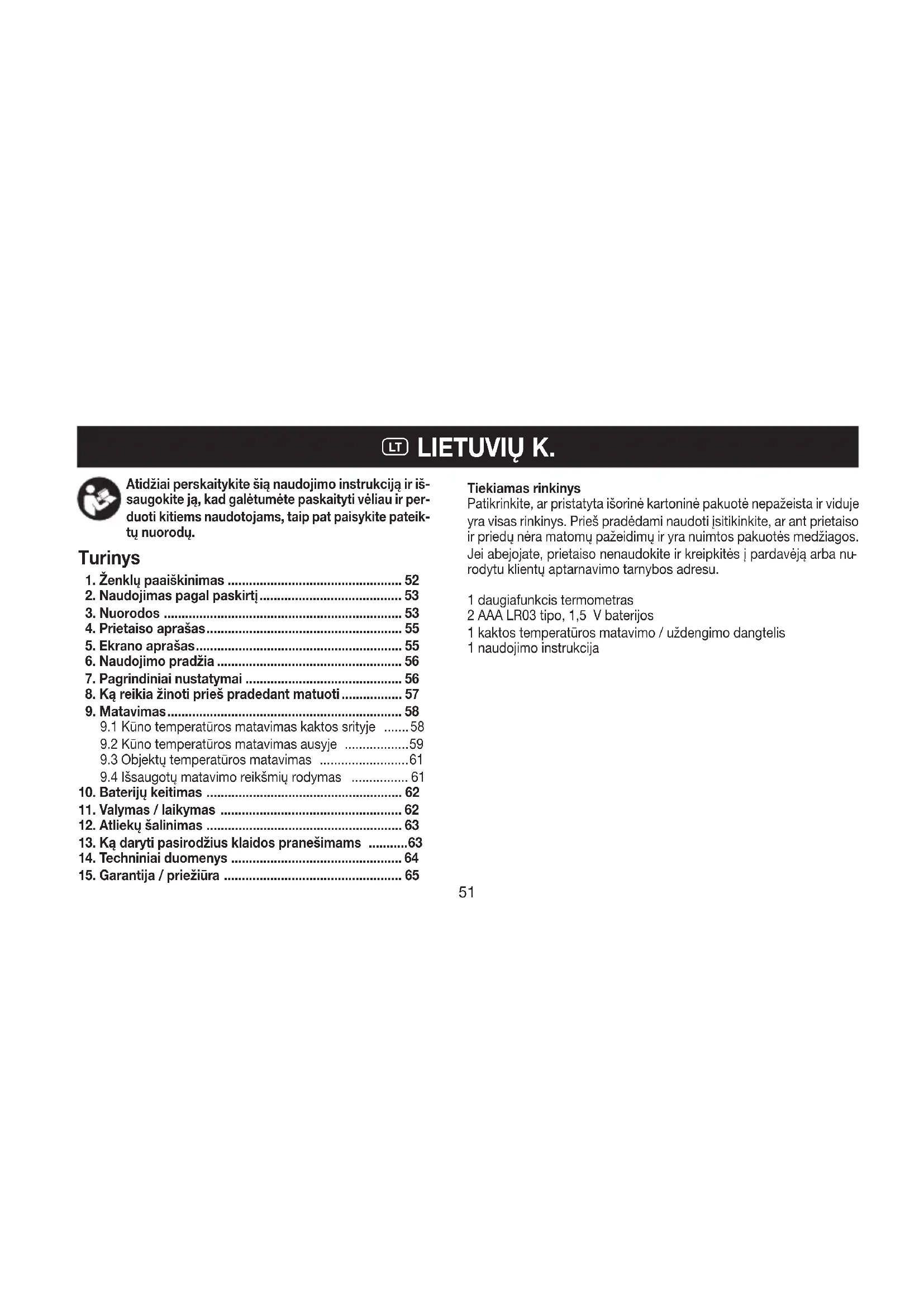 rodytu klientų aptarnavimo tarnybos adresu. 1 daugiafunkcis termometras 2 AAA LR03 tipo, 1,5 V baterijos 1 kaktos temperatūros matavimo / uždengimo dangtelis 1 naudojimo instrukcija Turinys