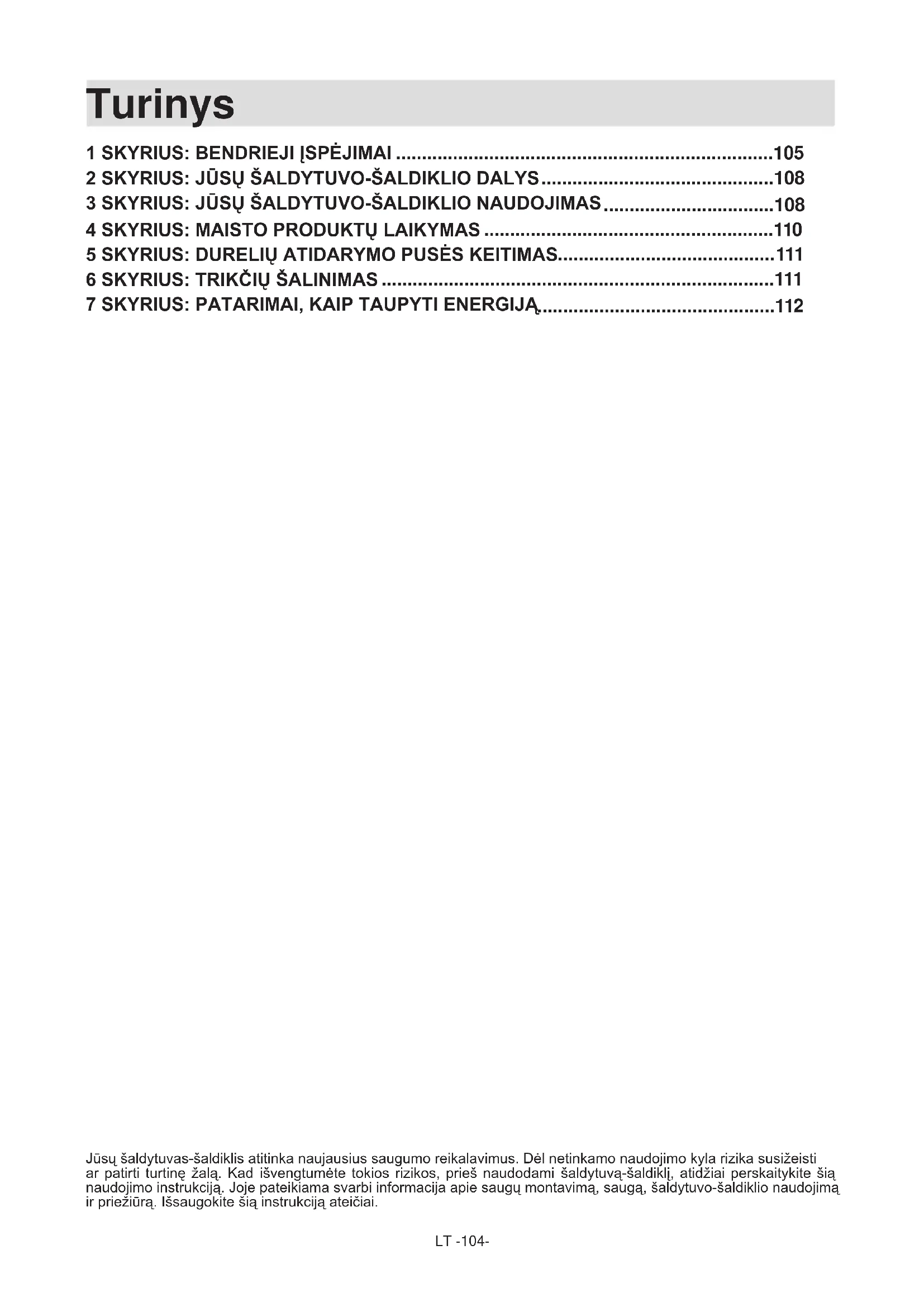 Jūsų šaldytuvas-šaldiklis atitinka naujausius saugumo reikalavimus. Dėl netinkamo naudojimo kyla rizika susižeisti ar patirti turtinę žalą. Kad išvengtumėte tokios rizikos, prieš naudodami šaldytuvą-šaldiklį, atidžiai perskaitykite šią naudojimo instrukciją. Joje pateikiama svarbi informacija apie saugų montavimą, saugą, šaldytuvo-šaldiklio naudojimą ir priežiūrą. Išsaugokite šią instrukciją ateičiai. Turinys