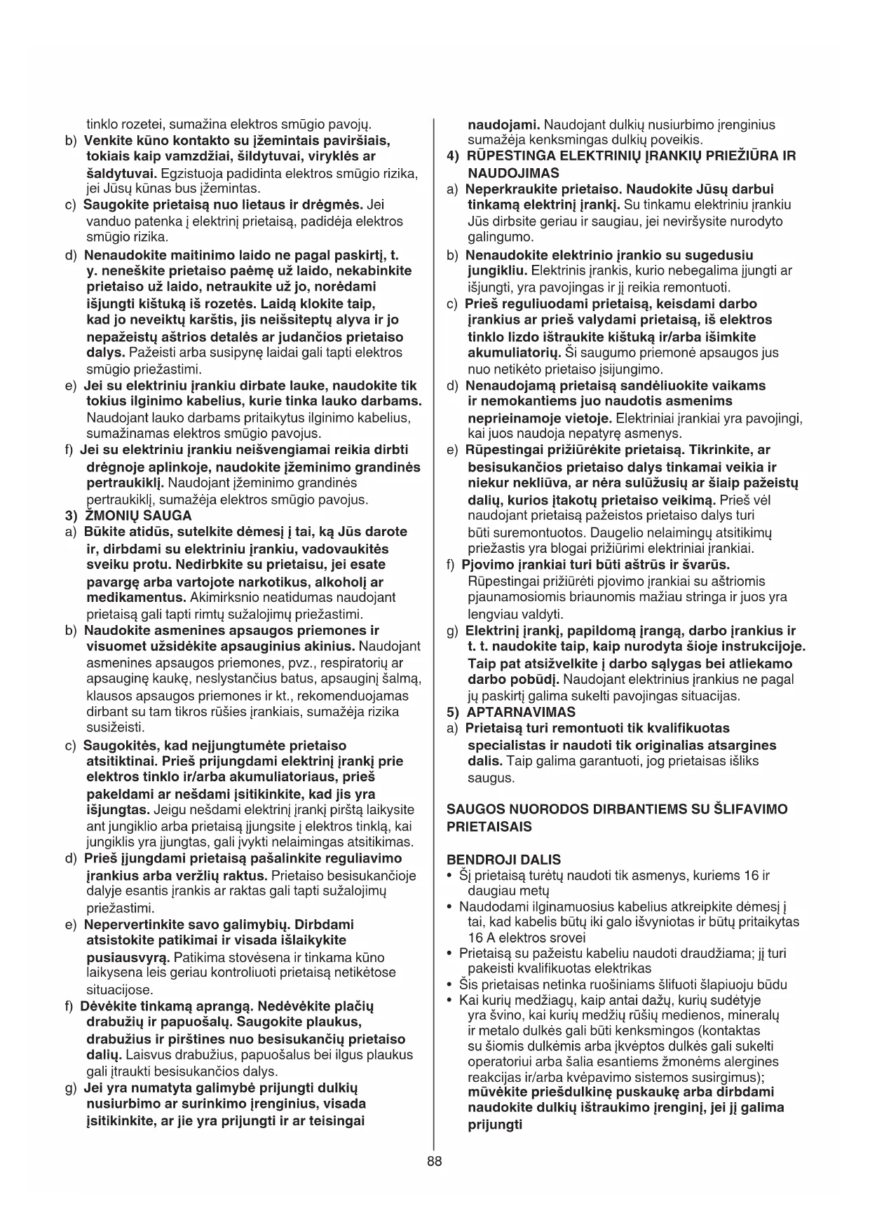 a) Maitinimo laido kištukas turi atitikti tinklo rozetės tipą. Kištuko jokiu būdu negalima modikuoti. Nenaudokite jokių kištuko adapterių su įžemintais prietaisais. Originalūs kištukai, tiksliai tinkantys elektros88 tinklo rozetei, sumažina elektros smūgio pavojų. b) Venkite kūno kontakto su įžemintais paviršiais, tokiais kaip vamzdžiai, šildytuvai, viryklės ar šaldytuvai. Egzistuoja padidinta elektros smūgio rizika, jei Jūsų kūnas bus įžemintas. c) Saugokite prietaisą nuo lietaus ir drėgmės. Jei vanduo patenka į elektrinį prietaisą, padidėja elektros smūgio rizika. d) Nenaudokite maitinimo laido ne pagal paskirtį, t. y. neneškite prietaiso paėmę už laido, nekabinkite prietaiso už laido, netraukite už jo, norėdami išjungti kištuką iš rozetės. Laidą klokite taip, kad jo neveiktų karštis, jis neišsiteptų alyva ir jo nepažeistų aštrios detalės ar judančios prietaiso dalys. Pažeisti arba susipynę laidai gali tapti elektros smūgio priežastimi. e) Jei su elektriniu įrankiu dirbate lauke, naudokite tik tokius ilginimo kabelius, kurie tinka lauko darbams. Naudojant lauko darbams pritaikytus ilginimo kabelius, sumažinamas elektros smūgio pavojus. f) Jei su elektriniu įrankiu neišvengiamai reikia dirbti drėgnoje aplinkoje, naudokite įžeminimo grandinės pertraukiklį. Naudojant įžeminimo grandinės pertraukiklį, sumažėja elektros smūgio pavojus.