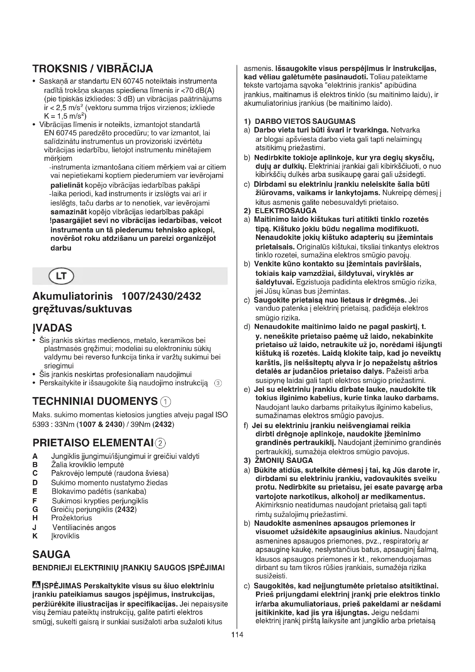 A Jungiklis įjungimui/išjungimui ir greičiui valdyti B Žalia kroviklio lemputė C Pakrovėjo lemputė (raudona šviesa) D Sukimo momento nustatymo žiedas E Blokavimo padėtis (sankaba) F Sukimosi krypties perjungiklis G Greičių perjungiklis (2432) H Prožektorius J Ventiliacinės angos K Įkroviklis SAUGA