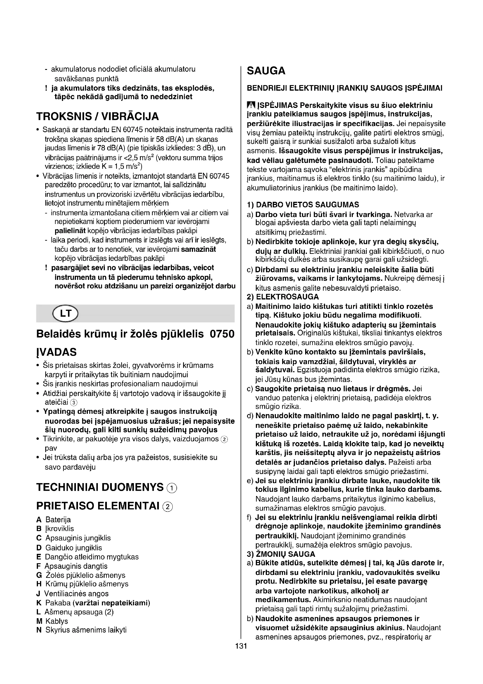 - Jei trūksta dalių arba jos yra pažeistos, susisiekite su savo pardavėju TECHNINIAI DUOMENYS 1 PRIETAISO ELEMENTAI 2 A Baterija B Įkroviklis C Apsauginis jungiklis D Gaiduko jungiklis E Dangčio atleidimo mygtukas F Apsauginis dangtis G Žolės pjūklelio ašmenys H Krūmų pjūklelio ašmenys J Ventiliacinės angos K Pakaba (varžtai nepateikiami) L Ašmenų apsauga (2) M Kablys N Skyrius ašmenims laikyti SAUGA