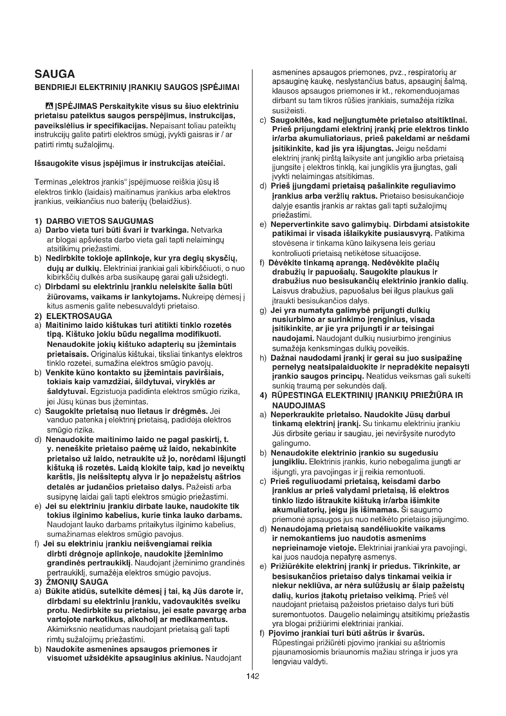 a) Būkite atidūs, sutelkite dėmesį į tai, ką Jūs darote ir, dirbdami su elektriniu įrankiu, vadovaukitės sveiku protu. Nedirbkite su prietaisu, jei esate pavargę arba vartojote narkotikus, alkoholį ar medikamentus. Akimirksnio neatidumas naudojant prietaisą gali tapti rimtų sužalojimų priežastimi. b) Naudokite asmenines apsaugos priemones ir visuomet užsidėkite apsauginius akinius. Naudojant143
