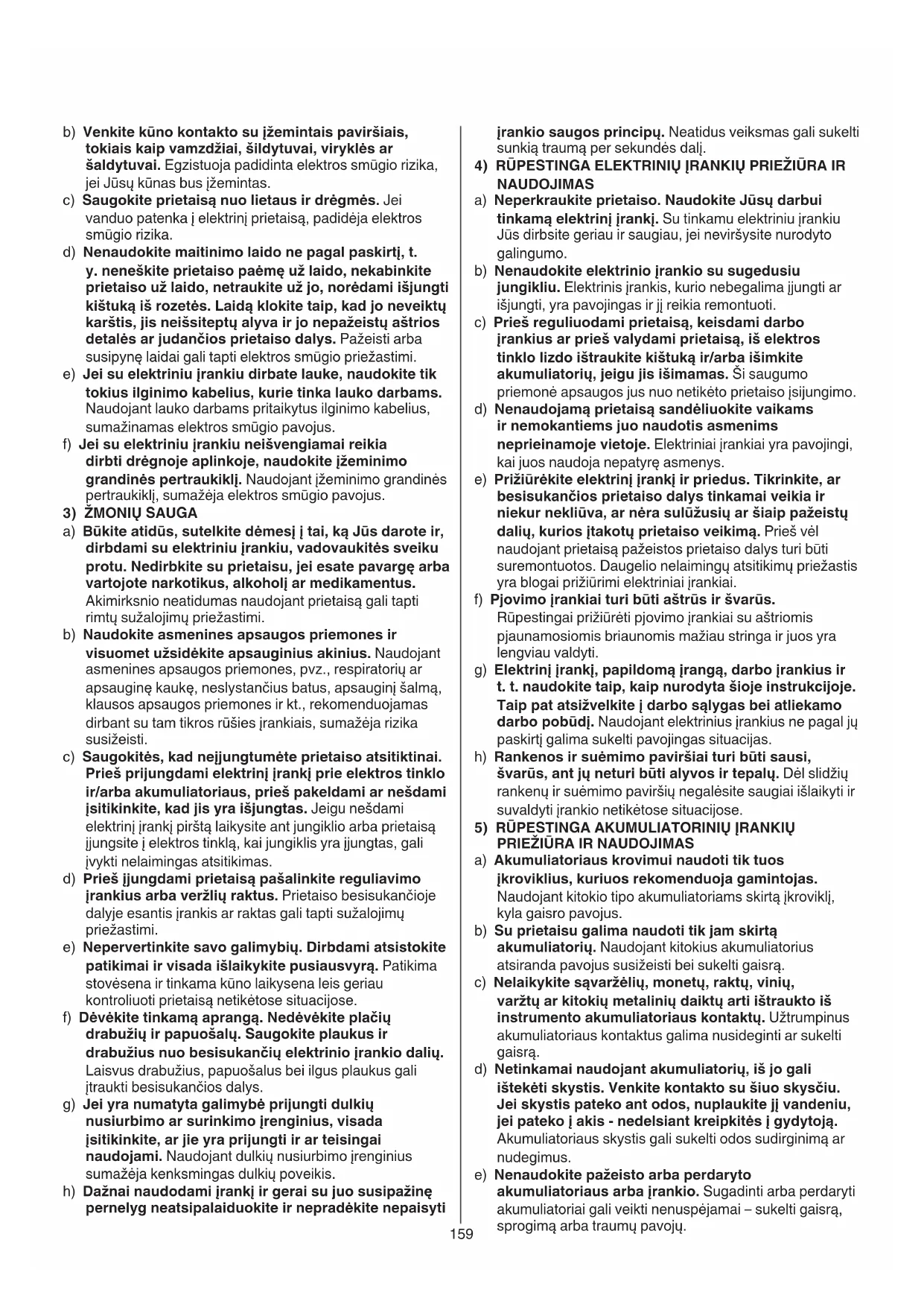 a) Akumuliatoriaus krovimui naudoti tik tuos įkroviklius, kuriuos rekomenduoja gamintojas. Naudojant kitokio tipo akumuliatoriams skirtą įkroviklį, kyla gaisro pavojus. b) Su prietaisu galima naudoti tik jam skirtą akumuliatorių. Naudojant kitokius akumuliatorius atsiranda pavojus susižeisti bei sukelti gaisrą. c) Nelaikykite sąvaržėlių, monetų, raktų, vinių, varžtų ar kitokių metalinių daiktų arti ištraukto iš instrumento akumuliatoriaus kontaktų. Užtrumpinus akumuliatoriaus kontaktus galima nusideginti ar sukelti gaisrą. d) Netinkamai naudojant akumuliatorių, iš jo gali ištekėti skystis. Venkite kontakto su šiuo skysčiu. Jei skystis pateko ant odos, nuplaukite jį vandeniu, jei pateko į akis - nedelsiant kreipkitės į gydytoją. Akumuliatoriaus skystis gali sukelti odos sudirginimą ar nudegimus. e) Nenaudokite pažeisto arba perdaryto akumuliatoriaus arba įrankio. Sugadinti arba perdaryti akumuliatoriai gali veikti nenuspėjamai – sukelti gaisrą, sprogimą arba traumų pavojų. b) Venkite kūno kontakto su įžemintais paviršiais, tokiais kaip vamzdžiai, šildytuvai, viryklės ar šaldytuvai. Egzistuoja padidinta elektros smūgio rizika, jei Jūsų kūnas bus įžemintas. c) Saugokite prietaisą nuo lietaus ir drėgmės. Jei vanduo patenka į elektrinį prietaisą, padidėja elektros smūgio rizika. d) Nenaudokite maitinimo laido ne pagal paskirtį, t. y. neneškite prietaiso paėmę už laido, nekabinkite prietaiso už laido, netraukite už jo, norėdami išjungti kištuką iš rozetės. Laidą klokite taip, kad jo neveiktų karštis, jis neišsiteptų alyva ir jo nepažeistų aštrios detalės ar judančios prietaiso dalys. Pažeisti arba susipynę laidai gali tapti elektros smūgio priežastimi. e) Jei su elektriniu įrankiu dirbate lauke, naudokite tik tokius ilginimo kabelius, kurie tinka lauko darbams. Naudojant lauko darbams pritaikytus ilginimo kabelius, sumažinamas elektros smūgio pavojus. f) Jei su elektriniu įrankiu neišvengiamai reikia dirbti drėgnoje aplinkoje, naudokite įžeminimo grandinės pertraukiklį. Naudojant įžeminimo grandinės pertraukiklį, sumažėja elektros smūgio pavojus.