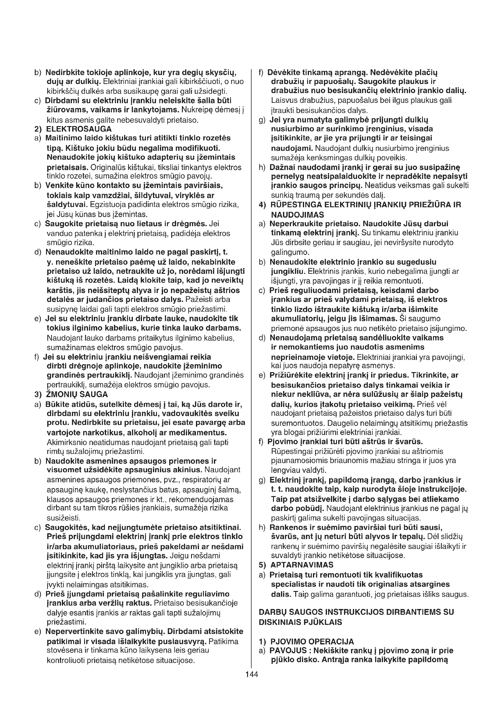 | Saugumas | Naudokite apsauginius akinius, pir61tines ir 7eeminkite, kad darbo zona b6bt73 laisva. Nenuimkite disko apsaugos. |