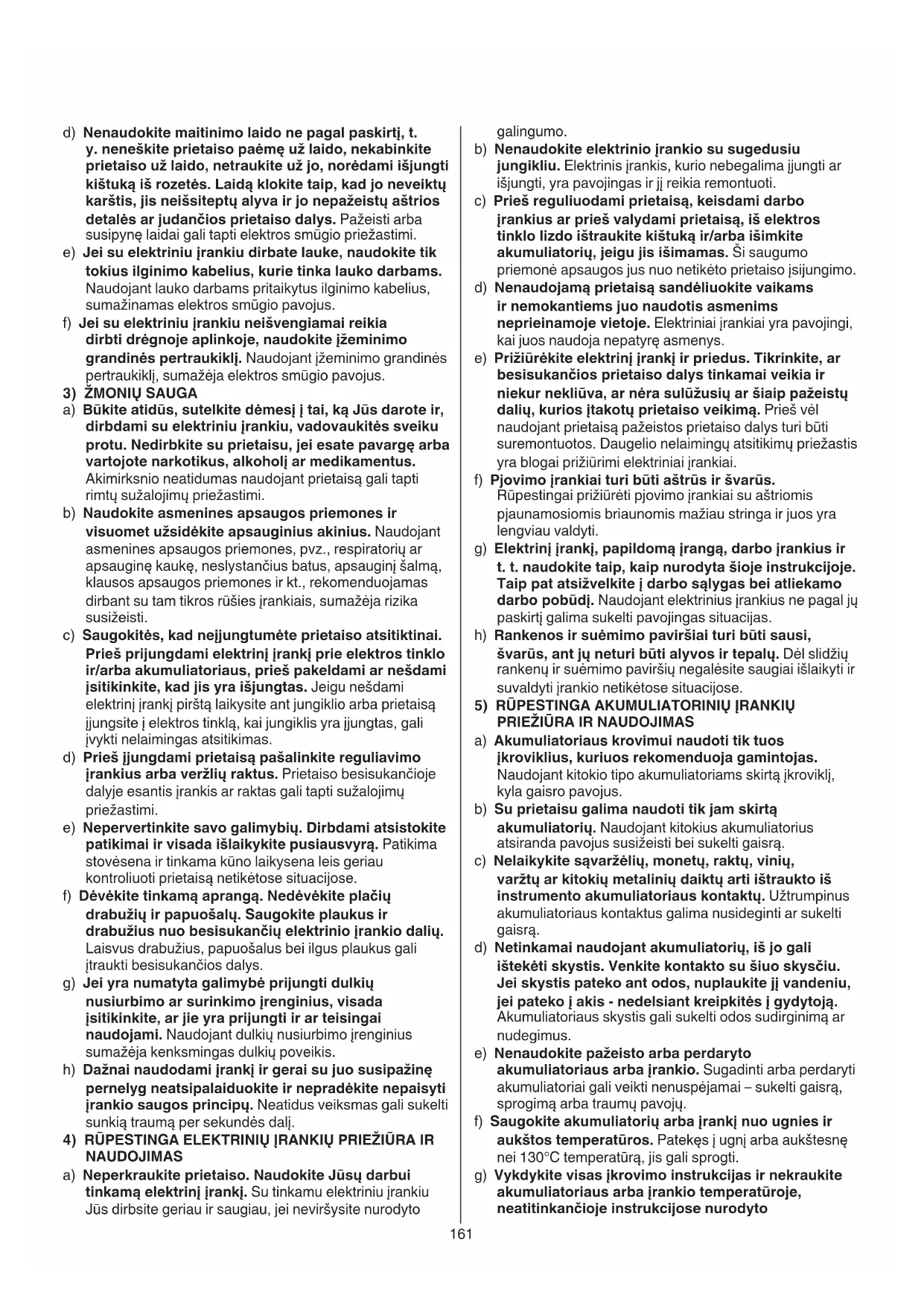 e) Nenaudokite pazeisto arba perdaryto akumulatoriaus arba irankio. Sugadinti arba perdaryti akumulatoriaigali veikti nenuispjamai - sukelti gaisra, sprogima arba traumpavoju.