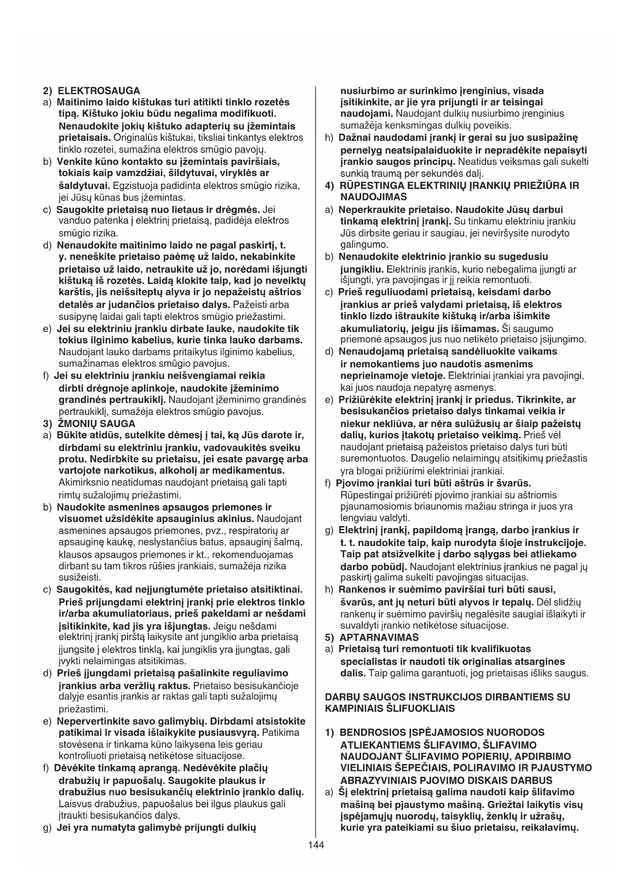 a) Būkite atidūs, sutelkite dėmesį į tai, ką Jūs darote ir, dirbdami su elektriniu įrankiu, vadovaukitės sveiku protu. Nedirbkite su prietaisu, jei esate pavargę arba vartojote narkotikus, alkoholį ar medikamentus. Akimirksnio neatidumas naudojant prietaisą gali tapti rimtų sužalojimų priežastimi. b) Naudokite asmenines apsaugos priemones ir visuomet užsidėkite apsauginius akinius. Naudojant asmenines apsaugos priemones, pvz., respiratorių ar apsauginę kaukę, neslystančius batus, apsauginį šalmą, klausos apsaugos priemones ir kt., rekomenduojamas dirbant su tam tikros rūšies įrankiais, sumažėja rizika susižeisti. c) Saugokitės, kad neįjungtumėte prietaiso atsitiktinai. Prieš prijungdami elektrinį įrankį prie elektros tinklo ir/arba akumuliatoriaus, prieš pakeldami ar nešdami įsitikinkite, kad jis yra išjungtas. Jeigu nešdami elektrinį įrankį pirštą laikysite ant jungiklio arba prietaisą įjungsite į elektros tinklą, kai jungiklis yra įjungtas, gali įvykti nelaimingas atsitikimas. d) Prieš įjungdami prietaisą pašalinkite reguliavimo įrankius arba veržlių raktus. Prietaiso besisukančioje dalyje esantis įrankis ar raktas gali tapti sužalojimų priežastimi. e) Nepervertinkite savo galimybių. Dirbdami atsistokite patikimai ir visada išlaikykite pusiausvyrą. Patikima stovėsena ir tinkama kūno laikysena leis geriau kontroliuoti prietaisą netikėtose situacijose. f) Dėvėkite tinkamą aprangą. Nedėvėkite plačių drabužių ir papuošalų. Saugokite plaukus ir drabužius nuo besisukančių elektrinio įrankio dalių. Laisvus drabužius, papuošalus bei ilgus plaukus gali įtraukti besisukančios dalys. g) Jei yra numatyta galimybė prijungti dulkių145 elektrinio įrankio maitinimo laidą, elektrinį įrankį laikykite tik už izoliuotų rankenų. Palietus laidą, kuriuo teka elektros srovė, metalinėse elektrinio įrankio dalyse gali atsirasti įtampa ir trenkti elektros smūgis. k) Maitinimo kabelį laikykite toliau nuo besisukančių darbo įrankių. Jei nesuvaldytumėte prietaiso, darbo įrankis gali perpjauti maitinimo kabelį arba jį įvynioti, tuomet jūsų plaštaka ar ranka gali paliesti besisukantį darbo įrankį. l) Išjungę elektrinį prietaisą, niekuomet jo nepadėkite tol, kol darbo įrankis visiškai nesustos. Besisukantis darbo įrankis gali prisiliesti prie paviršiaus, ant kurio padedate prietaisą, ir prietaisas gali tapti nevaldomas. m) Nešdami prietaisą niekuomet jo neįjunkite. Netyčia prisilietus prie besisukančio darbo įrankio, jis gali įvynioti drabužius ir Jus sužeisti. n) Reguliariai valykite ventiliacines angas Jūsų prietaiso korpuse. Variklio ventiliatorius siurbia dulkes į korpusą, ir, susikaupus daug metalo dulkių, gali kilti elektros smūgio pavojus. o) Niekuomet nenaudokite elektrinio prietaiso arti lengvai užsidegančių medžiagų. Kylančios kibirkštys gali jas uždegti. p) Nenaudokite darbo įrankių, kuriuos reikia aušinti skysčiais. Naudojant vandenį ar kitokius aušinimo skysčius gali kilti elektros smūgio pavojus.