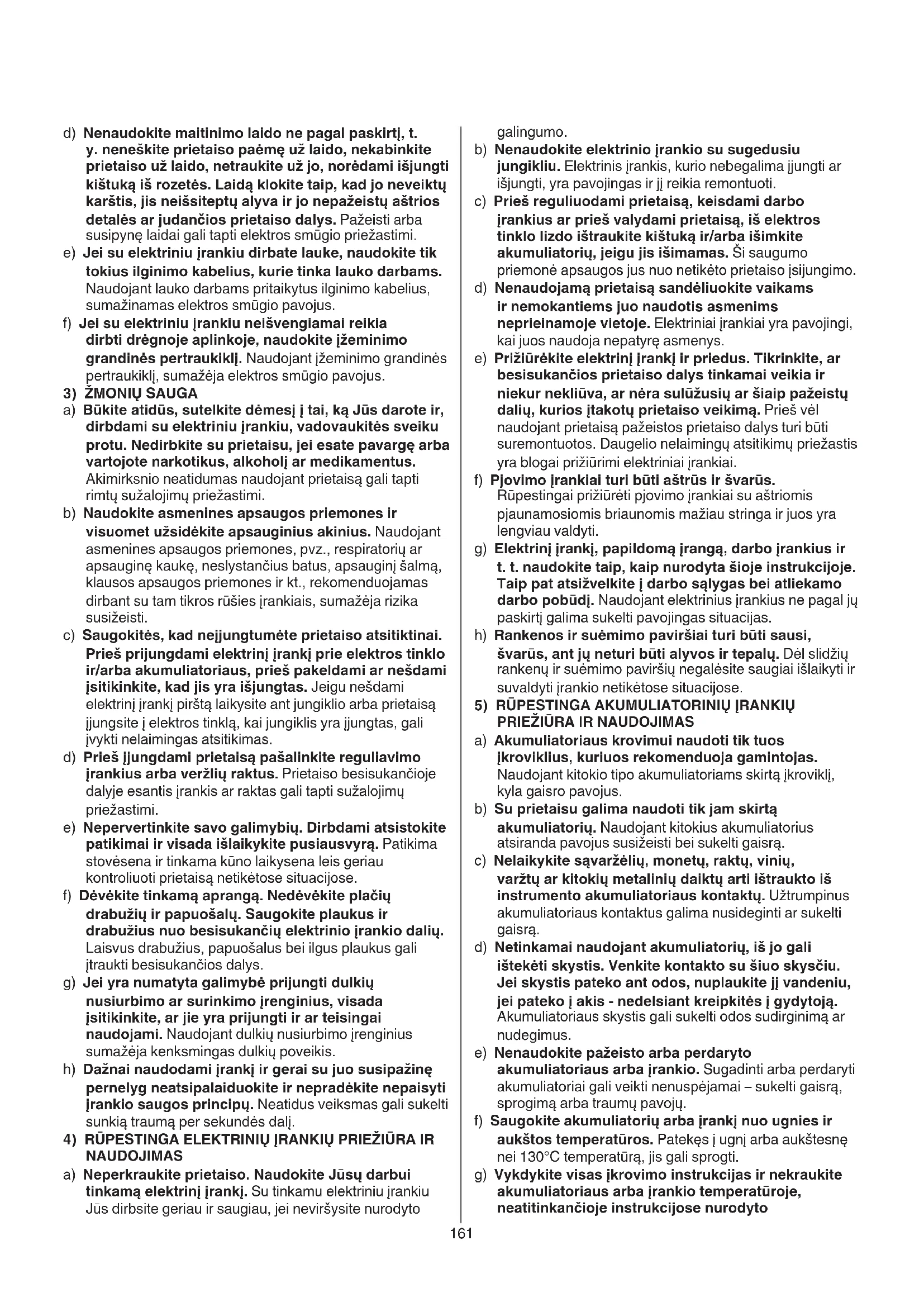a) Akumuliatoriaus krovimui naudoti tik tuos įkroviklius, kuriuos rekomenduoja gamintojas. Naudojant kitokio tipo akumuliatoriams skirtą įkroviklį, kyla gaisro pavojus. b) Su prietaisu galima naudoti tik jam skirtą akumuliatorių. Naudojant kitokius akumuliatorius atsiranda pavojus susižeisti bei sukelti gaisrą. c) Nelaikykite sąvaržėlių, monetų, raktų, vinių, varžtų ar kitokių metalinių daiktų arti ištraukto iš instrumento akumuliatoriaus kontaktų. Užtrumpinus akumuliatoriaus kontaktus galima nusideginti ar sukelti gaisrą. d) Netinkamai naudojant akumuliatorių, iš jo gali ištekėti skystis. Venkite kontakto su šiuo skysčiu. Jei skystis pateko ant odos, nuplaukite jį vandeniu, jei pateko į akis - nedelsiant kreipkitės į gydytoją. Akumuliatoriaus skystis gali sukelti odos sudirginimą ar nudegimus. e) Nenaudokite pažeisto arba perdaryto akumuliatoriaus arba įrankio. Sugadinti arba perdaryti akumuliatoriai gali veikti nenuspėjamai – sukelti gaisrą, sprogimą arba traumų pavojų. f) Saugokite akumuliatorių arba įrankį nuo ugnies ir aukštos temperatūros. Patekęs į ugnį arba aukštesnę nei 130°C temperatūrą, jis gali sprogti. g) Vykdykite visas įkrovimo instrukcijas ir nekraukite akumuliatoriaus arba įrankio temperatūroje, neatitinkančioje instrukcijose nurodyto d) Nenaudokite maitinimo laido ne pagal paskirtį, t. y. neneškite prietaiso paėmę už laido, nekabinkite prietaiso už laido, netraukite už jo, norėdami išjungti kištuką iš rozetės. Laidą klokite taip, kad jo neveiktų karštis, jis neišsiteptų alyva ir jo nepažeistų aštrios detalės ar judančios prietaiso dalys. Pažeisti arba susipynę laidai gali tapti elektros smūgio priežastimi. e) Jei su elektriniu įrankiu dirbate lauke, naudokite tik tokius ilginimo kabelius, kurie tinka lauko darbams. Naudojant lauko darbams pritaikytus ilginimo kabelius, sumažinamas elektros smūgio pavojus. f) Jei su elektriniu įrankiu neišvengiamai reikia dirbti drėgnoje aplinkoje, naudokite įžeminimo grandinės pertraukiklį. Naudojant įžeminimo grandinės pertraukiklį, sumažėja elektros smūgio pavojus.