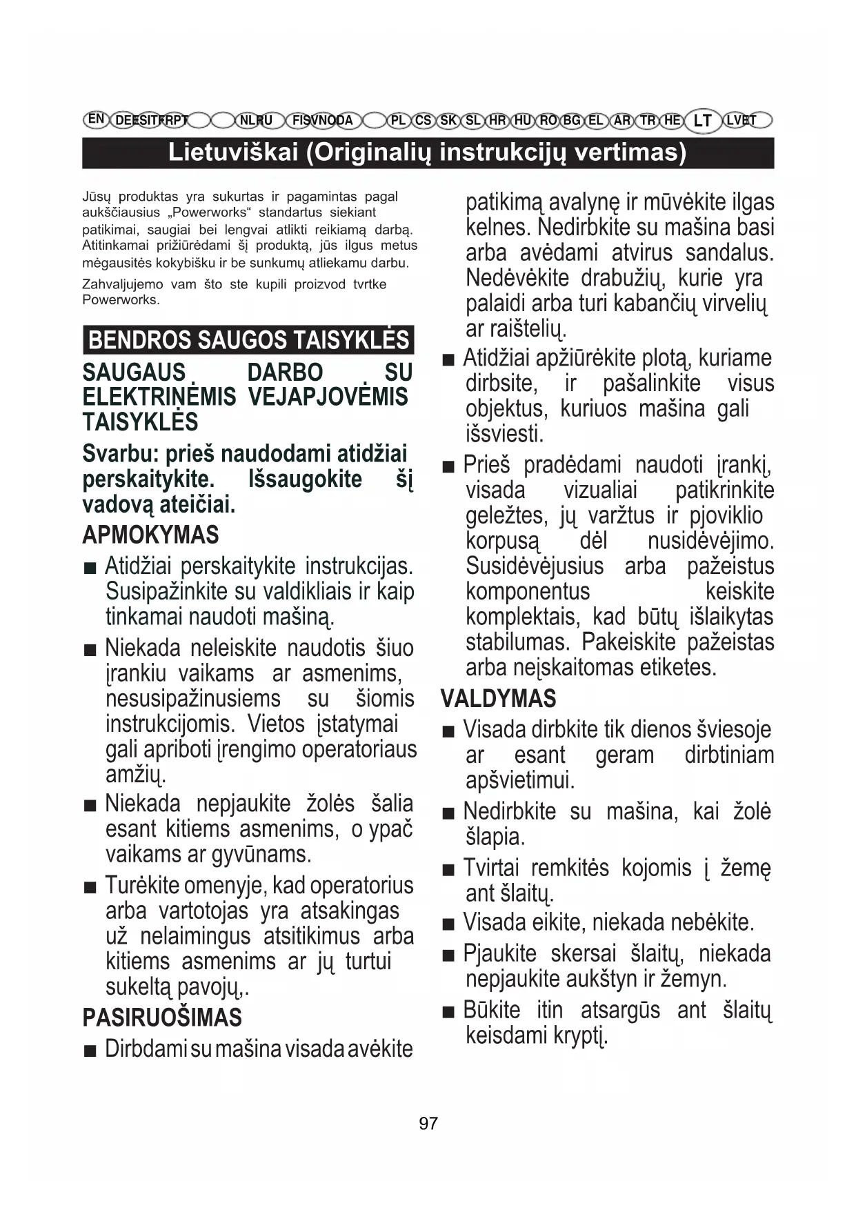 LV ET Jūsų produktas yra sukurtas ir pagamintas pagal aukščiausius „Powerworks“ standartus siekiant patikimai, saugiai bei lengvai atlikti reikiamą darbą. Atitinkamai prižiūrėdami šį produktą, jūs ilgus metus mėgausitės kokybišku ir be sunkumų atliekamu darbu. Zahvaljujemo vam što ste kupili proizvod tvrtke Powerworks.