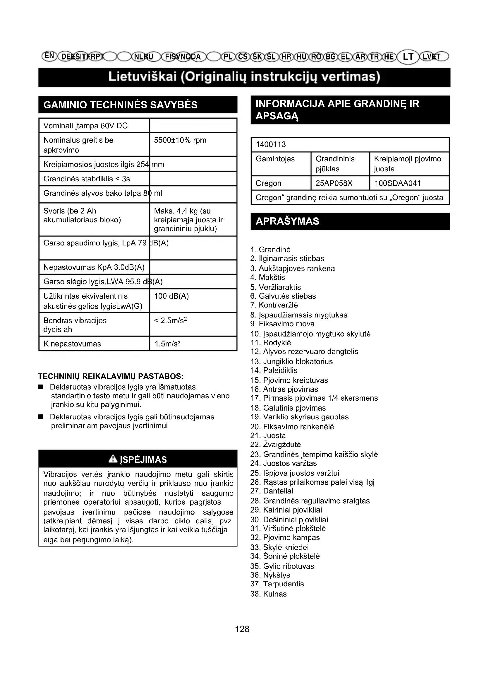 APSAGĄ 1400113Gamintojas GrandininispjūklasKreipiamoji pjovimojuostaOregon 25AP058X 100SDAA041Oregon“ grandinę reikia sumontuoti su „Oregon“ juosta APRAŠYMAS 1. Grandinė2. Ilginamasis stiebas3. Aukštapjovės rankena4. Makštis5. Veržliaraktis6. Galvutės stiebas7. Kontrveržlė8. Įspaudžiamasis mygtukas9. Fiksavimo mova10. Įspaudžiamojo mygtuko skylutė11. Rodyklė12. Alyvos rezervuaro dangtelis13. Jungiklio blokatorius14. Paleidiklis15. Pjovimo kreiptuvas16. Antras pjovimas17. Pirmasis pjovimas 1/4 skersmens18. Galutinis pjovimas19. Variklio skyriaus gaubtas20. Fiksavimo rankenėlė21. Juosta22. Žvaigždutė23. Grandinės įtempimo kaiščio skylė24. Juostos varžtas25. Išpjova juostos varžtui26. Rąstas prilaikomas palei visą ilgį27. Danteliai28. Grandinės reguliavimo sraigtas29. Kairiniai pjovikliai30. Dešininiai pjovikliai31. Viršutinė plokštelė32. Pjovimo kampas33. Skylė kniedei34. Šoninė plokštelė35. Gylio ribotuvas36. Nykštys37. Tarpudantis38. Kulnas 128HE