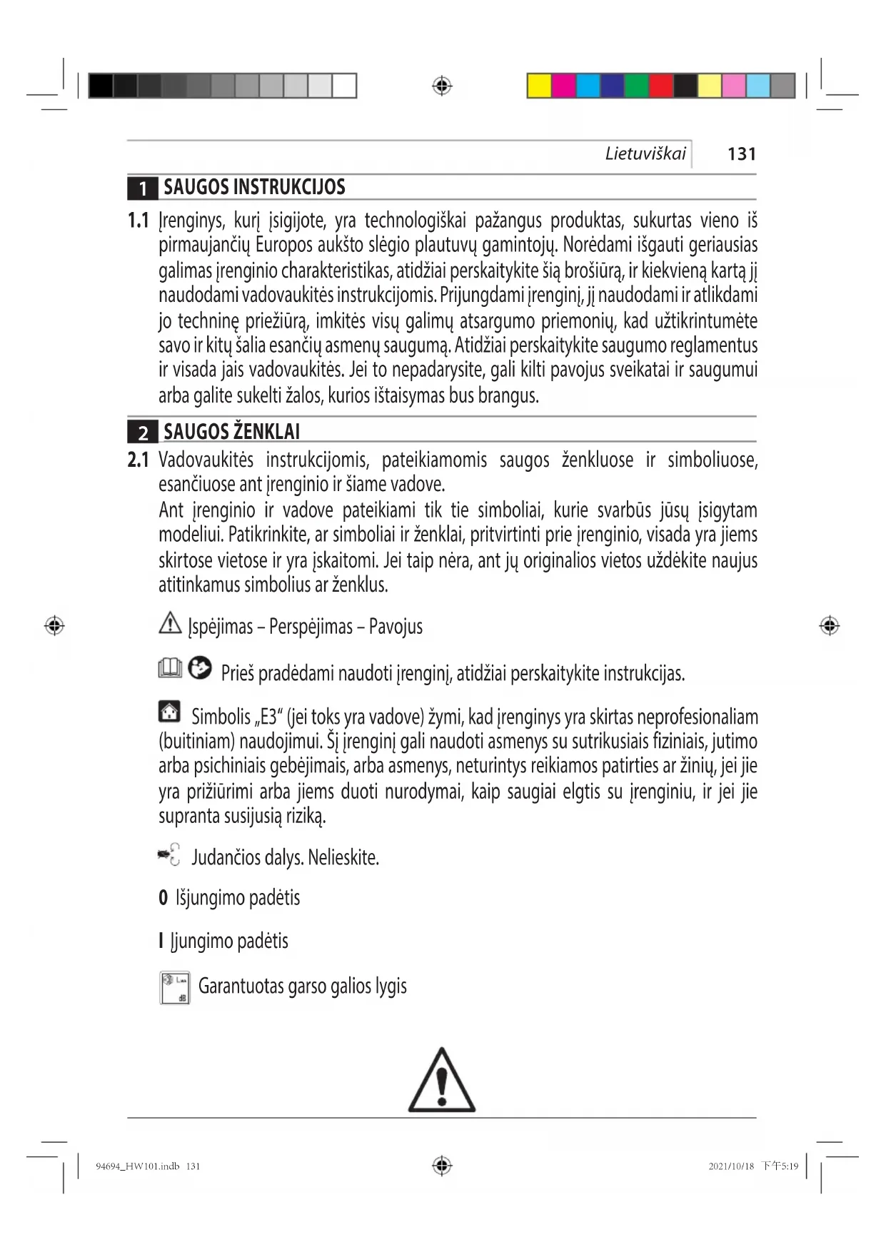 esančiuose ant įrenginio ir šiame vadove. Ant įrenginio ir vadove pateikiami tik tie simboliai, kurie svarbūs jūsų įsigytam modeliui. Patikrinkite, ar simboliai ir ženklai, pritvirtinti prie įrenginio, visada yra jiems skirtose vietose ir yra įskaitomi. Jei taip nėra, ant jų originalios vietos uždėkite naujus atitinkamus simbolius ar ženklus. Įspėjimas – Perspėjimas – Pavojus Prieš pradėdami naudoti įrenginį, atidžiai perskaitykite instrukcijas. Simbolis „E3“ (jei toks yra vadove) žymi, kad įrenginys yra skirtas neprofesionaliam (buitiniam) naudojimui. Šį įrenginį gali naudoti asmenys su sutrikusiais fiziniais, jutimo arba psichiniais gebėjimais, arba asmenys, neturintys reikiamos patirties ar žinių, jei jie yra prižiūrimi arba jiems duoti nurodymai, kaip saugiai elgtis su įrenginiu, ir jei jie supranta susijusią riziką. Judančios dalys. Nelieskite. 0 Išjungimo padėtis I Įjungimo padėtis Garantuotas garso galios lygis 94694_HW101.indb 13194694_HW101.indb 131 2021/10/18 下午5:192021/10/18 下午5:19132 Lietuviškai Draudimo ženklas, informuojantis naudotojus, kad vietos teisės aktai gali drausti prijungti produktą prie geriamojo vandens tiekimo sistemos. Pavojaus ženklas, įspėjantis naudotojus, kad negalima nukreipti vandens srovės į žmones, gyvūnus, elektros įrangą arba patį produktą. Šio produkto izoliacija priskiriama II klasei. Tai reiškia, kad jis turi sustiprintą arba dvigubą izoliaciją (tik jei simbolis yra ant įrenginio). Produktas atitinka susijusias Europos direktyvas. Simbolis „E1“ žymi, kad įrenginio negalima šalinti kaip buitinių atliekų. Jis gali būti perduotas platintojui įsigyjant naują įrenginį. Įrenginio elektrinės ir elektroninės detalės negali būti pakartotinai panaudojamos netinkamais tikslais, nes jose yra medžiagų, keliančių pavojų sveikatai. Taikoma tik ES šalims Kadangi įrangoje yra pavojingų komponentų, panaudota elektrinė ir elektroninė įranga gali turėti neigiamo poveikio aplinkai ir žmonių sveikatai. Nešalinkite elektros ir elektroninių prietaisų kartu su buitinėmis atliekomis! Pagal Europos direktyvą dėl elektros ir elektroninės įrangos atliekų ir jos pritaikymą nacionaliniams įstatymams, panaudota elektros ir elektroninė įranga turi būti surenkama atskirai ir pristatoma į atskirą buitinių atliekų surinkimo punktą, kuris veikia pagal aplinkos apsaugos taisykles. Tai rodo perbrauktas konteinerio ant ratukų simbolis, pateiktas ant įrangos. Užsidėti ausines. Užsidėti apsauginę kaukę. Naudoti kvėpavimo takų apsaugą. Mūvėti apsaugines pirštines. Avėti apsauginę avalynę. Dėvėti apsauginius drabužius 94694_HW101.indb 13294694_HW101.indb 132 2021/10/18 下午5:192021/10/18 下午5:19133 Lietuviškai