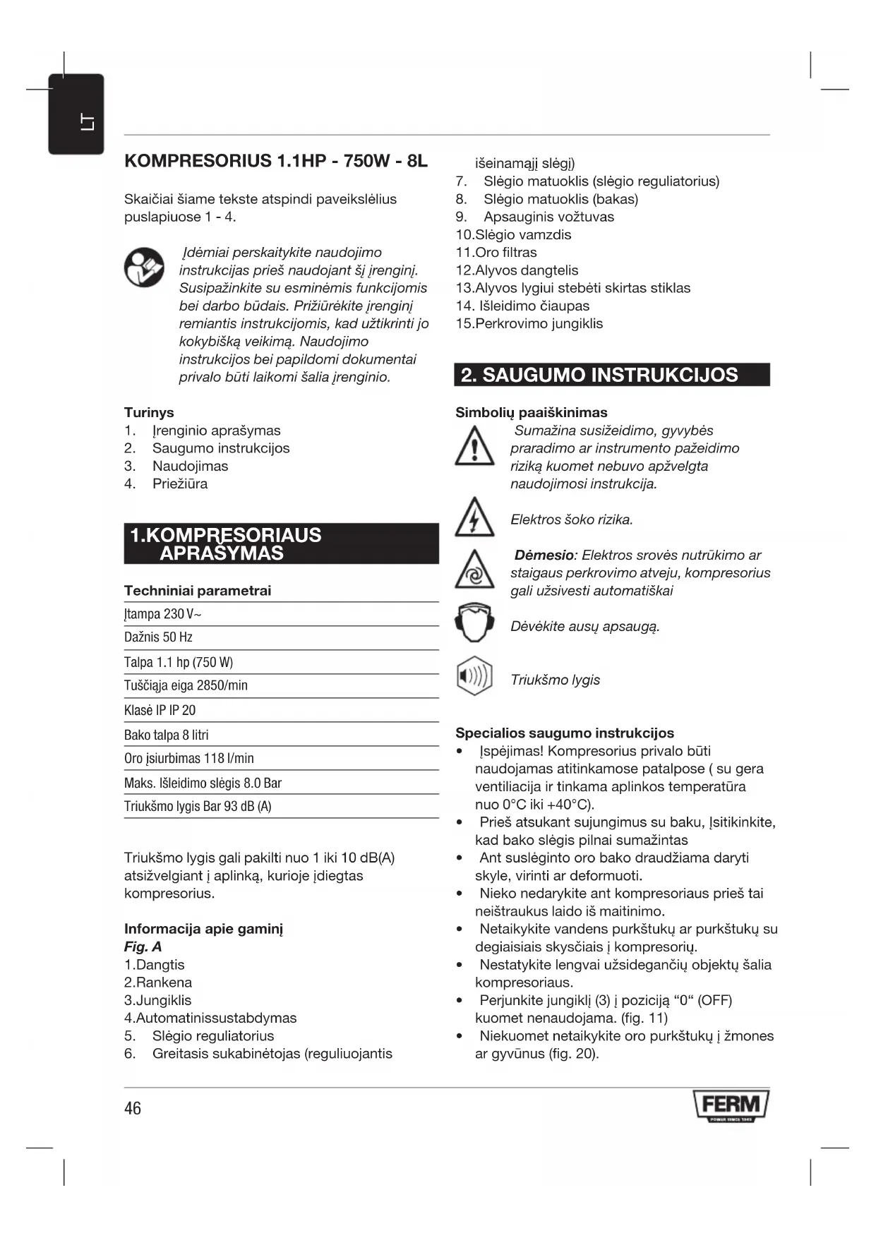 APRAŠYMAS Techniniai parametrai Įtampa 230 V~ Dažnis 50 Hz Talpa 1.1 hp (750 W) Tuščiąja eiga 2850/min Klasė IP IP 20 Bako talpa 8 litri Oro įsiurbimas 118 l/min Maks. Išleidimo slėgis 8.0 Bar Triukšmo lygis Bar 93 dB (A) Triukšmo lygis gali pakilti nuo 1 iki 10 dB(A) atsižvelgiantįaplinką,kuriojeįdiegtas kompresorius. Informacija apie gaminį Fig. A