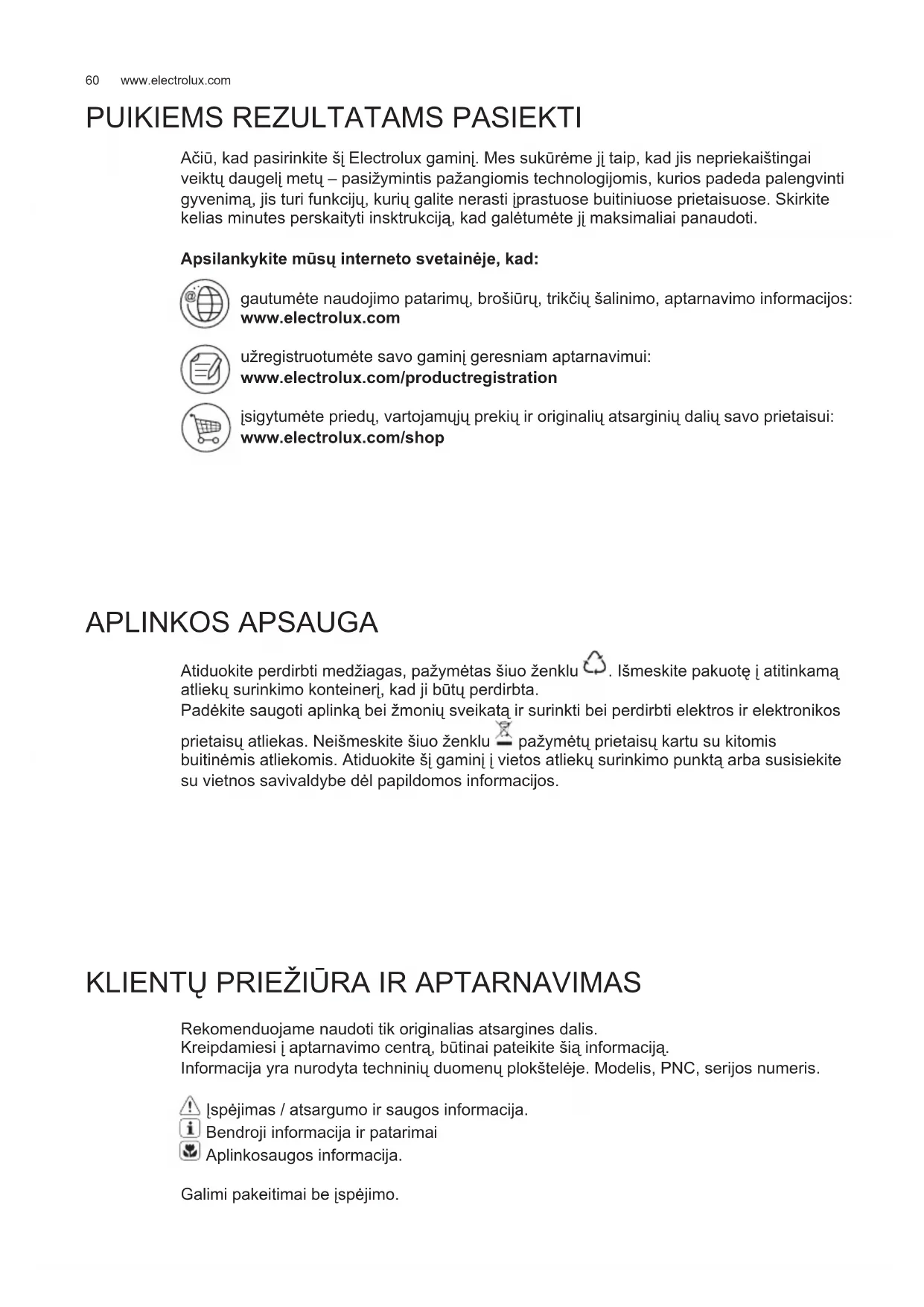 Rekomenduojame naudoti tik originalias atsargines dalis. Kreipdamiesi į aptarnavimo centrą, būtinai pateikite šią informaciją. Informacija yra nurodyta techninių duomenų plokštelėje. Modelis, PNC, serijos numeris. Įspėjimas / atsargumo ir saugos informacija. Bendroji informacija ir patarimai Aplinkosaugos informacija. Galimi pakeitimai be įspėjimo.