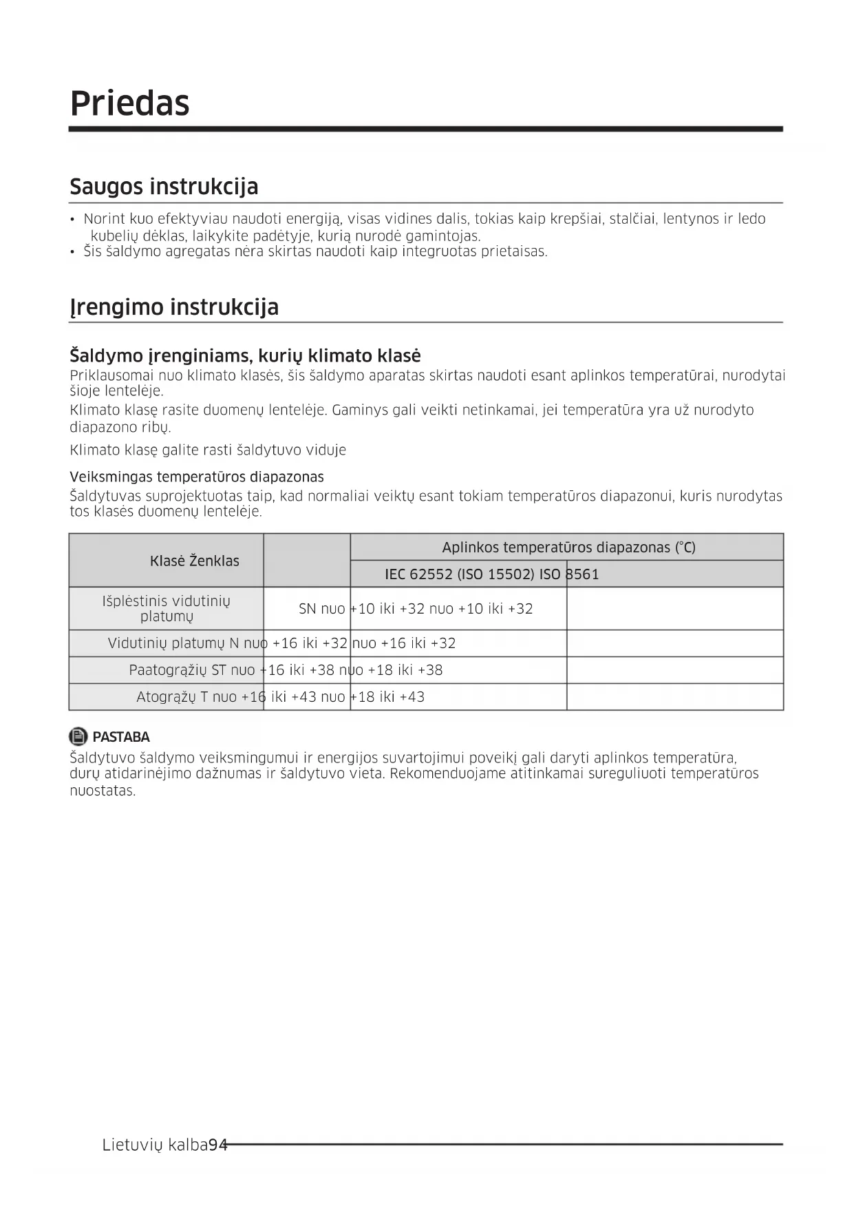 Išplėstinis vidutinių platumų SN nuo +10 iki +32 nuo +10 iki +32 Vidutinių platumų N nuo +16 iki +32 nuo +16 iki +32 Paatogrąžių ST nuo +16 iki +38 nuo +18 iki +38 Atogrąžų T nuo +16 iki +43 nuo +18 iki +43 PASTABA Šaldytuvo šaldymo veiksmingumui ir energijos suvartojimui poveikį gali daryti aplinkos temperatūra, durų atidarinėjimo dažnumas ir šaldytuvo vieta. Rekomenduojame atitinkamai sureguliuoti temperatūros nuostatas.Lietuvių kalba 95 Temperatūros instrukcija Rekomenduojama temperatūra Optimalus temperatūros nustatymas maistui laikyti: