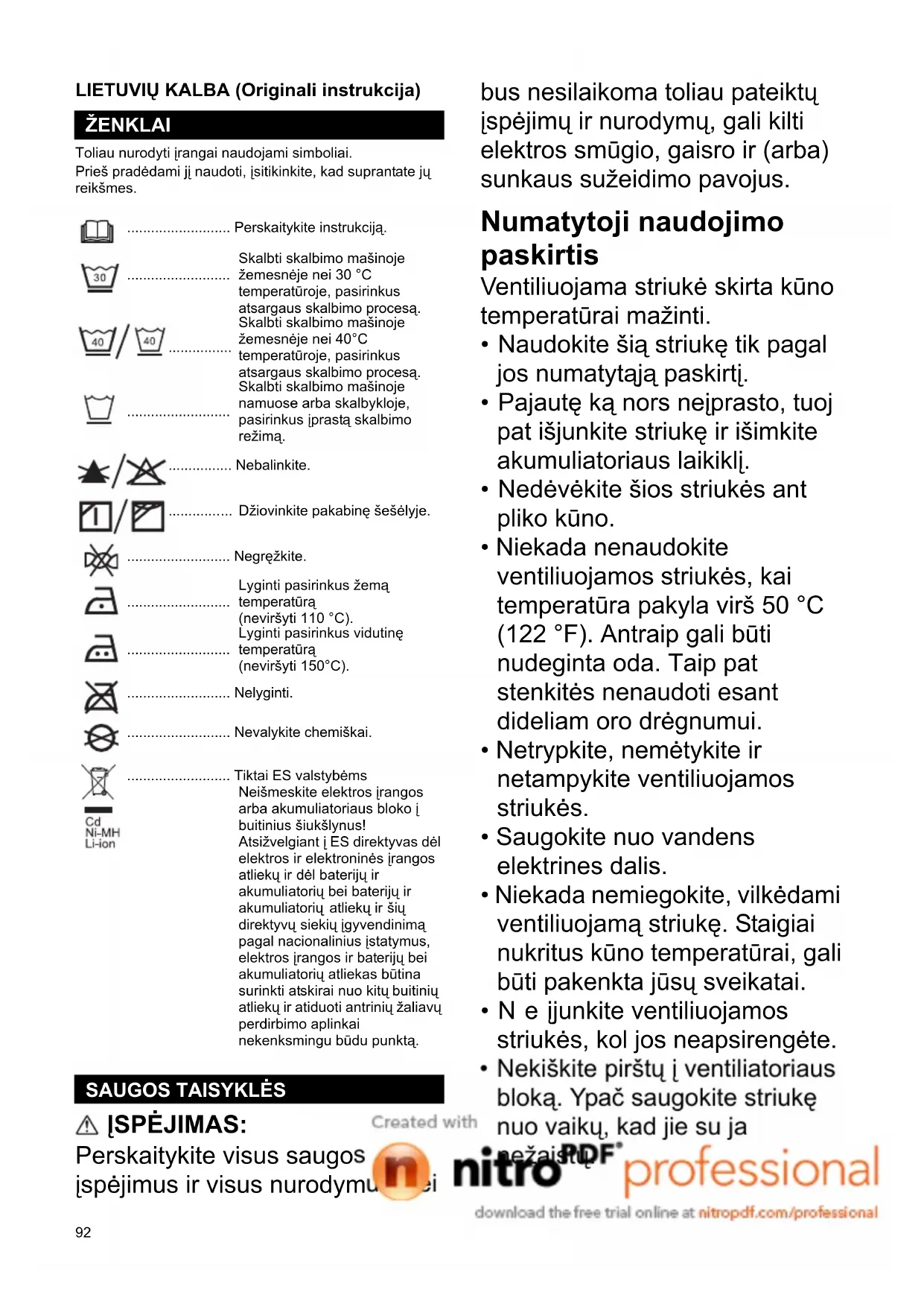 - Niekada nenaudokite ventiliuojamos striukės, kai temperatūra pakyla virš 50 °C (122 °F). Antraip gali būti nudeginta oda. Taip pat stenkitės nenaudoti esant dideliam oro drėgnumui.