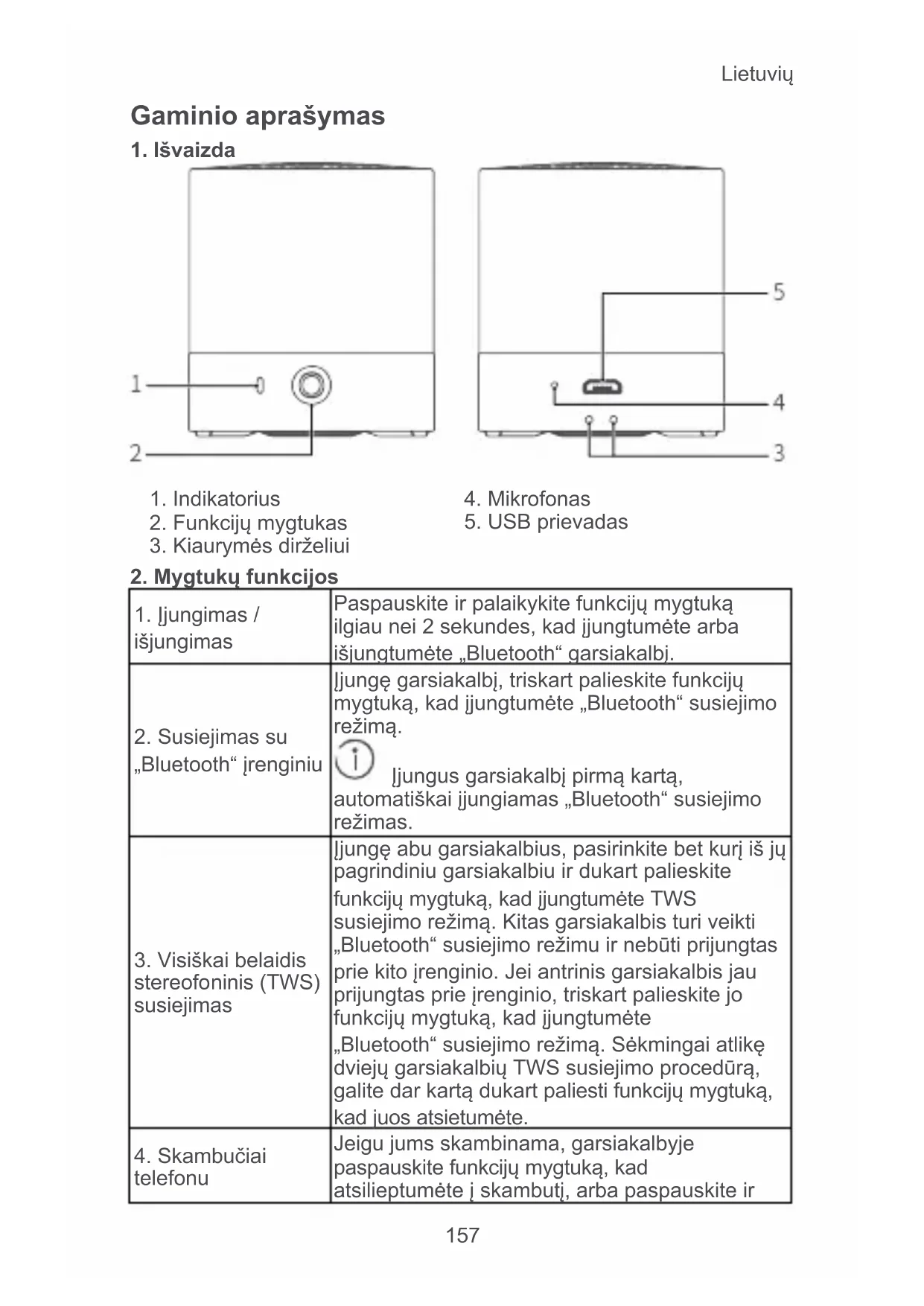 „Bluetooth“ susiejimo režimas Mirksi mėlyna spalva Prisijungta Nuolat šviečia mėlyna spalva Senka akumuliatorius Mirksi raudona spalva kas 3 sekundes kartu su nuolat šviečiančia arba mirksinčia mėlyna šviesa Įkraunama (Garsiakalbis išjungtas) Nuolat šviečia raudona spalva įkrovimo metu ir nuolat šviečia mėlyna spalva, kai garsiakalbis visiškai įkrautas Įkraunama (Garsiakalbis įjungtas) Nuolat šviečia raudona spalva 5 sekundes, tada grąžinama ankstesnė indikatoriaus būsena Nuolat šviečia arba mirksi mėlyna spalva, kai senka akumuliatorius Skambinimas Mirksi mėlyna spalva, kai priimamas skambutis, ir lieka šviesti mėlyna spalva pokalbio metu Muzikos grojimas Nuolat šviečia mėlyna spalva TWS susiejimo Pagrindiniame garsiakalbyje pakaitomis mirksiLietuvių