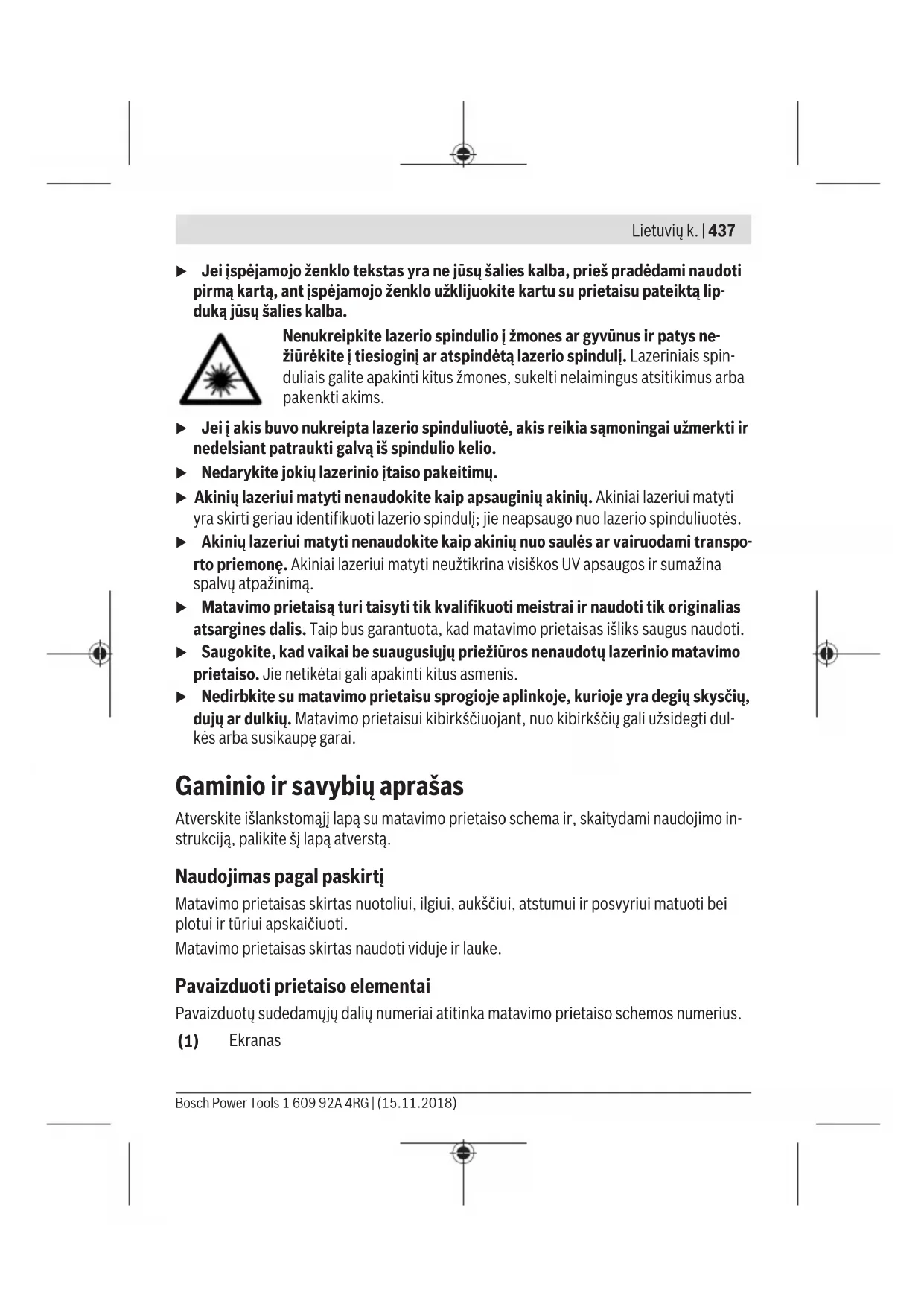 Norėdami išeiti iš meniu punkto, paspauskite įjungimo-išjungimo mygtuką (5) [ ]. Mata- vimo prietaisą išjungus, pasirinktas nustatymas išsaugomas. Garso įjungimas arba išjungimas Esant pagrindiniams nustatymams, garsas yra įjungtas. Matavimo prietaisą įjunkite. Norėdami patekti į meniu „Pagrindiniai nustatymai“ , laikykite paspaustą mygtuką (7) [Func]. Pasirinkite . Norėdami įjungti arba išjungti garsą, paspauskite mygtuką (3) [+] arba mygtuką (8) [–]. Norėdami išeiti iš meniu punkto, paspauskite matavimo mygtuką (2) [ ] arba įjungimo- išjungimo mygtuką (5) [ ]. Matavimo prietaisą išjungus, pasirinktas nustatymas išsau- gomas. Darbo patarimai Bendrieji nurodymai Matavimo metu jokiu būdu neuždenkite priėmimo lęšio (14) ir lazerio spindulio išėjimo angos (15). Matavimo prietaiso matuojant judinti negalima. Todėl matavimo prietaisą priglauskite prie kaip galima tvirtesnės atramos ar atraminio paviršiaus. Lietuvių k. | 447 Bosch Power Tools 1 609 92A 4RG | (15.11.2018)448 | Lietuvių k. 1 609 92A 4RG | (15.11.2018) Bosch Power Tools Įtaka matavimo diapazonui Matavimo diapazonas priklauso nuo šviesos sąlygų ir nusitaikymo paviršiaus atspindžio. Esant ryškiam pašalinės šviesos šaltiniui, kad geriau matytumėte lazerio spindulį, naudo- kite akinius lazerio matomumui pagerinti (17) (papildoma įranga) ir lazerio taikinio lente- lę (16) (papildoma įranga), arba nusitaikymo plote sudarykite šešėlį. Įtaka matavimo rezultatams Dėl fizikinių veiksnių, matuojant įvairių paviršių plotus, matavimai gali būti klaidingi. Tai gali pasitaikyti, matuojant: – permatomus paviršius (pvz., stiklą, vandenį), – veidrodinius paviršius (pvz., poliruotą metalą, stiklą), – akytus paviršius (pvz., izoliacines medžiagas), – struktūrinius paviršius (pvz., struktūrinį tinką, natūralų akmenį). Jei reikia, matuodami šiuos paviršius naudokite lazerio nusitaikymo lentelę (16) (papil- doma įranga). Matavimo rezultatai gali būti klaidingi taip pat, jei kreivai nusitaikoma į nusitaikymo pavi- ršių. Matavimo vertei įtakos taip pat gali padaryti skirtingų temperatūrų oro sluoksniai arba netiesiogiai sugauti atspindžiai. Posvyrio matavimo tikslumo tikrinimas ir kalibravimas (žr. E1–E2 pav.) Reguliariai tikrinkite posvyrio matavimo tikslumą. Tai atliekama dviem matavimais. Tuo tikslus, matavimo prietaisą padėkite ant stalo ir išmatuokite posvyrį. Matavimo prietaisą pasukite 180° ir dar kartą išmatuokite posvyrį. Parodytų verčių skirtumas turi būti ne di- desnis kaip 0,3°. Esant didesniems nuokrypiams, matavimo prietaisą turite iš naujo sukalibruoti. Tuo tikslu nustatymuose pasirinkite . Sekite nurodymus ekrane. Po didelių temperatūros svyravimų ir smūgių rekomenduojame atlikti matavimo prietaiso tikslumo patikrą ir, jei reikia, sukalibruoti. Pasikeitus temperatūrai, prieš atliekant kalib- ravimą reikia palaukti, kol susivienodins matavimo prietaiso ir aplinkos temperatūra. Atstumo matavimo tikslumo tikrinimas Matavimo prietaiso tikslumą galite patikrinti kaip aprašyta toliau: – Pasirinkite nekintamą, maždaug nuo 3 iki 10m ilgio matavimo atstumą, kurio ilgis jums tiksliai žinomas (pvz., patalpos plotis, durų anga). Matavimą reikia atlikti geromis sąlygomis, t. y., matuojama atkarpa turi būti patalpos viduje su silpnu fono apšvieti- mu, o matavimo nusitaikymo paviršius – lygus ir gerai atspindintis. – Išmatuokite šią atkarpą 10 kartų iš eilės.Matuojant geromis sąlygomis, visoje atkarpoje atskirų matavimų nuokrypis nuo vidutinės vertės turi būti ne didesnis kaip ±4mm. Užregistruokite matavimo rezultatus protokole, kad ir vėliau galėtumėte palyginti tikslumą. Darbas su stovu (papildoma įranga) Stovas ypač reikalingas matuojant dideliu atstumu. Matavimo prietaisą 1/4" sriegiu (13) prisukite prie stovo (18) greitojo keitimo plokštelės arba prie standartinio trikojo stovo. Tvirtai užveržkite greitojo keitimo plokštės fiksuojamuoju varžtu. Nustatykite atitinkamai matavimams su stovu skirtą bazinę plokštumą, t. y. paspauskite mygtuką (4) (bazinė plokštuma: sriegis). Klaidos pranešimas Jei matavimo negalima atlikti tinkamai, ekrane parodomas klaidos pranešimas „Error“. Matavimo prietaisą išjunkite, vėl įjunkite ir iš naujo pradėkite matavimą. Matavimo prietaisas kiekvieno matavimo metu kontroliuoja, ar funkcija atliekama tinkamai. Nustačius pažeidimą, ekrane rodomas tik šalia esan- tis simbolis ir matavimo prietaisas išsijungia. Tokiu atveju kreipkitės į prekybos atstovą, kad matavimo prietaisą pristatytų į Bosch klientų ap- tarnavimo skyrių. Priežiūra ir servisas Priežiūra ir valymas Matavimo prietaisas visuomet turi būti švarus. Nepanardinkite matavimo prietaiso į vandenį ir kitokius skysčius. Visus nešvarumus nuvalykite drėgnu minkštu skudurėliu. Nenaudokite valymo priemonių ir tirpiklių. Ypatingai prižiūrėkite priėmimo lęšį (14) – taip pat rūpestingai, kaip prižiūrimi akiniai arba fotoaparato lęšis. Atsiradus defektui ar prireikus matavimo prietaisą remontuoti, jį išsiųskite į įgaliotą Bosch klientų aptarnavimo tarnybą. Klientų aptarnavimo skyrius ir konsultavimo tarnyba Klientų aptarnavimo skyriuje gausite atsakymus į klausimus, susijusius su jūsų gaminio remontu, technine priežiūra bei atsarginėmis dalimis. Detalius brėžinius ir informacijos apie atsargines dalis rasite interneto puslapyje: www.bosch-pt.com Lietuvių k. | 449 Bosch Power Tools 1 609 92A 4RG | (15.11.2018)450 | Lietuvių k. 1 609 92A 4RG | (15.11.2018) Bosch Power Tools Bosch konsultavimo tarnybos specialistai mielai pakonsultuos Jus apie gaminius ir jų pa- pildomą įrangą. Ieškant informacijos ir užsakant atsargines dalis prašome būtinai nurodyti dešimtženklį gaminio numerį, esantį firminėje lentelėje. Lietuva Bosch įrankių servisas Informacijos tarnyba: (037) 713350 ļrankių remonta