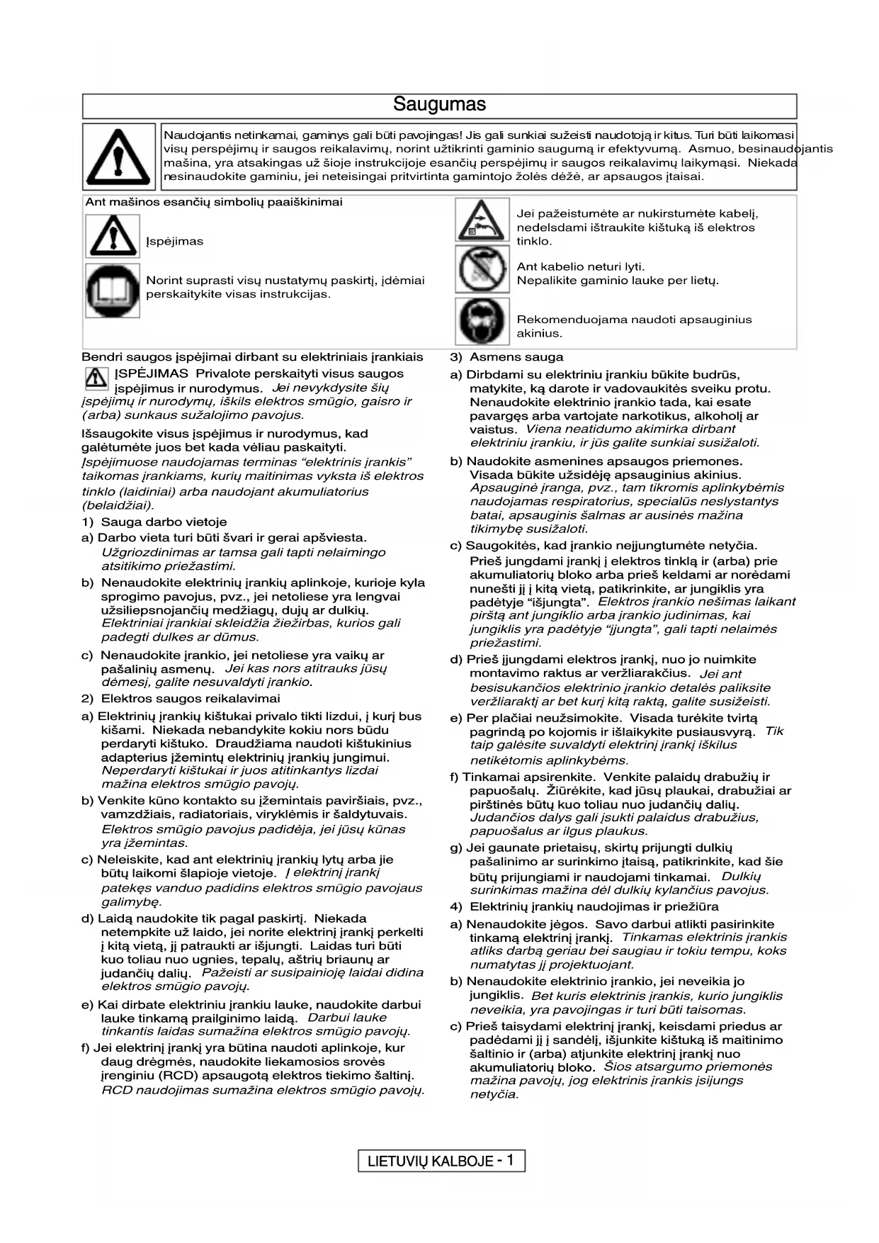 a) Nenaudokite jėgos. Savo darbui atlikti pasirinkite tinkamą elektrinį įrankį. Tinkamas elektrinis įrankis atliks darbą geriau bei saugiau ir tokiu tempu, koks numatytas jį projektuojant. b) Nenaudokite elektrinio įrankio, jei neveikia jo jungiklis. Bet kuris elektrinis įrankis, kurio jungiklis neveikia, yra pavojingas ir turi būti taisomas. c) Prieš taisydami elektrinį įrankį, keisdami priedus ar padėdami jį į sandėlį, išjunkite kištuką iš maitinimo šaltinio ir (arba) atjunkite elektrinį įrankį nuo akumuliatorių bloko. Šios atsargumo priemonės mažina pavojų, jog elektrinis įrankis įsijungs netyčia. Naudojantis netinkamai, gaminys gali būti pavojingas! Jis gali sunkiai sužeisti naudotoją ir kitus. Turi būti laikomasi visų perspėjimų ir saugos reikalavimų, norint užtikrinti gaminio saugumą ir efektyvumą. Asmuo, besinaudojantismašina, yra atsakingas už šioje instrukcijoje esančių perspėjimų ir saugos reikalavimų laikymąsi. Niekada esinaudokite gaminiu, jei neteisingai pritvirtinta gamintojo žolės dėžė, ar apsaugos įtaisai. LIETUVIŲ KALBOJE