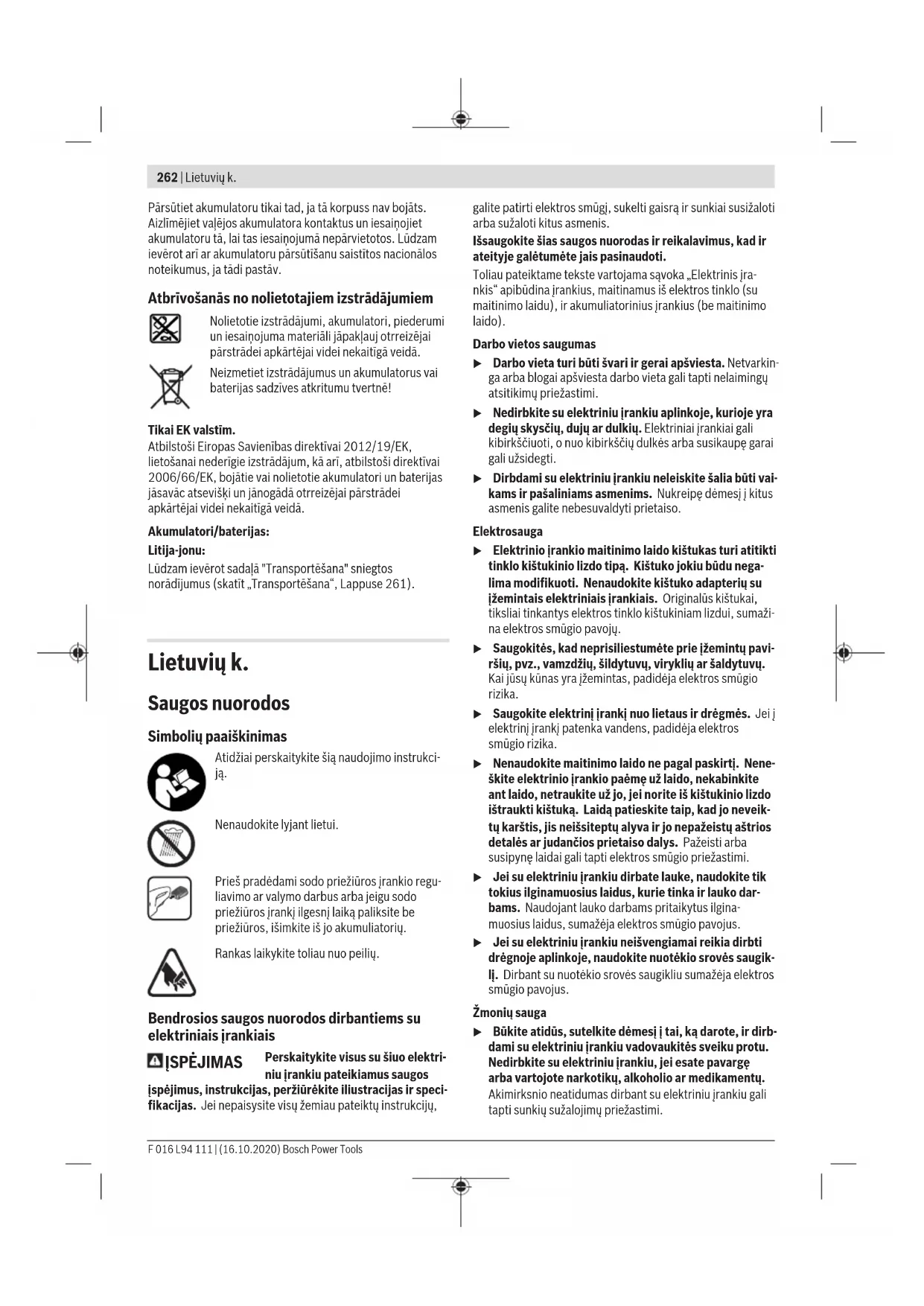 Pažeistas kištukinis lizdas, maitinimo laidas arba kroviklis Patikrinkite maitinimo įtampą, jei reikia, dėl kroviklio patikrinimo kreipkitės į autorizuotas Bosch elektrinių įrankių remonto dirbtuves Bosch Power Tools F 016 L94 111 | (16.10.2020)270 | Lietuvių k. Priežiūra ir servisas Techninė priežiūra, valymas ir sandėliavimas u Prieš pradėdami bet kokius sodo priežiūros įrankio tvarkymo darbus (pvz., techninės priežiūros, įrankio keitimo ar kt.), o taip pat norėdami transportuoti ar padėti sandėliuoti, iš sodo priežiūros įrankio išimkite akumuliatorių. Netyčia įjungus įjungimo-išjungimo jun- giklį iškyla susižalojimo pavojus. u Kad galėtumėte gerai ir saugiai dirbti, gaminį visada laikykite švarų. Ant sodo priežiūros įrankio nedėkite jokių daiktų. Kad galėtumėte gerai ir saugiai dirbti, pasirūpinkite, kad ga- minys ir jo ventiliacinės angos būtų švarūs. Gaminio niekada neapipurkškite vandeniu. Gaminio niekada nepanardinkite į vandenį. Gaminį laikykite saugioje, sausoje ir vaikams neprieinamoje vietoje. Ant gaminio nedėkite jokių kitų daiktų. Užtikrinkite, kad būtų tinkamai priveržtos visos veržlės, sraigtai ir varžtai, kad gaminys būtų saugus naudoti. Patikrinkite gaminį ir dėl saugumo pakeiskite susidėvėjusias ir pažeistas dalis. Įsitikinkite, kad keičiamos dalys yra Bosch pagamintos ar leistos naudoti. Akumuliatoriaus priežiūra Kad akumuliatorius būtų optimaliai naudojamas, laikykitės šių reikalavimų ir nurodymų: – Saugokite akumuliatorių nuo drėgmės ir vandens. – Sodo priežiūros įrankį laikykite nuo –20 °C ik 50 °C tem- peratūroje. Pvz., vasarą nepalikite akumuliatoriaus auto- mobilyje. – Akumuliatorių laikykite ne sodo priežiūros įrankyje, o išimtą atskirai. – Tiesiogiai šviečiant saulei, akumuliatoriaus sodo priežiū- ros įrankyje nepalikite. – Optimali akumuliatoriaus sandėliavimo temperatūra yra 5°C. – Akumuliatoriaus ventiliacines angas valykite minkštu, šva- riu ir sausu teptuku. Jei veikimo laikas po įkrovimo pastebimai sutrumpėja, vadi- nasi akumuliatorius susidėvėjo ir jį reikia pakeisti. Klientų aptarnavimo skyrius ir konsultavimo tarnyba Klientų aptarnavimo skyriuje gausite atsakymus į klausimus, susijusius su jūsų gaminio remontu, technine priežiūra bei at- sarginėmis dalimis. Detalius brėžinius ir informacijos apie at- sargines dalis rasite interneto puslapyje: www.bosch- pt.com Bosch konsultavimo tarnybos specialistai mielai pakonsul- tuos Jus apie gaminius ir jų papildomą įrangą. Ieškant informacijos ir užsakant atsargines dalis prašome bū- tinai nurodyti dešimtženklį gaminio numerį, esantį firminėje lentelėje. Lietuva Bosch įrankių servisas Informacijos tarnyba: (037) 713350 ļrankių remontas: (037) 713352 Faksas: (037) 713354 El. paštas: service-pt@lv.bosch.com Kitus techninės priežiūros skyriaus adresus rasite čia: www.bosch-pt.com/serviceaddresses Transportavimas Kartu pateikiamų ličio jonų akumuliatorių gabenimui taiko- mos pavojingų krovinių gabenimą reglamentuojančių įstaty- mų nuostatos. Naudotojui akumuliatorius gabenti keliais lei- džiama be jokių apribojimų. Jei siunčiant pasitelkiami tretieji asmenys (pvz., oro transpo- rtas, ekspedijavimo įmonė), būtina atsižvelgti į pakuotei ir ženklinimui taikomus ypatingus reikalavimus. Būtina, kad rengiant siuntą dalyvautų pavojingų krovinių gabenimo spe- cialistas. Siųskite tik tokius akumuliatorius, kurių nepažeistas kor- pusas. Apklijuokite kontaktus ir supakuokite akumuliatorių taip, kad jis pakuotėje nejudėtų. Taip pat laikykitės ir esamų papildomų nacionalinių taisyklių. Šalinimas Gaminiai, akumuliatoriai, papildoma įranga ir pakuotės turi būti ekologiškai utilizuojami. Gaminių, akumuliatorių / baterijų nemeskite į buitinių atliekų konteinerius! Tik ES šalims: Pagal Europos direktyvą 2012/19/ES, naudoti nebetinkami gaminiai ir, pagal Europos direktyvą 2006/66/EB, pažeisti ir išeikvoti akumuliatoriai / baterijos turi būti surenkami atski- rai ir perdirbami aplinkai nekenksmingu būdu. Akumuliatoriai ir baterijos: Ličio jonų: prašome laikytis transportavimo skyriuje pateiktų nuorodų (žr. „Transportavimas“, Puslapis270). F 016 L94 111 | (16.10.2020) Bosch Power Toolsيبرع | 271