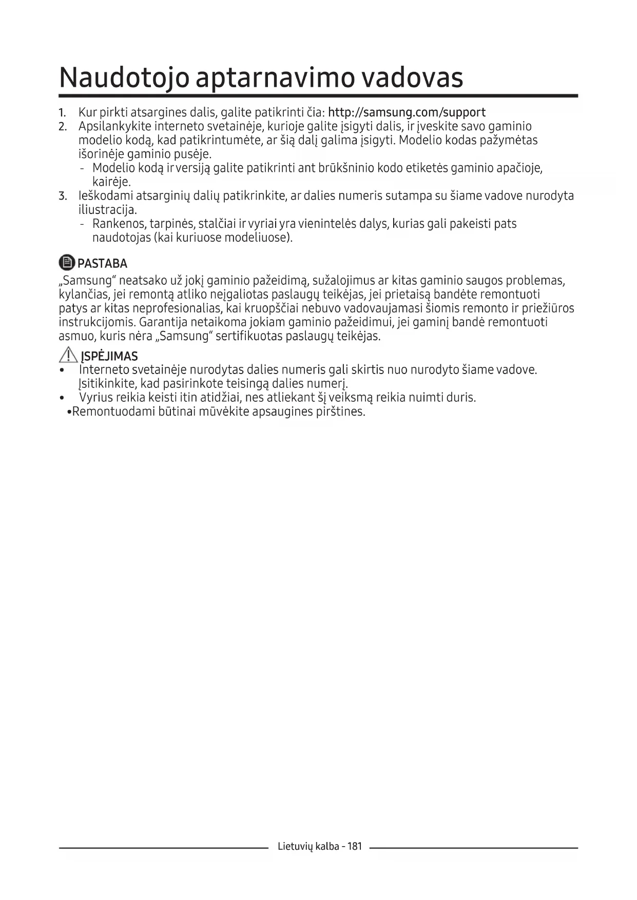 iliustracija. ‐ Rankenos, tarpinės, stalčiai ir vyriai yra vienintelės dalys, kurias gali pakeisti pats naudotojas (kai kuriuose modeliuose). PASTABA „Samsung“ neatsako už jokį gaminio pažeidimą, sužalojimus ar kitas gaminio saugos problemas, kylančias, jei remontą atliko neįgaliotas paslaugų teikėjas, jei prietaisą bandėte remontuoti patys ar kitas neprofesionalias, kai kruopščiai nebuvo vadovaujamasi šiomis remonto ir priežiūros instrukcijomis. Garantija netaikoma jokiam gaminio pažeidimui, jei gaminį bandė remontuoti asmuo, kuris nėra „Samsung“ sertifikuotas paslaugų teikėjas. ĮSPĖJIMAS