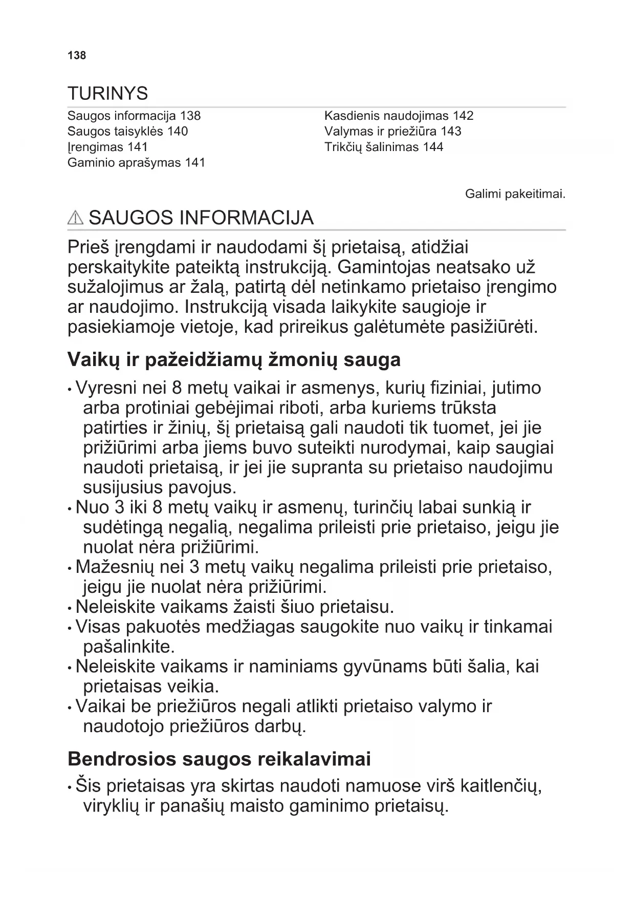 - Vaikai be priežiūros negali atlikti prietaiso valymo ir naudotojo priežiūros darbų. Bendrosios saugos reikalavimai