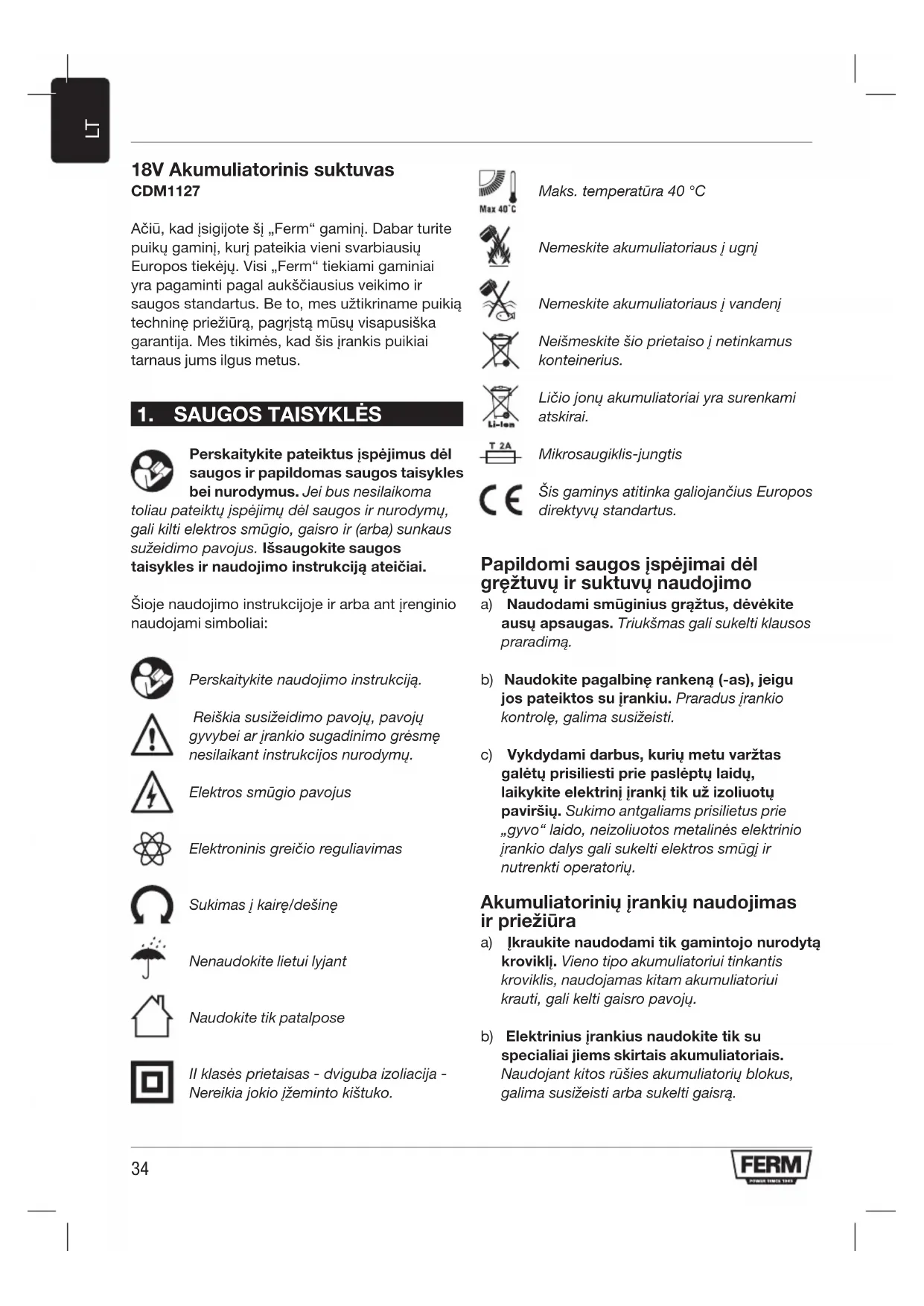 18V Akumuliatorinis suktuvas CDM1127 Ačiū, kad įsigijote šį „Ferm“ gaminį. Dabar turite puikų gaminį, kurį pateikia vieni svarbiausių Europos tiekėjų. Visi „Ferm“ tiekiami gaminiai yra pagaminti pagal aukščiausius veikimo ir saugos standartus. Be to, mes užtikriname puikią techninę priežiūrą, pagrįstą mūsų visapusiška garantija. Mes tikimės, kad šis įrankis puikiai tarnaus jums ilgus metus.