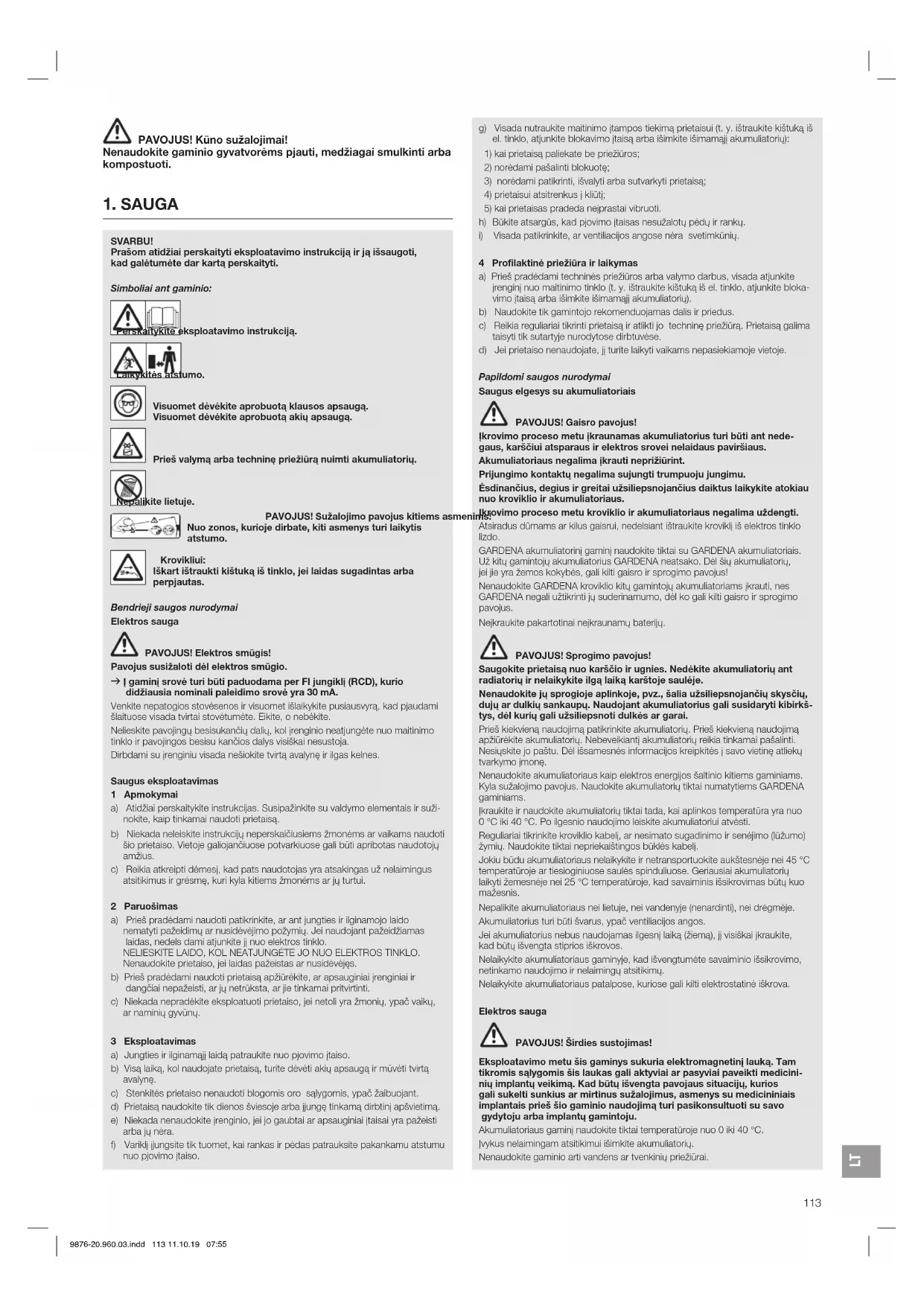 4 Profilaktinė priežiūra ir laikymas a) Prieš pradėdami techninės priežiūros arba valymo darbus, visada atjunkite įrenginį nuo maitinimo tinklo (t. y. ištraukite kištuką iš el. tinklo, atjunkite bloka- vimo įtaisą arba išimkite išimamąjį akumuliatorių). b) Naudokite tik gamintojo rekomenduojamas dalis ir priedus. c) Reikia reguliariai tikrinti prietaisą ir atlikti jo techninę priežiūrą. Prietaisą galima taisyti tik sutartyje nurodytose dirbtuvėse. d) Jei prietaiso nenaudojate, jį turite laikyti vaikams nepasiekiamoje vietoje. Papildomi saugos nurodymai Saugus elgesys su akumuliatoriais PAVOJUS! Gaisro pavojus! Įkrovimo proceso metu įkraunamas akumuliatorius turi būti ant nede- gaus, karščiui atsparaus ir elektros srovei nelaidaus paviršiaus. Akumuliatoriaus negalima įkrauti neprižiūrint. Prijungimo kontaktų negalima sujungti trumpuoju jungimu. Ėsdinančius, degius ir greitai užsiliepsnojančius daiktus laikykite atokiau nuo kroviklio ir akumuliatoriaus. Įkrovimo proceso metu kroviklio ir akumuliatoriaus negalima uždengti. Atsiradus dūmams ar kilus gaisrui, nedelsiant ištraukite kroviklį iš elektros tinklo lizdo. GARDENA akumuliatorinį gaminį naudokite tiktai su GARDENA akumuliatoriais. Už kitų gamintojų akumuliatorius GARDENA neatsako. Dėl šių akumuliatorių, jei jie yra žemos kokybės, gali kilti gaisro ir sprogimo pavojus! Nenaudokite GARDENA kroviklio kitų gamintojų akumuliatoriams įkrauti, nes GARDENA negali užtikrinti jų suderinamumo, dėl ko gali kilti gaisro ir sprogimo pavojus. Neįkraukite pakartotinai neįkraunamų baterijų. PAVOJUS! Sprogimo pavojus! Saugokite prietaisą nuo karščio ir ugnies. Nedėkite akumuliatorių ant radiatorių ir nelaikykite ilgą laiką karštoje saulėje. Nenaudokite jų sprogioje aplinkoje, pvz., šalia užsiliepsnojančių skysčių, dujų ar dulkių sankaupų. Naudojant akumuliatorius gali susidaryti kibirkš- tys, dėl kurių gali užsiliepsnoti dulkės ar garai. Prieš kiekvieną naudojimą patikrinkite akumuliatorių. Prieš kiekvieną naudojimą apžiūrėkite akumuliatorių. Nebeveikiantį akumuliatorių reikia tinkamai pašalinti. Nesiųskite jo paštu. Dėl išsamesnės informacijos kreipkitės į savo vietinę atliekų tvarkymo įmonę. Nenaudokite akumuliatoriaus kaip elektros energijos šaltinio kitiems gaminiams. Kyla sužalojimo pavojus. Naudokite akumuliatorių tiktai numatytiems GARDENA gaminiams. Įkraukite ir naudokite akumuliatorių tiktai tada, kai aplinkos temperatūra yra nuo 0°C iki 40 °C. Po ilgesnio naudojimo leiskite akumuliatoriui atvėsti. Reguliariai tikrinkite kroviklio kabelį, ar nesimato sugadi nimo ir senėjimo (lūžumo) žymių. Naudokite tiktai nepriekaištingos būklės kabelį. Jokiu būdu akumuliatoriaus nelaikykite ir netransportuokite aukštesnėje nei 45 °C temperatūroje ar tiesioginiuose saulės spinduliuose. Geriausiai akumuliatorių laikyti žemesnėje nei 25 °C temperatūroje, kad savaiminis išsikrovimas būtų kuo mažesnis. Nepalikite akumuliatoriaus nei lietuje, nei vandenyje (nenardinti), nei drėgmėje. Akumuliatorius turi būti švarus, ypač ventiliacijos angos. Jei akumuliatorius nebus naudojamas ilgesnį laiką (žiemą), jį visiškai įkraukite, kad būtų išvengta stiprios iškrovos. Nelaikykite akumuliatoriaus gaminyje, kad išvengtumėte savaiminio išsikrovimo, netinkamo naudojimo ir nelaimingų atsitikimų. Nelaikykite akumuliatoriaus patalpose, kuriose gali kilti elektrostatinė iškrova. Elektros sauga PAVOJUS! Širdies sustojimas! Eksploatavimo metu šis gaminys sukuria elektromagnetinį lauką. Tam tikromis sąlygomis šis laukas gali aktyviai ar pasyviai paveikti medicini- niųimplantų veikimą. Kad būtų išvengta pavojaus situacijų, kurios gali sukelti sunkius ar mirtinus sužalojimus, asmenys su medicininiais implantais prieš šio gaminio naudojimą turi pasikonsultuoti su savo gydytoju arba implantų gamintoju. Akumuliatoriaus gaminį naudokite tiktai temperatūroje nuo 0 iki 40 °C. Įvykus nelaimingam atsitikimui išimkite akumuliatorių. Nenaudokite gaminio arti vandens ar tvenkinių priežiūrai. SVARBU! Prašom atidžiai perskaityti eksploatavimo instrukciją ir ją išsaugoti, kad galėtumėte dar kartą perskaityti. Simboliai ant gaminio: Perskaitykite eksploatavimo instrukciją. Laikykitės atstumo. Visuomet dėvėkite aprobuotą klausos apsaugą. Visuomet dėvėkite aprobuotą akių apsaugą.
