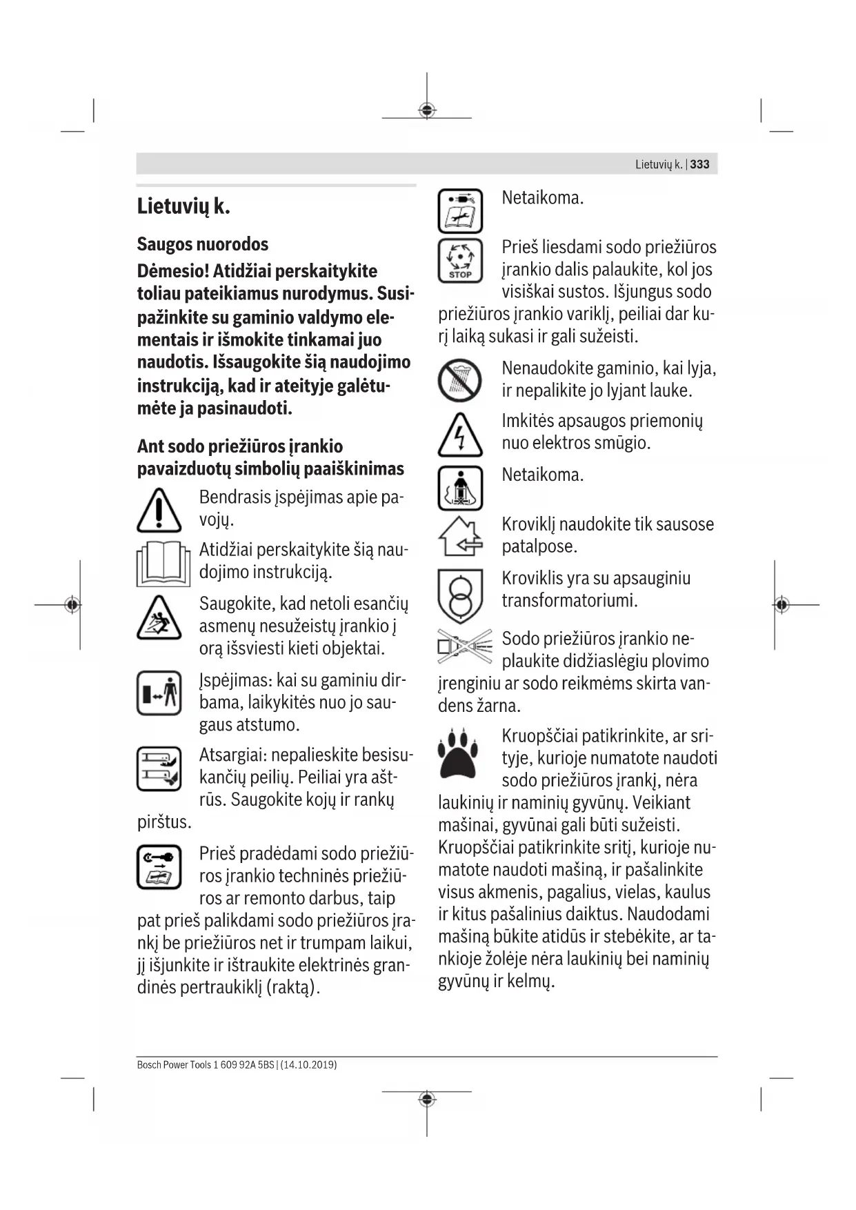 Pažeistas kištukinis lizdas, maitinimo laidas arba kroviklis Patikrinkite maitinimo įtampą, jei reikia, dėl kroviklio patikrinimo kreipkitės į autorizuotas Bosch elektrinių įrankių remonto dirbtuves Priežiūra ir servisas Akumuliatoriaus priežiūra u Dėmesio! Prieš pradėdami sodo priežiūros įrankio techninės priežiūros arba remonto darbus, jį išjunkite, ištraukite elektrinės grandinės pertraukiklį (raktą) ir išimkite akumuliatorių bei žolės surinkimo maišą. u Kai atliekate darbus aštrių peilių srityje, visada mūvė- kite sodininko pirštinėmis. Kad akumuliatorius būtų optimaliai naudojamas, laikykitės šių reikalavimų ir nurodymų: – Saugokite akumuliatorių nuo drėgmės ir vandens. – Sodo priežiūros įrankį laikykite nuo –20 °C ik 50 °C tem- peratūroje. Pvz., vasarą nepalikite akumuliatoriaus auto- mobilyje. – Akumuliatorių laikykite ne sodo priežiūros įrankyje, o išimtą atskirai. – Tiesiogiai šviečiant saulei, akumuliatoriaus sodo priežiū- ros įrankyje nepalikite. – Optimali akumuliatoriaus sandėliavimo temperatūra yra 5 °C. – Akumuliatoriaus ventiliacines angas valykite minkštu, šva- riu ir sausu teptuku. Jei veikimo laikas po įkrovimo pastebimai sutrumpėja, vadi- nasi akumuliatorius susidėvėjo ir jį reikia pakeisti. Klientų aptarnavimo skyrius ir konsultavimo tarnyba www.bosch-garden.com Ieškodami informacijos ir užsakydami atsargines dalis bū- tinai nurodykite 10-ženklį gaminio numerį, esantį firminėje lentelėje. Lietuva Bosch įrankių servisas Informacijos tarnyba: (037) 713350 ļrankių remontas: (037) 713352 Faksas: (037) 713354 El. paštas: service-pt@lv.bosch.com Transportavimas Kartu pateikiamų ličio jonų akumuliatorių gabenimui taiko- mos pavojingų krovinių gabenimą reglamentuojančių įstaty- mų nuostatos. Naudotojui akumuliatorius gabenti keliais lei- džiama be jokių apribojimų. Jei siunčiant pasitelkiami tretieji asmenys (pvz., oro transpo- rtas, ekspedijavimo įmonė), būtina atsižvelgti į pakuotei ir ženklinimui taikomus ypatingus reikalavimus. Būtina, kad rengiant siuntą dalyvautų pavojingų krovinių gabenimo spe- cialistas. Siųskite tik tokius akumuliatorius, kurių nepažeistas kor- pusas. Apklijuokite kontaktus ir supakuokite akumuliatorių taip, kad jis pakuotėje nejudėtų. Taip pat prašome laikytis ir nacionalinių teisės aktų. Šalinimas Sodo priežiūros įrankis, akumuliatoriai, papil- doma įranga ir pakuotės turi būti ekologiškai utilizuojami. Sodo priežiūros įrankių, akumuliatorių bei ba- terijų nemeskite į buitinių atliekų konteinerius! Tik ES šalims: Pagal Europos direktyvą 2012/19/ES, naudoti nebetinkami elektriniai ir elektroniniai įrankiai ir, pagal Europos direktyvą 2006/66/EB, pažeisti ir išeikvoti akumuliatoriai bei baterijos turi būti surenkami atskirai ir perdirbami aplinkai nekenks- mingu būdu. Akumuliatoriai ir baterijos Ličio jonų: Prašome laikytis skyriuje Transportavimas pateiktų nuorodų. Bosch Power Tools 1 609 92A 5BS | (14.10.2019)344 | يبرع