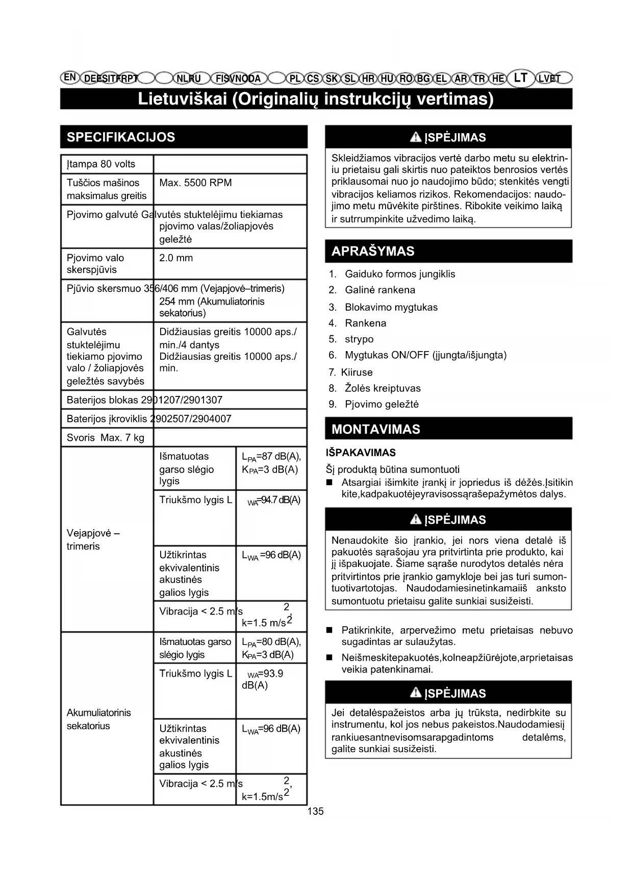 ĮSPĖJIMAS Nebandykite prietaiso modifikuoti ar kurti priedų, ku- rie nėra rekomenduojaminaudotisu šiuo produktu. Bet koks toks modifikavimas yra laikomas netinkamu naudojimu ir gali sukelti pavojingą situaciją, dėl ku- rios galima sunkiai susižaloti. ĮSPĖJIMAS Prijungdami dalis, visada atjunkite elektros maitinimo laidąnuouždegimožvakės.Šionurodymonesilaikymas gali privesti prie atsitiktinio prietaiso įsijungimo ir sukelti sunkių sužalojimų. ŽOLĖS KREIPTUVO MONTAVIMAS Žr. Pav. 2. ĮSPĖJIMAS Venkite kontakto su peiliu. Nesilaikant šio nurodymo, galima rimtai susižaloti. Apverskite nešiojamąją žoliapjovę, kad prieitumėte prie galvutės. Uždėkite apsaugą (b) ant žoliapjovės galvutės ir užstumkite apsaugą ant galvutės palei kreipiamąją liniją. Sulygiuokite skyles varžtams ant apsaugo su skylėmis varžtams ant nešiojamosios žoliapjovės galvutės. Įsukite varžtus į nešiojamosios žoliapjovės galvutę, taip pritvirtindami apsaugą. Uždėkite apsaugo dangtelį (c) ant apsaugo ir užstumkite apsaugo dangtelį ant apsaugo. Sulygiuokite skyles varžtams ant apsaugo dangtelio su skylėmis varžtams ant apsaugo. Įsukite varžtus į apsaugą, taip pritvirtindami apsaugo dangtelį. ĮSPĖJIMAS Net ir gerai žinodami savo prietaiso savybes, visada išlikite atidūs. Nepamirškite, pakanka tik akimirką trunkančio neatidumo, kad rimtai susižalotumėte. ĮSPĖJIMAS Visada apsaugokite akis. Nesilaikant šio nurodymo, išsviesti objektai gali rimtai sužaloti. ĮSPĖJIMAS Nenaudokite gamintojo nerekomenduojamų dalių ar priedų. Naudojant gamintojo nerekomenduojamas dalis ar priedus galima rimtai susižaloti. RANKENOS MONTAVIMAS Žr. Pav. 3. Atsukti centrinę rankenėlę 'A', nuimti gaubtelį 'B ' ir apatinį laikiklį 'C', atkreipiant dėmesį, kad nepasimestų į laikiklį įstatyta spyruoklė. Įvesti vairą į apatinį laikiklį ir įstatyti laikiklio kaištį 'D ' į vairo angą 'E'. Prikabinti gaubtelį 'B' prie apatinio laikiklio 'C' ir įstatyti visą bloką į atitinkamą ertmę ant transmisijos strypo. Vairą nukreipti į darbui patogiausią padėtį ir užblokuoti rankenėle 'A'. VEIKIMAS Laikykite įrenginį, dešiniąja ranka paėmę už paleidiklio rankenos, o kairiąja ranka paėmę už kairiosios ran- kenos. Prietaisui veikiant, jį tvirtai abejomis rankomis laikykite. Krūmapjovę laikykite patogioje pozicijoje, užpakalinei rankenai esant klubų aukštyje. Motorizuotą galvutę visada paleiskite pilnu pajėgumu. Jei aplink prailginimo strypą apsivytų pjaunamos medžiagos likučių,ATLEISKITE GAIDUKO FORMOS MYGTUKĄ ir juos pašalinkite. Darbo metu naudokite diržą. BATERIJOS BLOKO MONATVIMAS Žr. Pav. 4. Baterijos bloką įdėkite į krūmapjovę. Sulygiuokite ant baterijos bloko esančią pakeltą iškyšą su krūmapjovės baterijos skyriuje esančiomis kilpomis. Prieš pradėdami naudoti prietaisą, užsitikrinkite, kad baterijos apačioje esantys fiksavimo liežuvėliai užsifiksavo teisingai ir baterija krūmapjovėje yra teisingai įtvirtinta. BATERIJOS PAKETOIŠĖMIMAS Žr. Pav. 4. Atleiskite jungiklio paleidiklį ir fiksavimo paleidiklį, kad nešiojamoji žoliapjovė nustotų veikti. Paspauskite maitinimo mygtuką, kad išjungtumėte nešiojamąją žoliapjovę. Nuspauskiteir laikykite akumuliatoriausfiksatorių, esantį jo apačioje. Išimkite žoliapjovės akumuliatorių.Lietuviškai (Originalių instrukcijų vertimas)