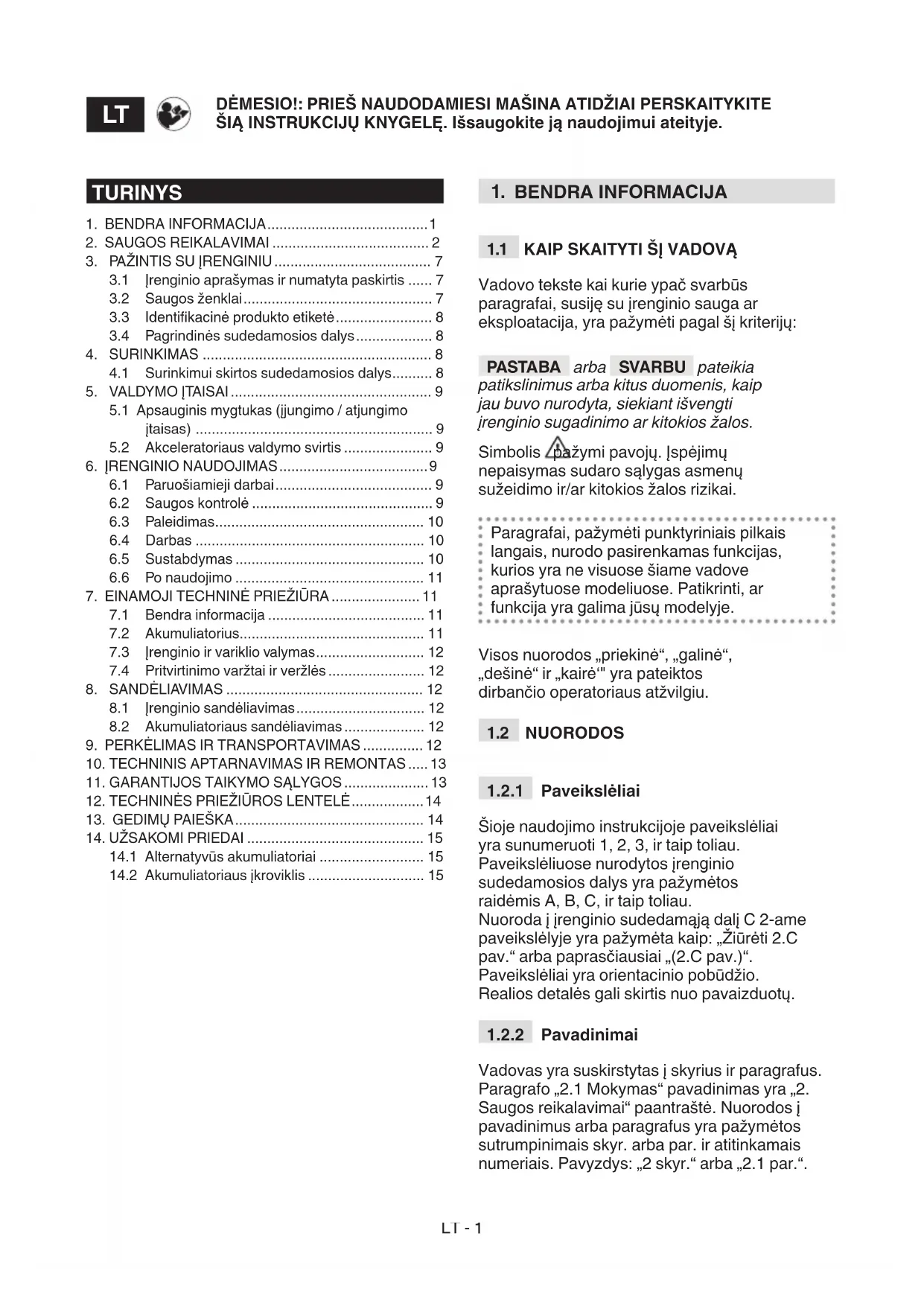 Vadovas yra suskirstytas į skyrius ir paragrafus. Paragrafo „2.1 Mokymas“ pavadinimas yra „2. Saugos reikalavimai“ paantraštė. Nuorodos į pavadinimus arba paragrafus yra pažymėtos sutrumpinimais skyr. arba par. ir atitinkamais numeriais. Pavyzdys: „2 skyr.“ arba „2.1 par.“. TURINYS