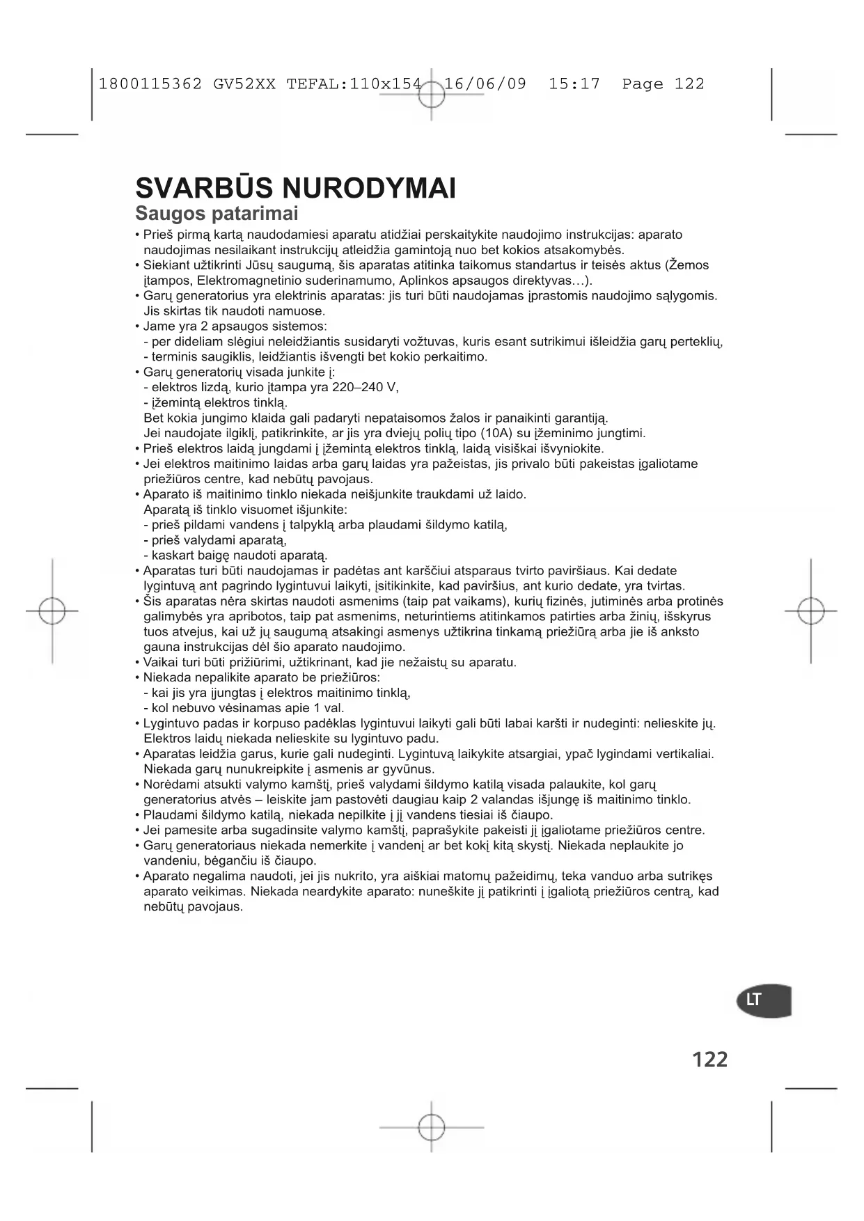 - Norėdami geriau išplauti katiliuką, procesą pakartokite. Iškilo problemų? Problemos Galimos priežastys Sprendimai Neužsidega garų generatoriaus signalas arba lygintuvo šviesossignalas. Nura aparatui reikiamos įtampos. Patikrinkite, ar aparatas gerai įjungtas į vei- kiantį elektros lizdą ir yra jam reikalinga įtampa.Vanduo teka per pado skylutes. Neteisingai nustatytas termosta- tas: temperatūra per žema. Kreipkitus į įgaliotą priežiūros centrą. Naudojate garus, kai lygintuvas nura pakankamai įkaitęs. Patikrinkite, kaip nustatytas termostatas. Prieš įjungdami garų valdymo mygtuką pa- laukite, kol lygintuvo šviesos signalas užges. Vamzdeliuose susikondensavo van-duo, nes garus naudojate pirmą kartą arba kurį laiką jų nenaudojote. Garų valdymo mygtuką spauskite lygintuvą laikydami toliau nuo lyginimo stalo, kol iš ly-gintuvo pradus eiti garai.Niekadaneatsukitegarų kati-liuko dangte- io, kol einagarai.Jeigu jūsų vanduo yrakietas, garų katiliukąskalaukite dažniau.Skalaudami niekadanenaudokite priemoniųkalkių nuosėdoms valyti,nes tai gali pakenktiprietaisui.Niekada nedėkite lygintuvo antmetalinės dangos, nes tai gali jįsugadinti. Lygintuvą dėkite antgeneratoriaus paviršiujeesančio lygintuvo padėklo suneslystančiu ir aukštaitemperatūrai atspariupaviršiumi. 1800115362 GV52XX TEFAL:110x154 16/06/09 15:17 Page 125126 Jei negalima nustatyti gedimo priežasties, kreipkitės į centrą, įgaliotą atlikti priežiūrą po pardavimo. Prisidėkime prie aplinkos apsaugos!